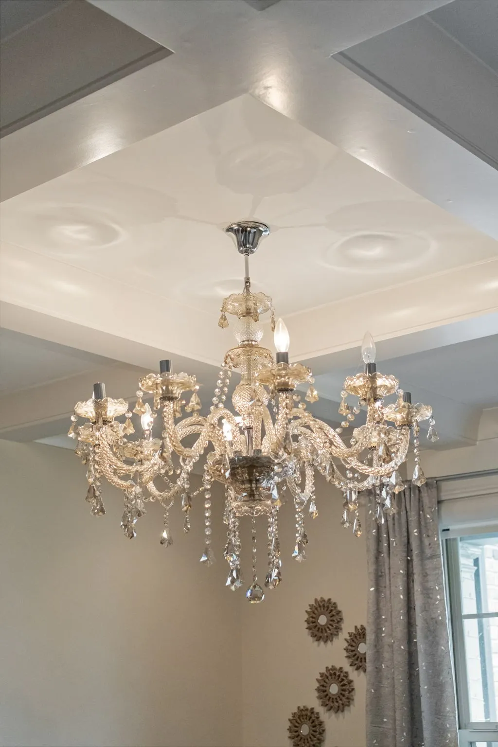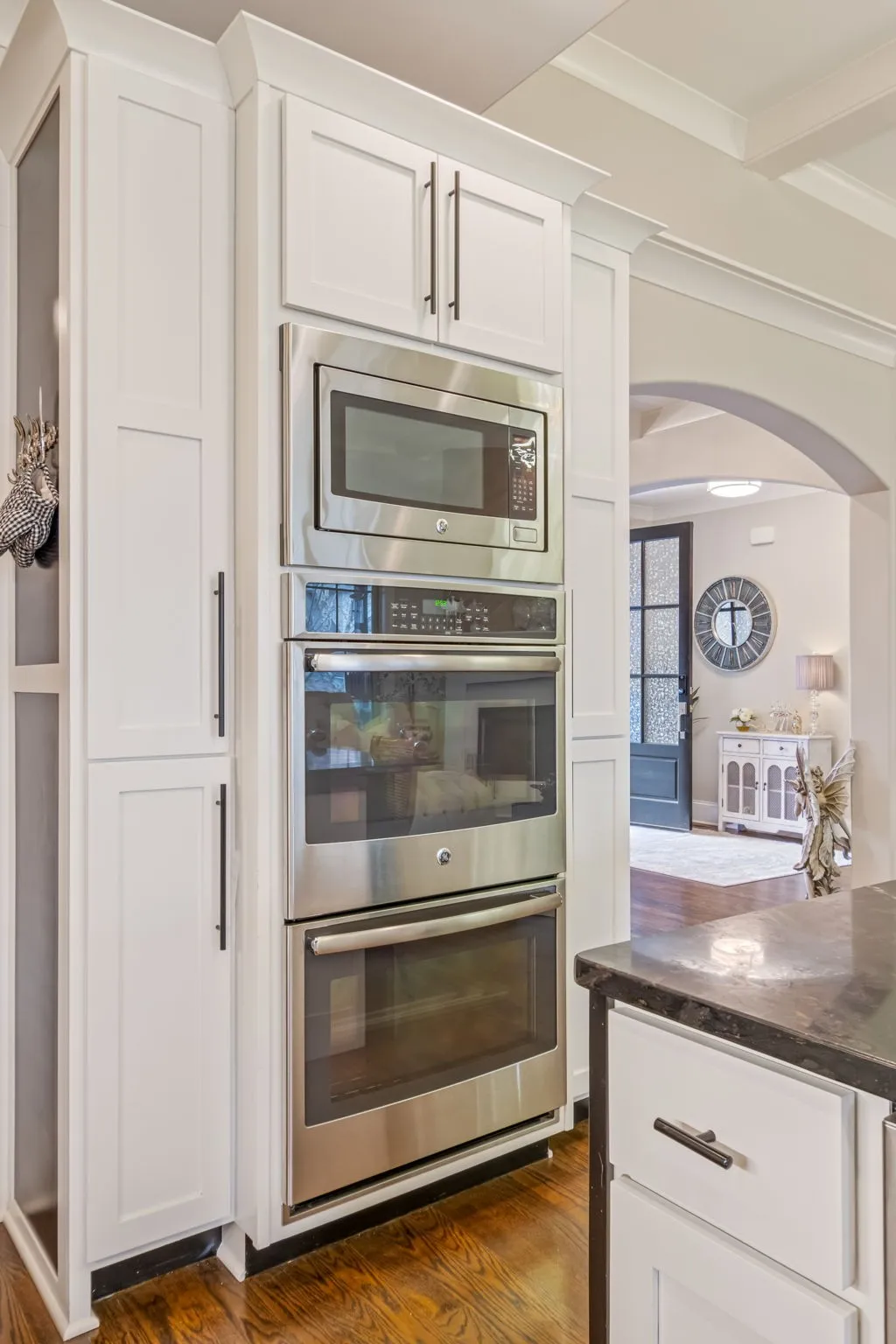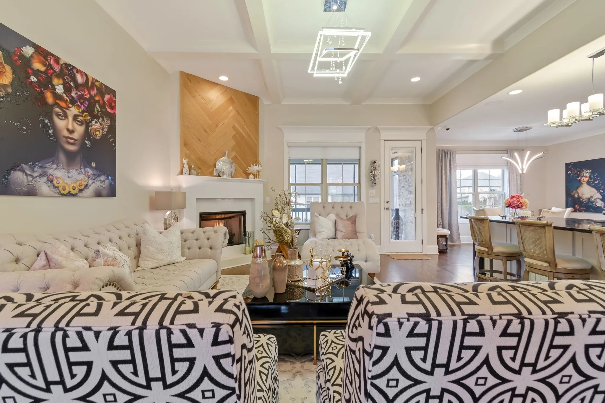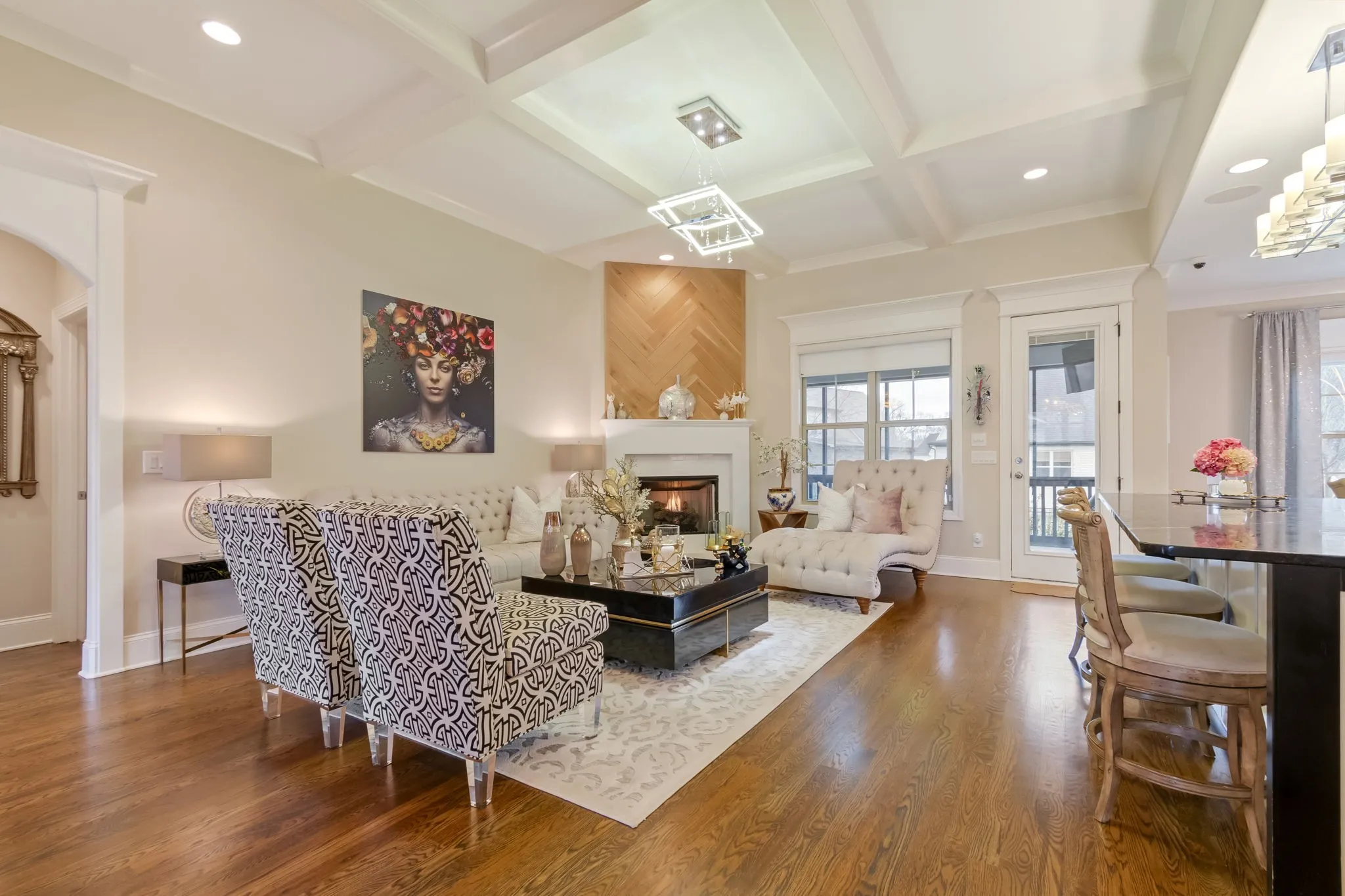 Beautiful brick and stone home in Spring Hill with an open, light-filled layout featuring hardwood floors, coffered ceilings, and thoughtful architectural details. The living room with fireplace and custom wood accent wall flows into the kitchen with white cabinetry, stainless steel appliances, a custom vent hood, and a large island perfect for gathering.