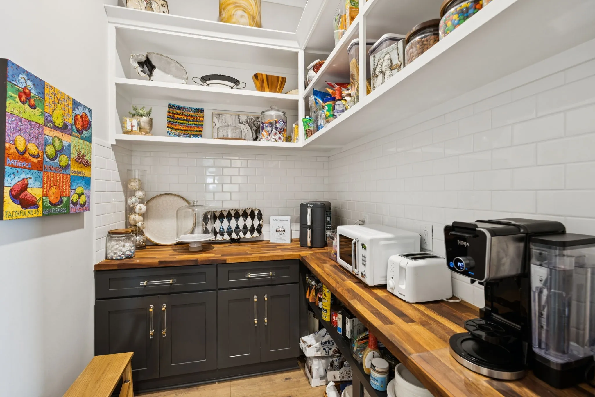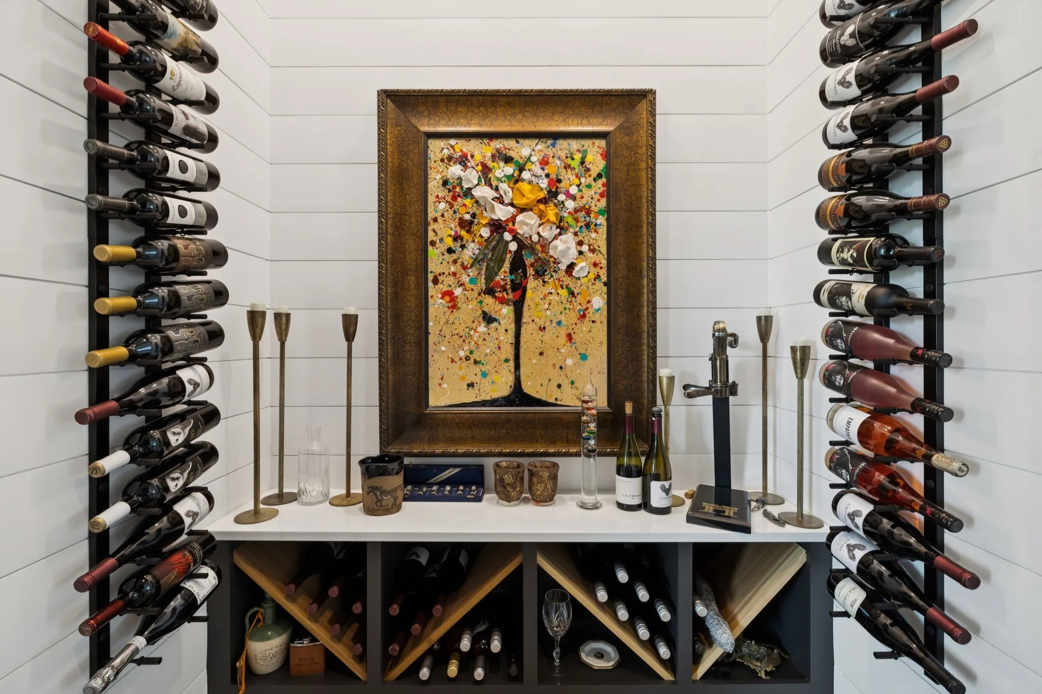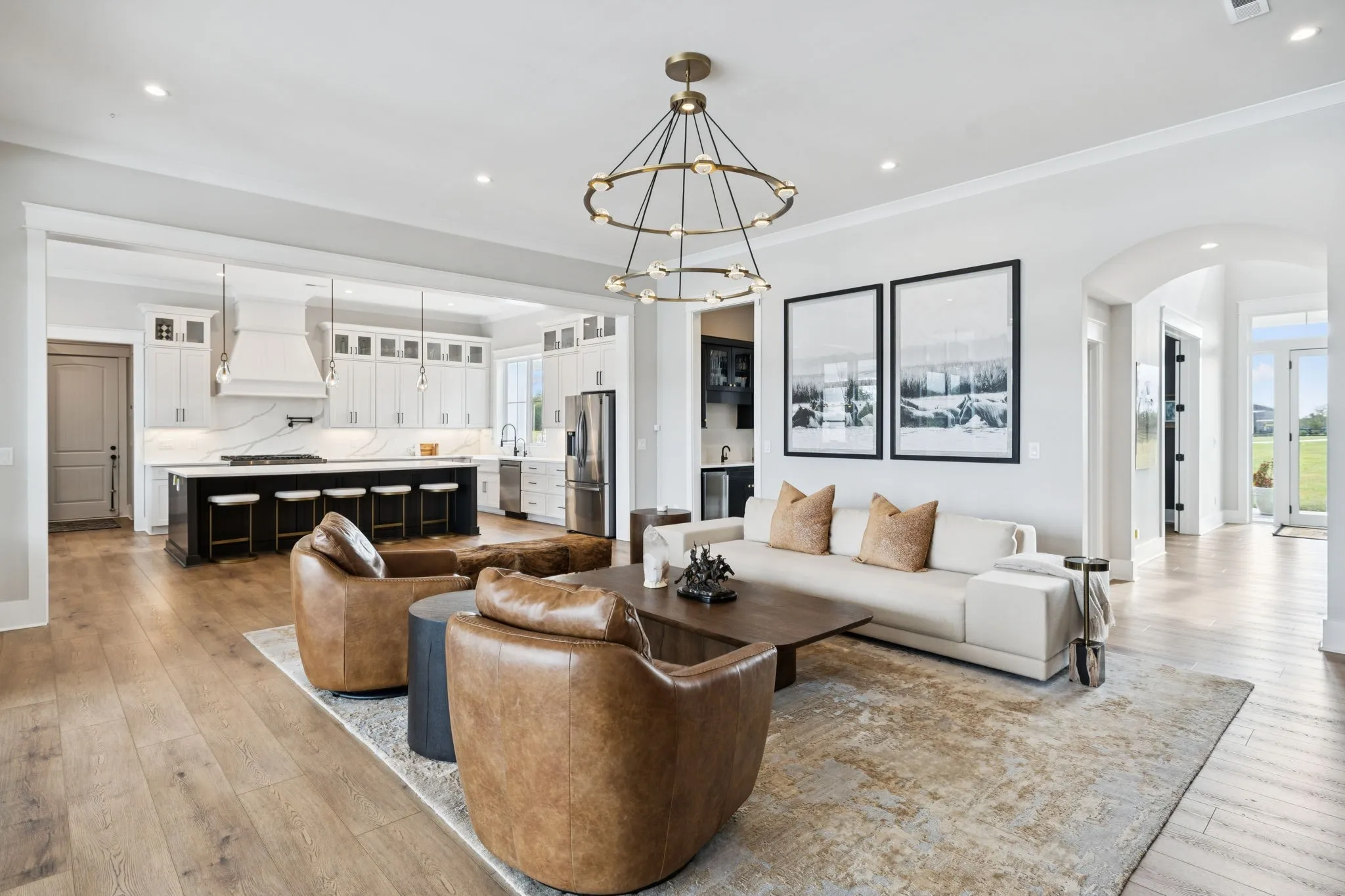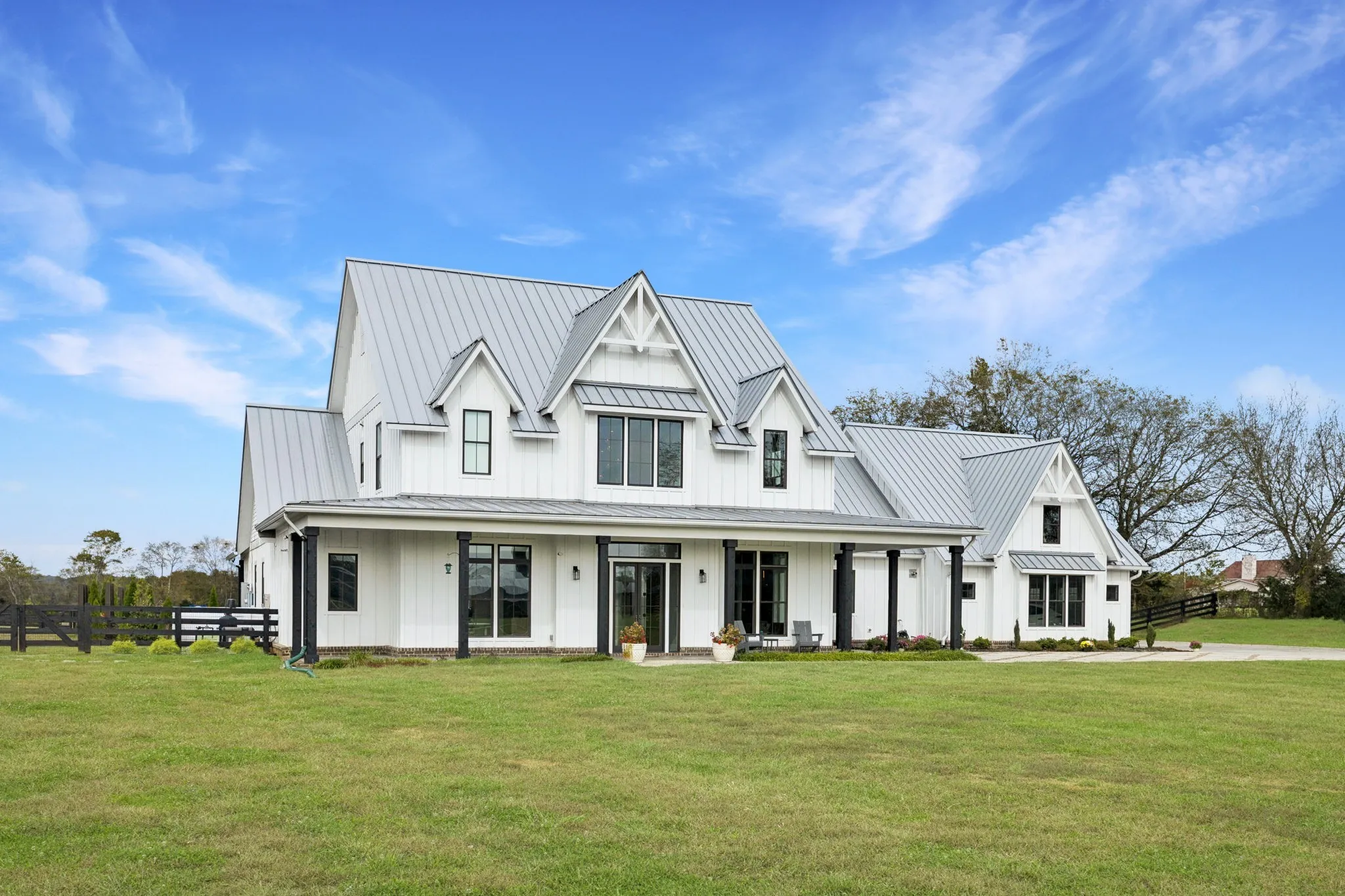 The main farmhouse showcases soaring ceilings, designer finishes, and abundant natural light throughout, along with a glass-enclosed wine cellar, spacious primary suite with dual walk-in closets, and exceptional storage. Thoughtfully equipped with modern comforts, the home includes a smart-controlled gated entry, storm shelter, tankless water heater, whole-home generator, three HVAC systems, and water filtration with reverse osmosis. 1,000 sq ft unfinished space above the garage, ideal for conversion into a bonus