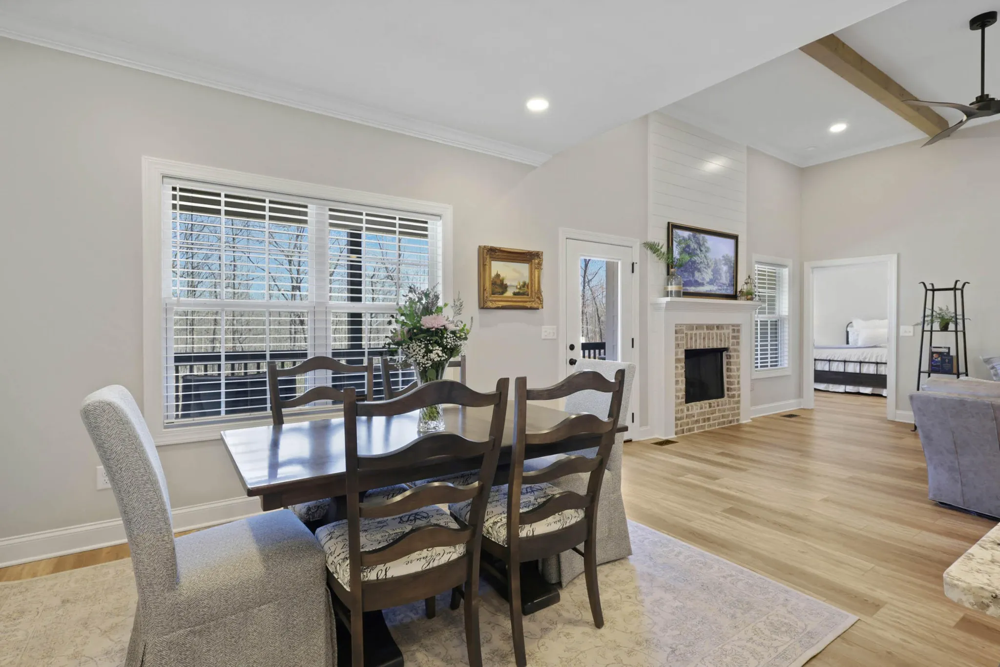 Step through the front door and feel the care woven into every detail — a bright, welcoming space where daily life feels effortless and every corner holds a sense of home. A guest bedroom and full bath at the front of the home offers a private getaway for visitors or a quiet main-level office. Vaulted ceilings and a brick fireplace grace the living room, creating a space where mornings are bright and evenings glow with warmth. The sun-filled kitchen is the heart of the home — perfect for whipping up treasured family recipes, gathering with the ones you love, or simply savoring a cup of coffee while sunlight spills across the counters. The large pantry lets your organization dreams run wild, while the oversized laundry room adds ease and just a little bit of magic to your daily chores.