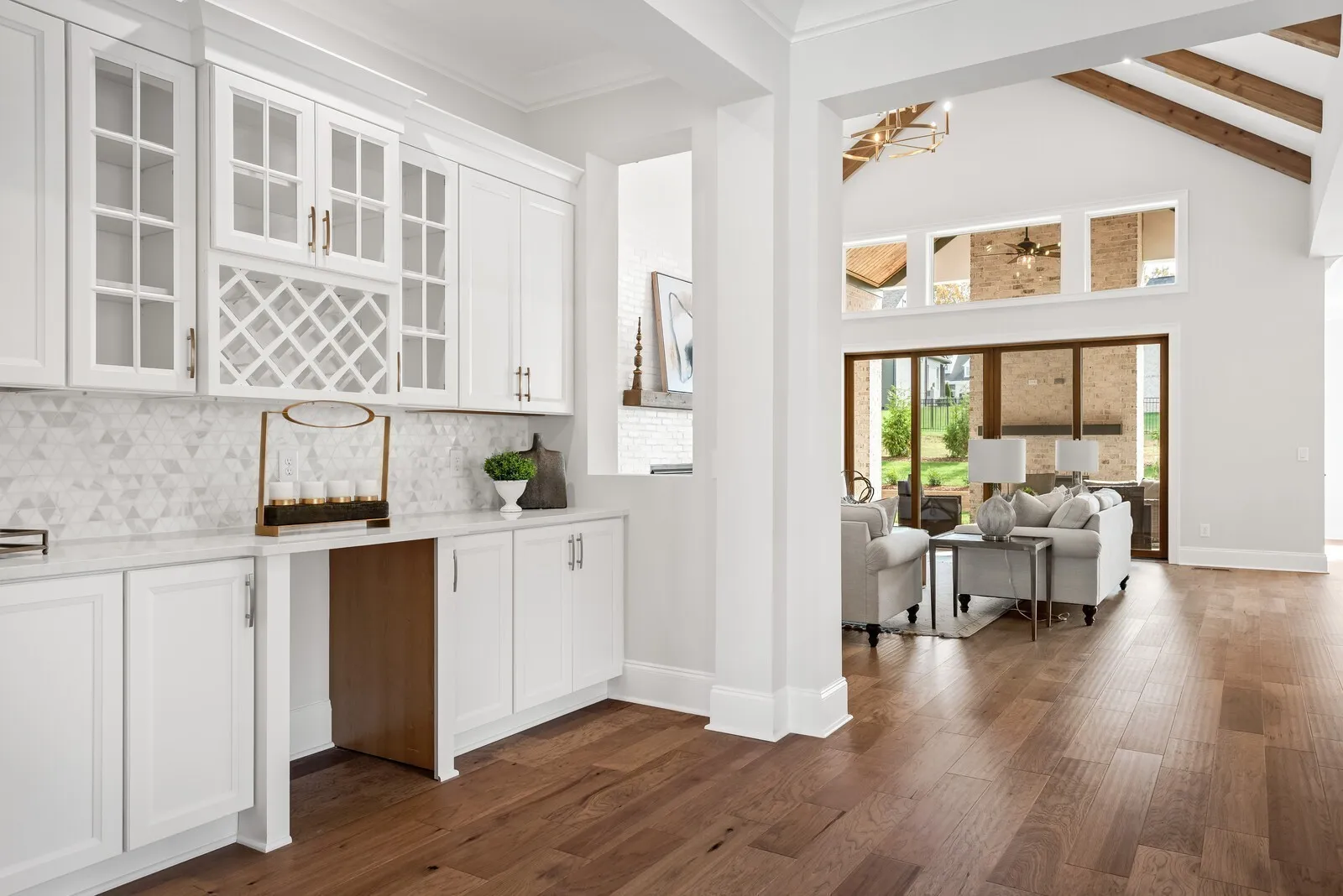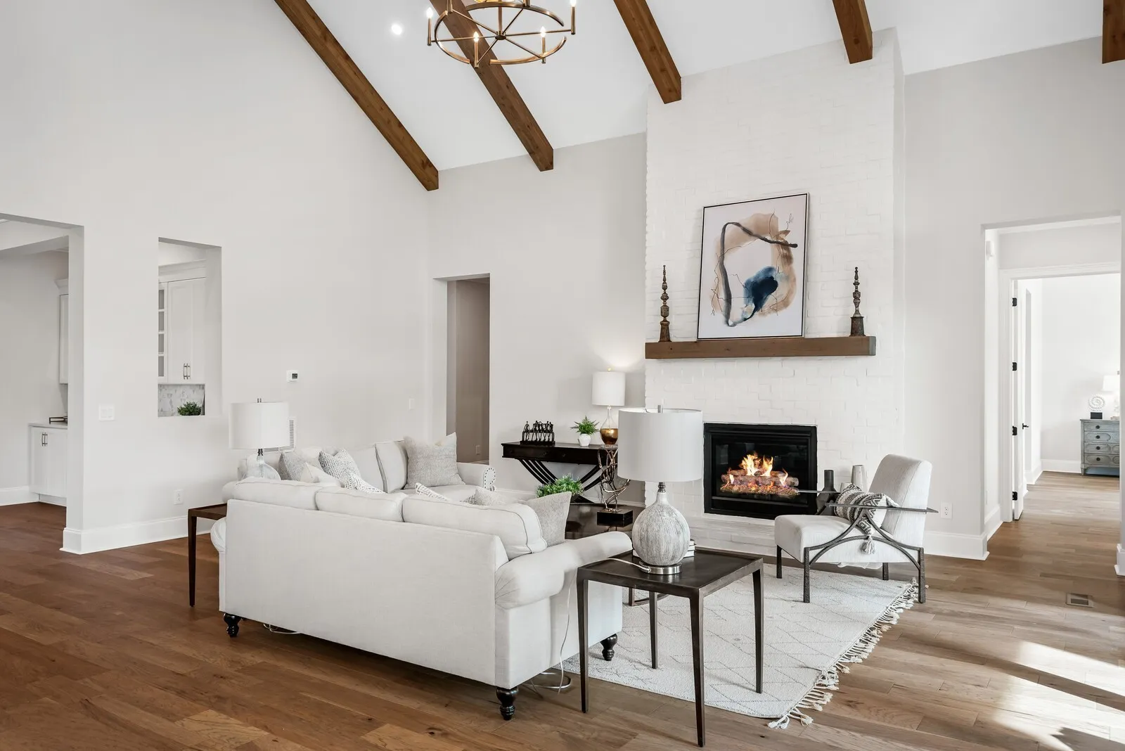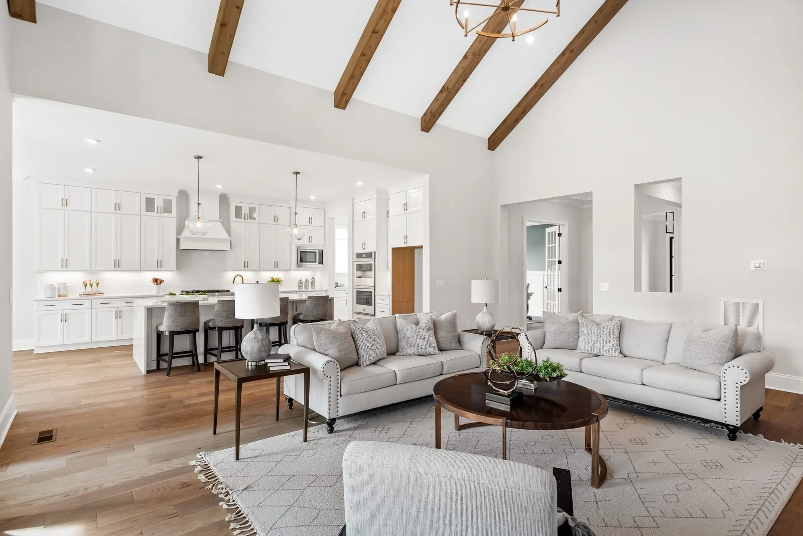 The ELMSLEY is a stunning 5 bedroom, 5.5 bath ranch and a half, offering exceptional living spaces and luxurious finishes throughout. Set on a sprawling acre homesite, this property combines elegance, comfort, and modern design in a highly desirable neighborhood. As you enter the grand foyer, you’ll be immediately captivated by the soaring ceilings and open flow of the home. The vaulted great room is the perfect gathering space, with large windows that flood the room with natural light while offering views of the expansive backyard.