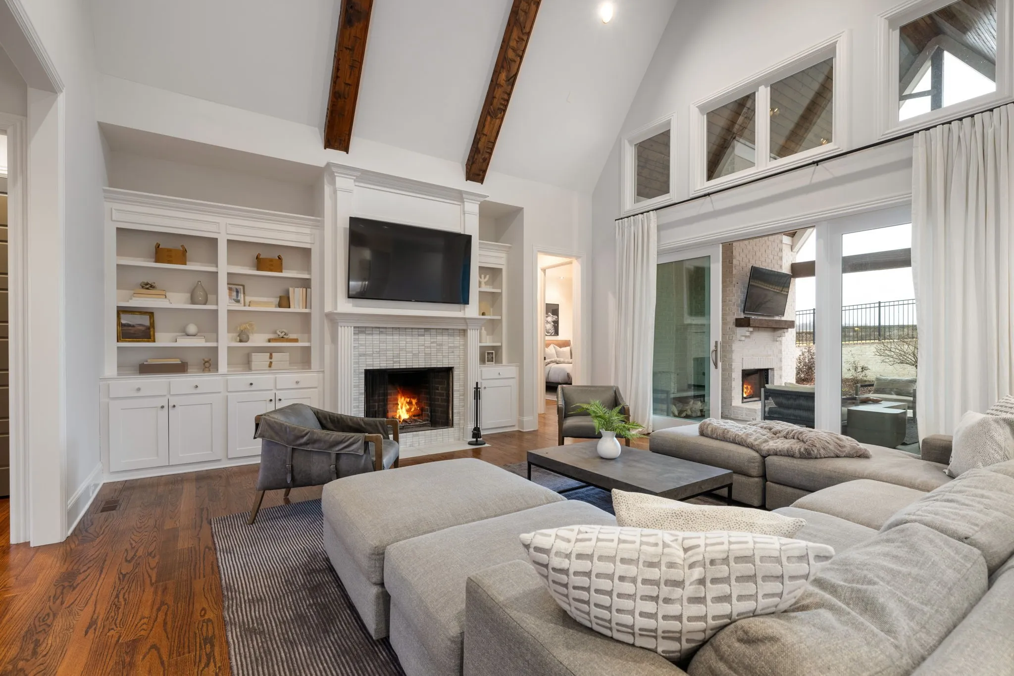 Located just 30 miles south of Nashville within the exclusive Troubadour Golf & Field Club, this stunning brick estate offers the perfect balance of relaxed luxury, active living, and refined comfort. Enjoy sweeping views of the 9th hole, iconic silos, and Tennessee’s rolling hills right from your front porch. Inside, a vaulted living room with a wood-burning fireplace, custom built-ins, and abundant natural light creates a warm and inviting atmosphere. Hardwoods span the main level, leading to a beautifully appointed kitchen featuring an oversized island, granite countertops, Monogram appliances, GE wall oven and microwave, and a beverage center connecting to the formal dining room—ideal for entertaining. The main-level primary retreat offers privacy and ease, with an additional guest suite on the first floor. Upstairs, two spacious bedrooms with en suite baths and walk-in closets are joined by a rec room and powder bath, providing flexibility. Outdoor living shines with a vaulted covered back porch, wood-burning fireplace, and a fully equipped outdoor kitchen with stacked stone masonry, built-in stainless gas grill, and generous patio space. Room remains for a future pool or putting green. Community amenities are unmatched: an 18-hole Tom Fazio golf course, TrackMan range, tennis and pickleball courts, resort-style pools, and a new clubhouse. The 210-acre Farmstead offers fishing, archery, horseback riding, go-karts, kayaking, paddle boarding, and frisbee golf. Residents also enjoy farm-to-table dining, a hidden speakeasy, men’s lounge, cigar lounge, wine room, fitness center, yoga studio, spa services, recording studio, outdoor amphitheater, and a stargazing observatory. With 24/7 security, concierge services, and $100K revenue in rental income, this home presents an exceptional lifestyle and investment opportunity. Offered at a price that reflects exceptional value w/in this community, this is a rare opportunity to own at an advantageous entry point.