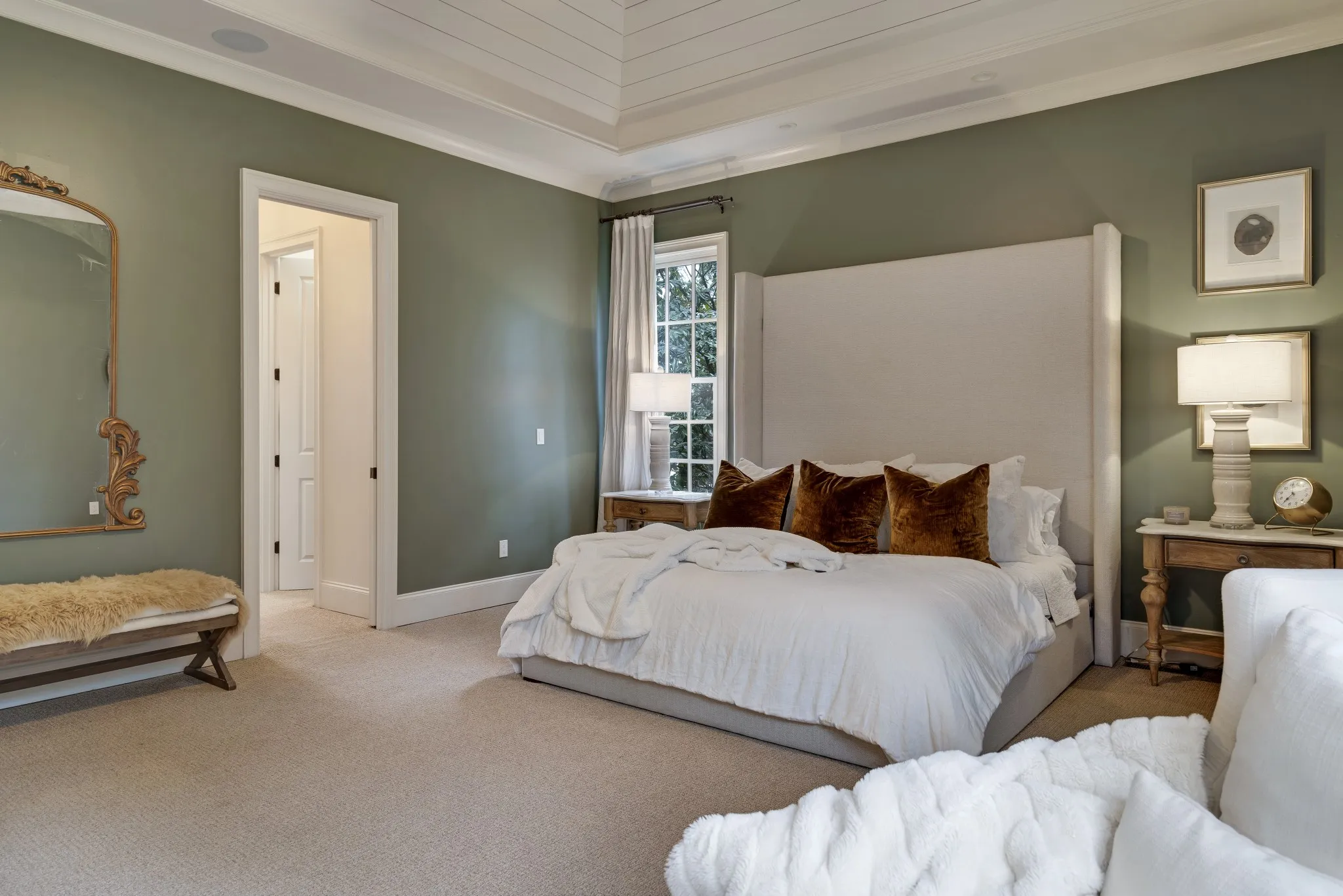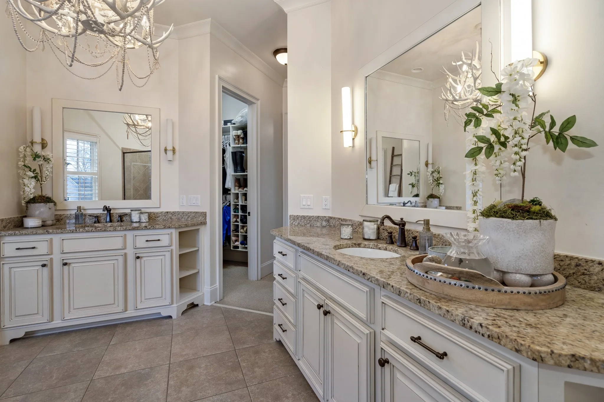 The spacious kitchen is designed for both beauty and function, featuring a five-burner gas range, butcher block island, and entertainer’s bar with beverage and wine refrigerators.