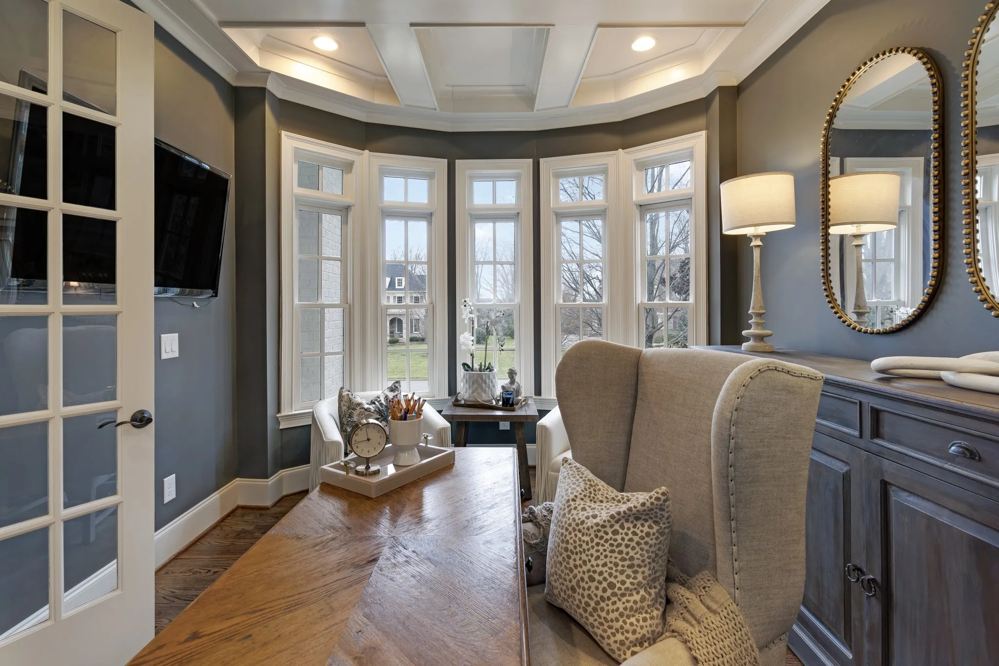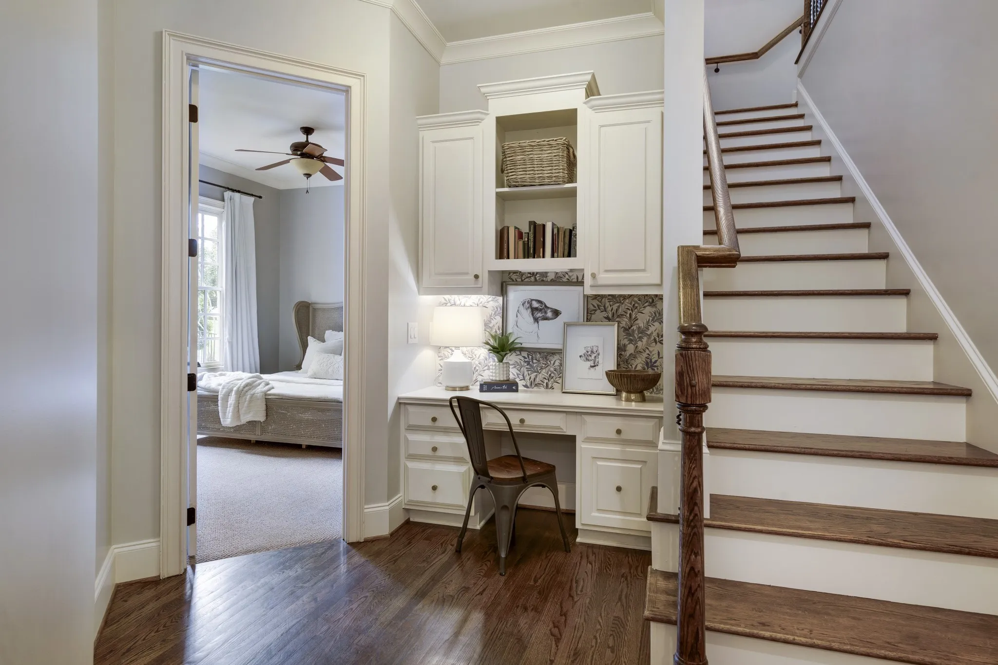 Additional improvements include renovated upstairs baths, new washer and dryer (2023), all toilets replaced (2024), fresh white exterior paint (2024), custom drapery, built-in storage in the primary suite, utility sinks in the laundry and garage, and optional inclusion of mounted TVs.