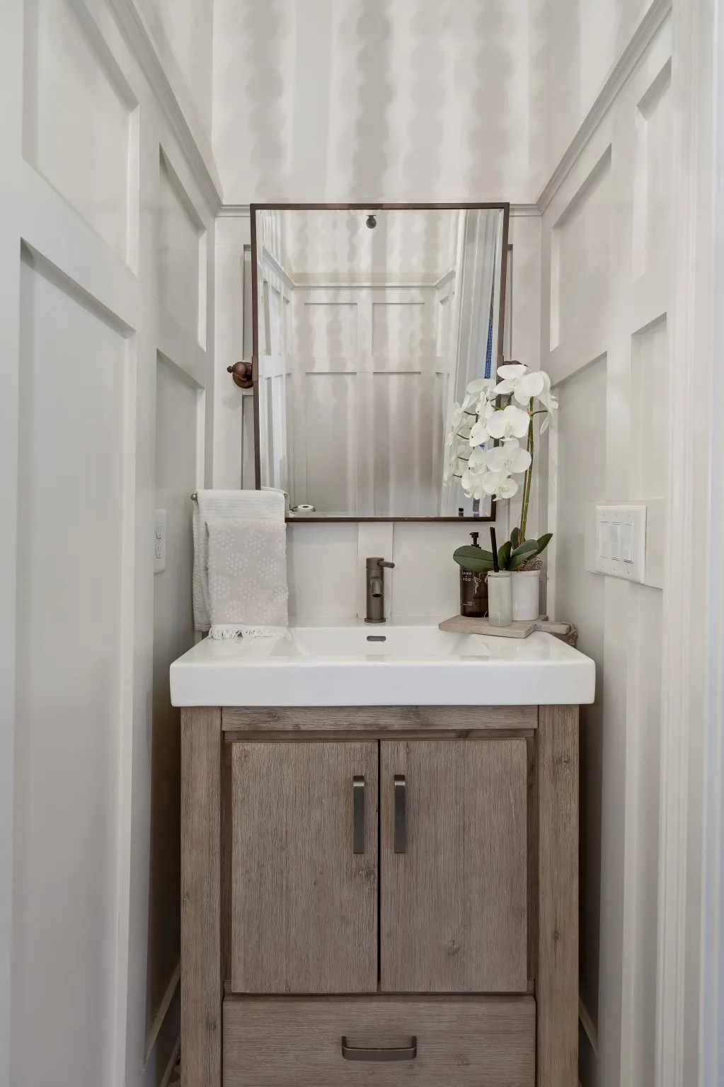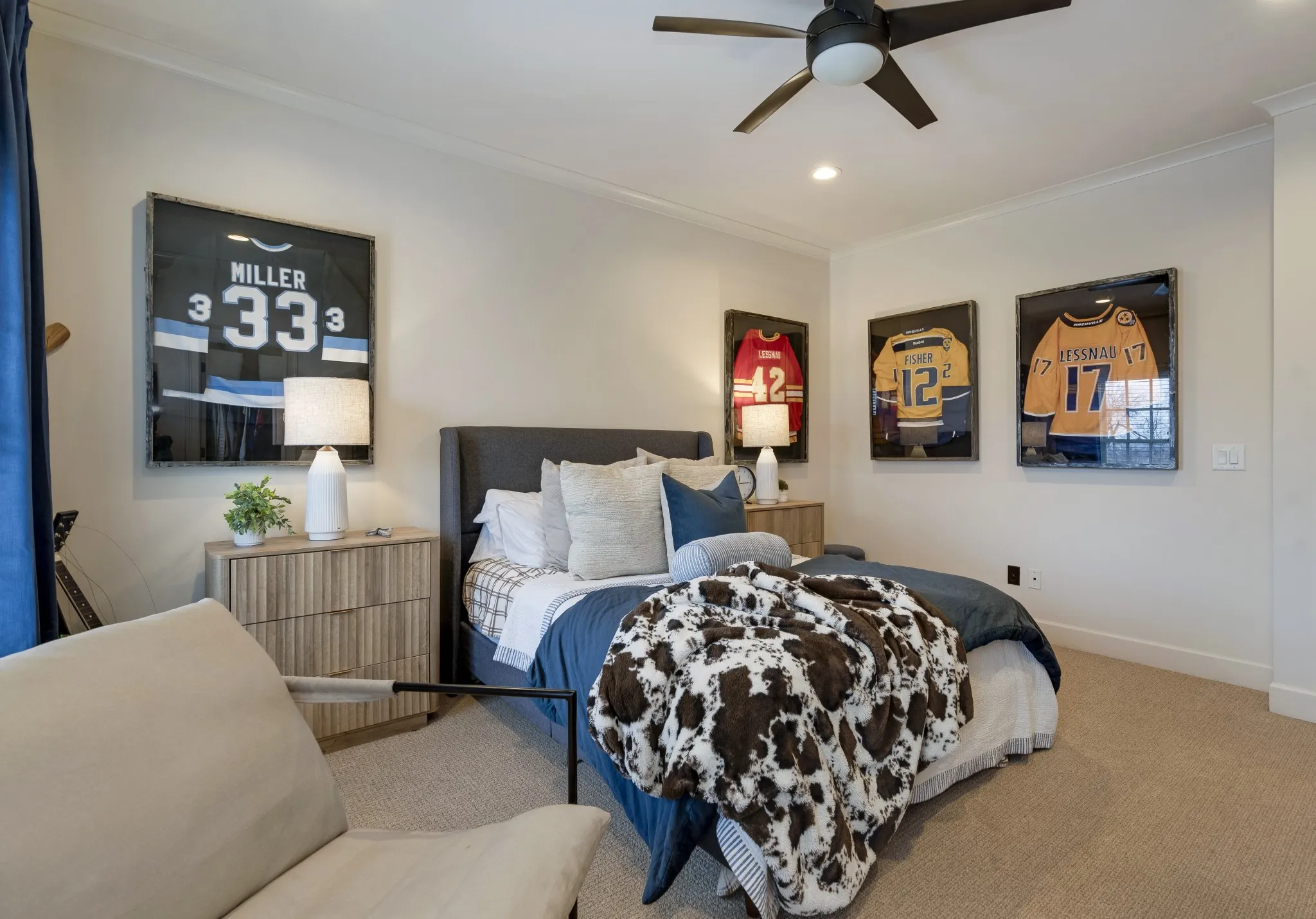 Inside, sophisticated upgrades elevate every room. The media room showcases a striking wood accent wall and an impressive 85” TV that remains with the home. Built-in surround sound flows throughout the interior and backyard, complemented by a fully integrated Google Home system. Designer lighting, custom wallpaper in the dining and laundry rooms, and elegant finishes add style and character throughout.