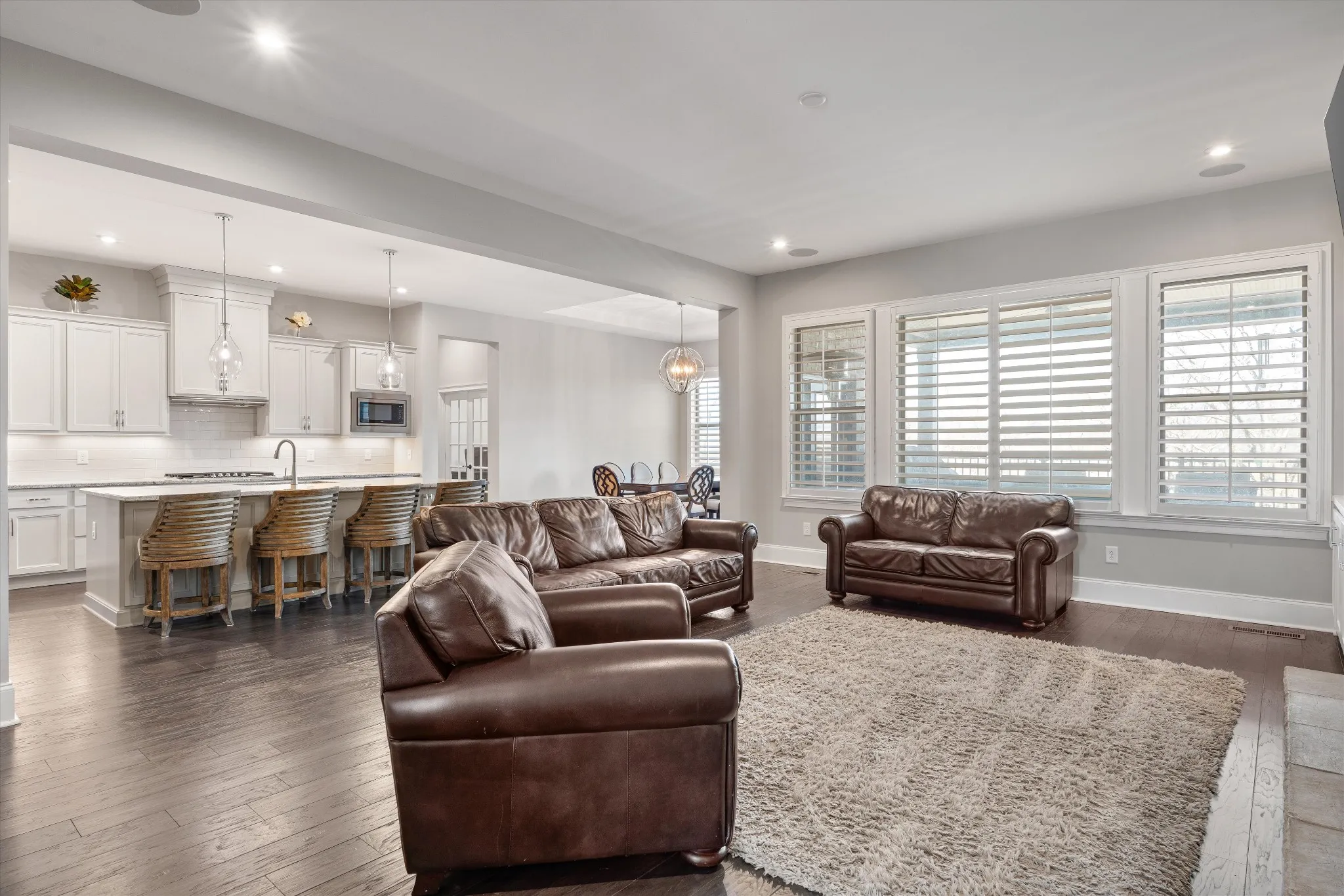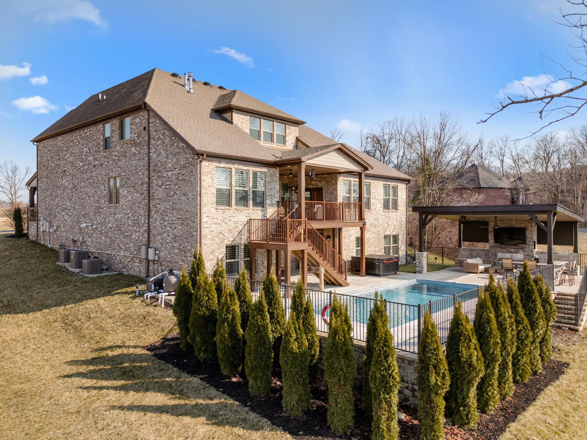 Welcome to this luxury custom built estate located in the prestigious golf community of The Club at Five Oaks. This exceptional 6 bedroom home features ensuite baths in all bedrooms with an additional half bathroom on the main level. This home offers comfort, functionality, and privacy for family and guests. The main level showcases a thoughtfully designed layout including a large private office with elegant glass french doors, an inviting family room with a stacked stone gas fireplace, along with the primary suite featuring a large spa like ensuite bathroom and the massive owners closet. An additional main level bedroom with ensuite provides ideal accommodations for guests or multi-generational living. The chef’s kitchen is designed for entertaining with double ovens, gas range, large bar island, generous size pantry, and ample workspace flowing seamlessly into the main living areas. The dining room opens to a large covered trex patio overlooking the lake and greens. Along with guests bedrooms and ensuites, the upstairs offers a large bonus room ideal for entertainment or recreation as well as additional unfinished space for more storage. The finished lower level of the home offers a complete in-law or guest suite, a large full size secondary kitchen, exercise room, two large living spaces, and includes one of the six bedrooms and baths on this level. The home also features an additional 700 unfinished sq ft of full storage space on this lower level. Next, step outside to your private backyard oasis, complete with a heated saltwater in-ground pool, personal 4 hole putting green, outdoor stone covered area with an outdoor kitchen, bar, remote blinds, and seating area with a TV for entertainment and ceiling heaters for your comfort in cooler months. This home is perfectly positioned along by the 2nd tee box, offering beautiful golf course and lake views and access to private club amenities with available golf and social packages. This home is your resort.