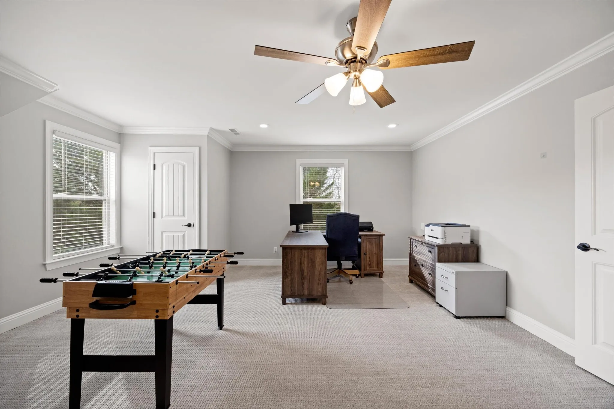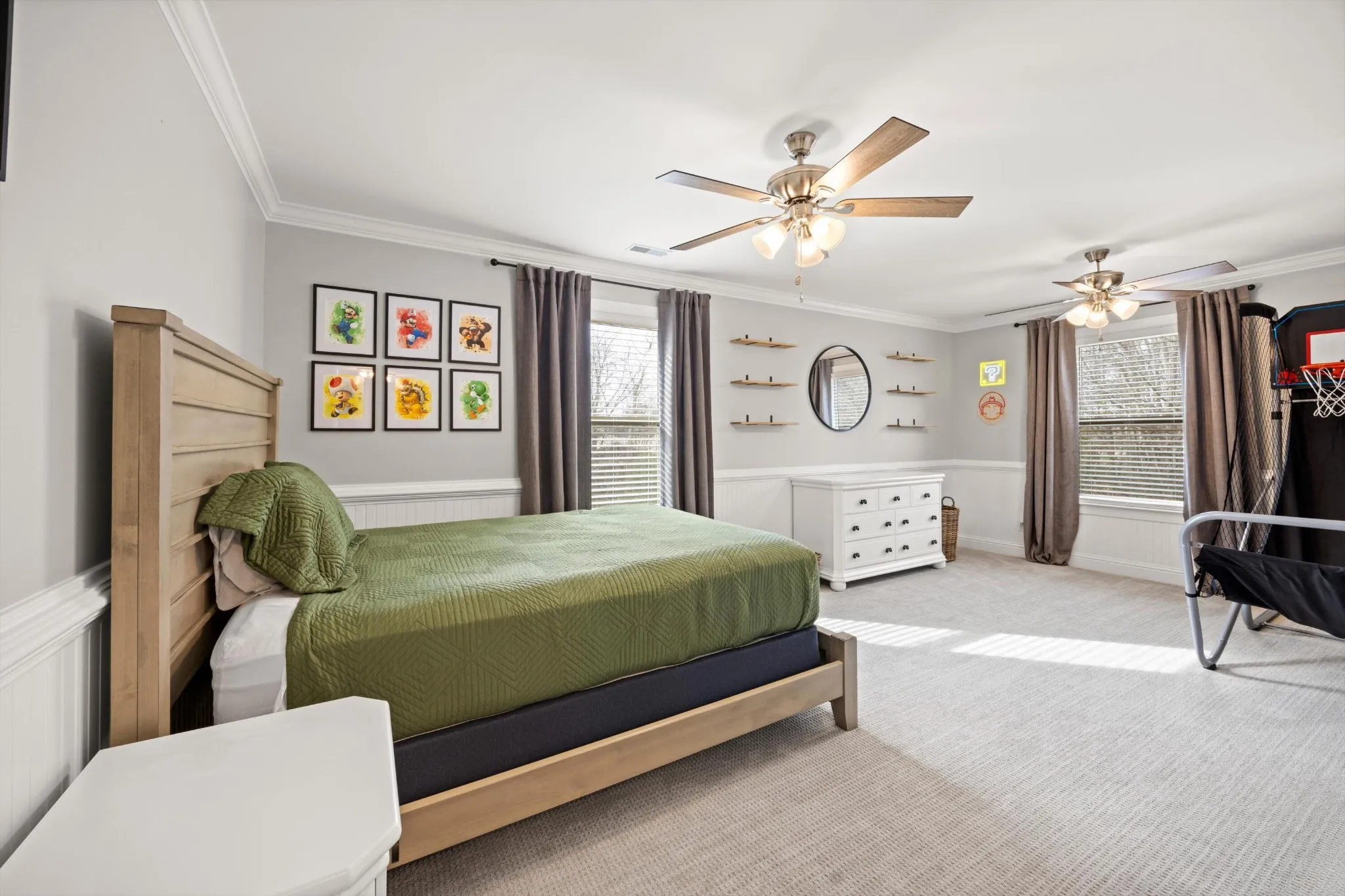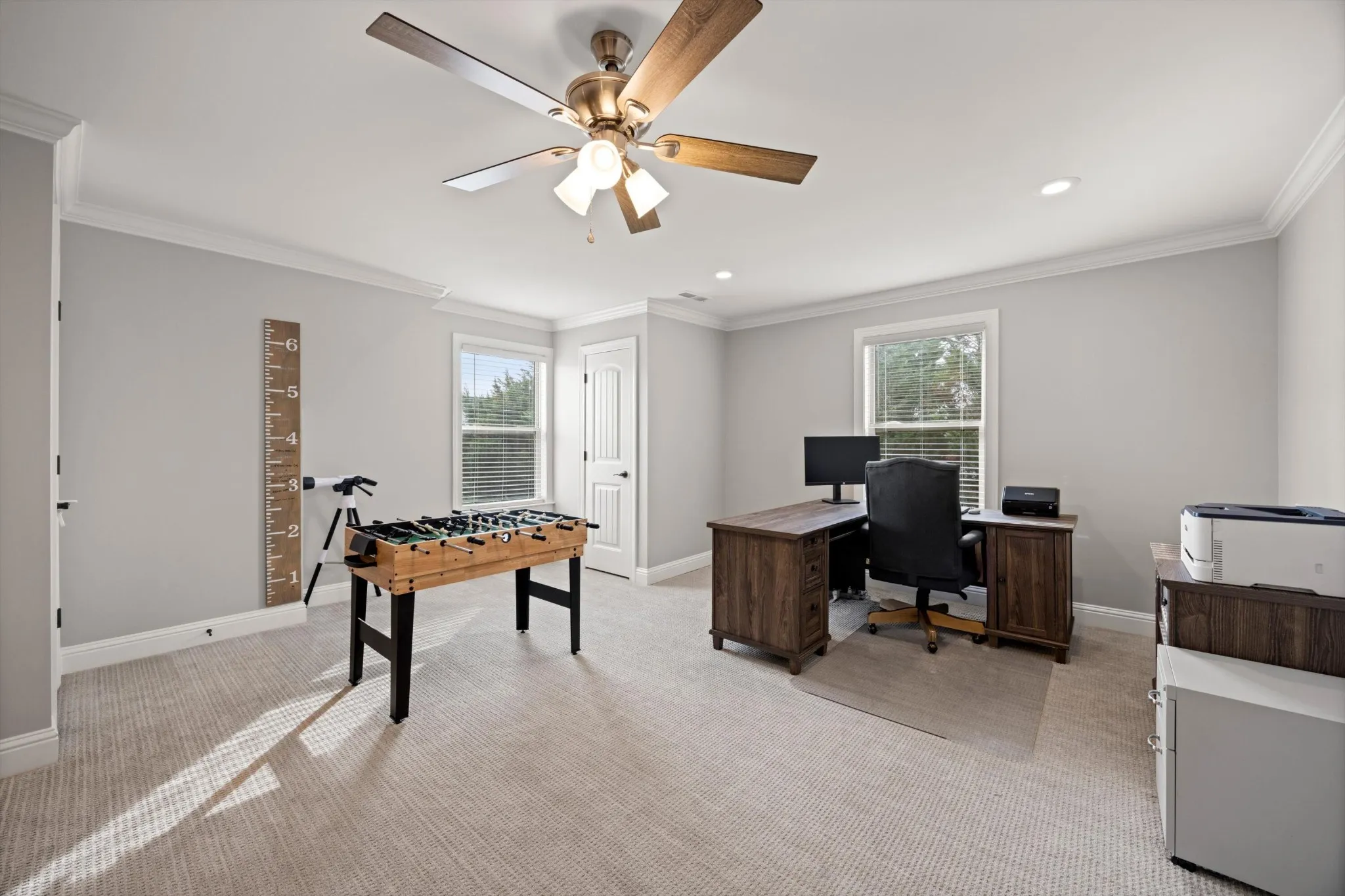 The primary suite is a true retreat, featuring an eye catching coffered ceiling, spacious walk in closet, and a spa inspired en suite bath complete with a soaking tub and separate shower. Three additional bedrooms offer flexibility for guests, home offices, or play space.