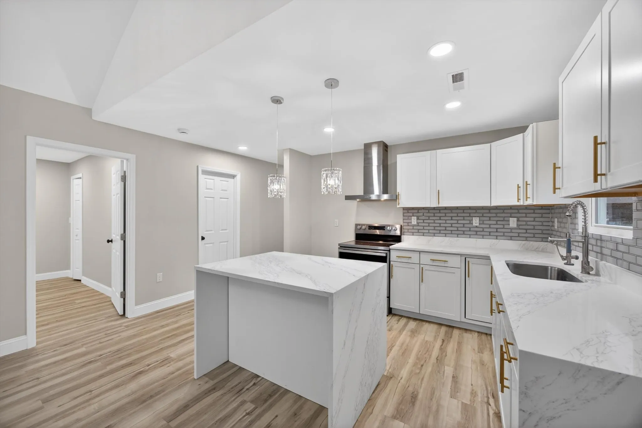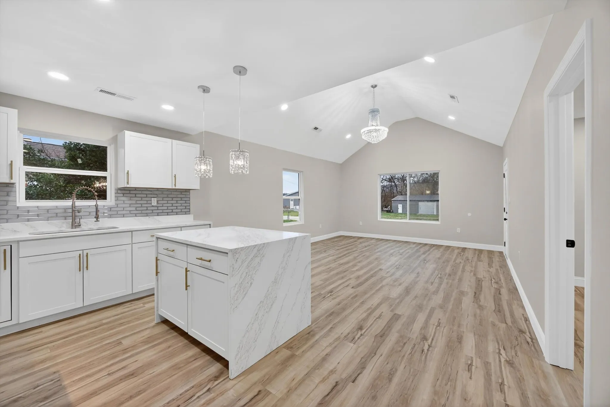 The spacious living room impresses with soaring vaulted ceilings and brand new LVP flooring that flows beautifully throughout the home. The open floorplan creates the perfect space for entertaining and everyday living. The eat in kitchen shines with gorgeous stone countertops, updated cabinetry, and stunning chandeliers that add warmth and character.