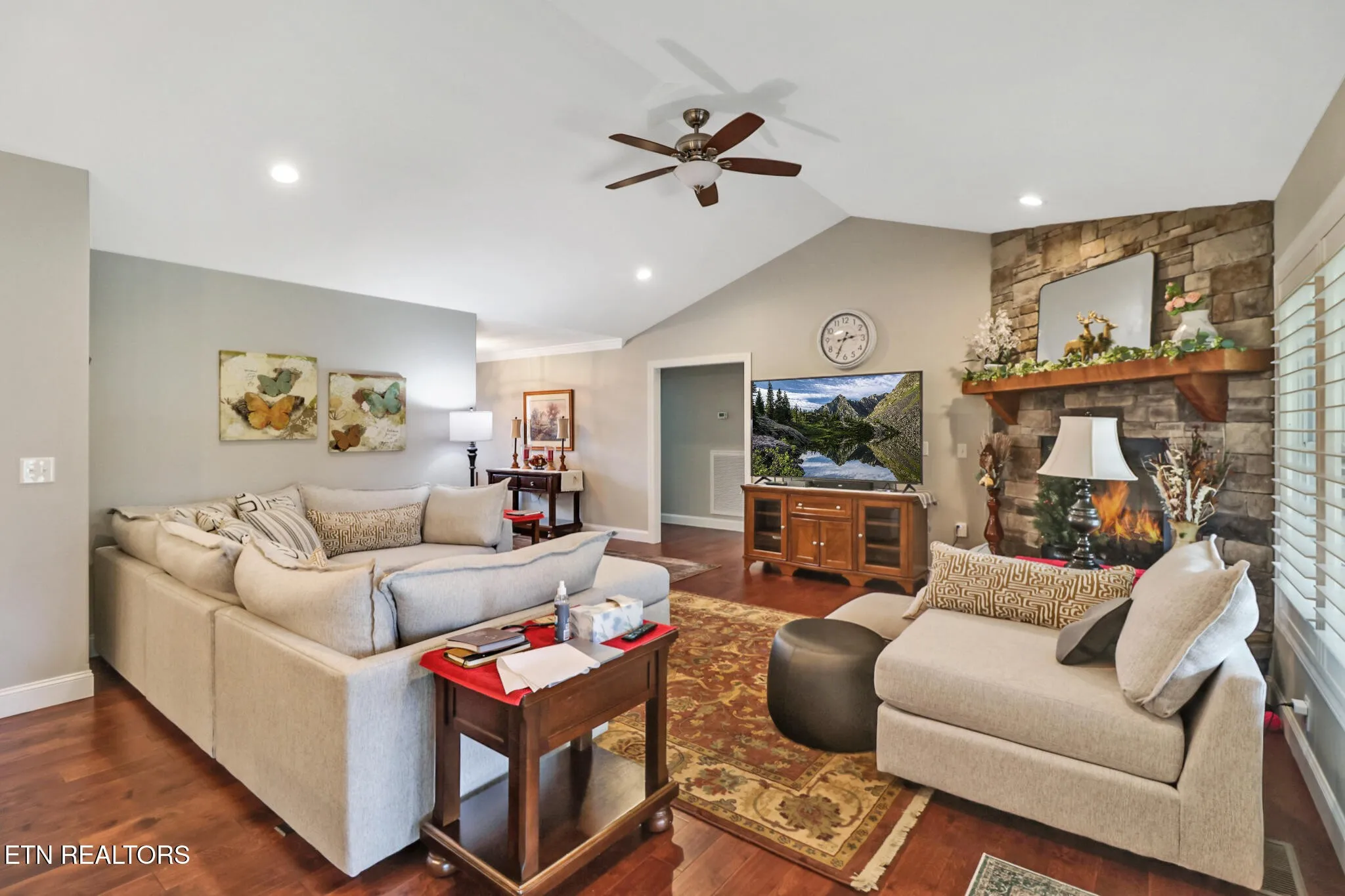 The open-concept kitchen and great room feature vaulted ceilings, a beautiful stone fireplace with gas logs, white shaker cabinetry, quartzite countertops, Maytag stainless steel appliances, two oversized pantries, and a spacious breakfast area.
