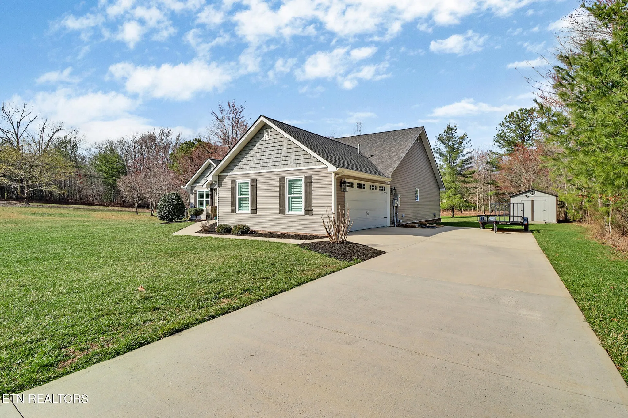Additional highlights include an oversized attached garage, covered porch and deck, concrete driveway and sidewalks, and an outbuilding that offers extra storage or workspace.