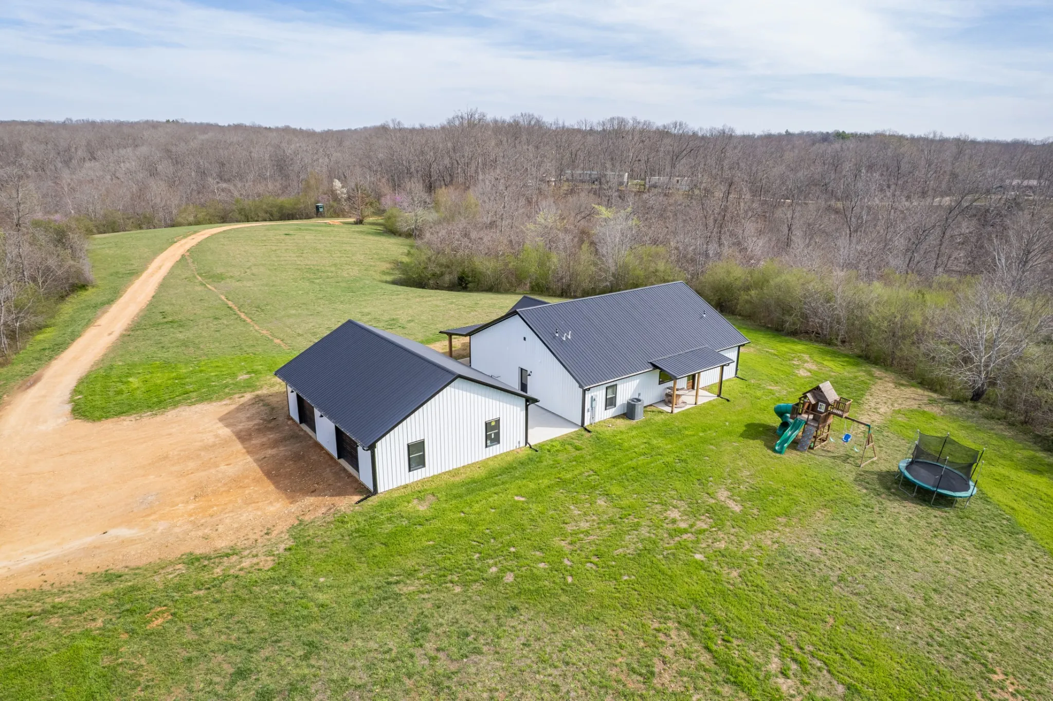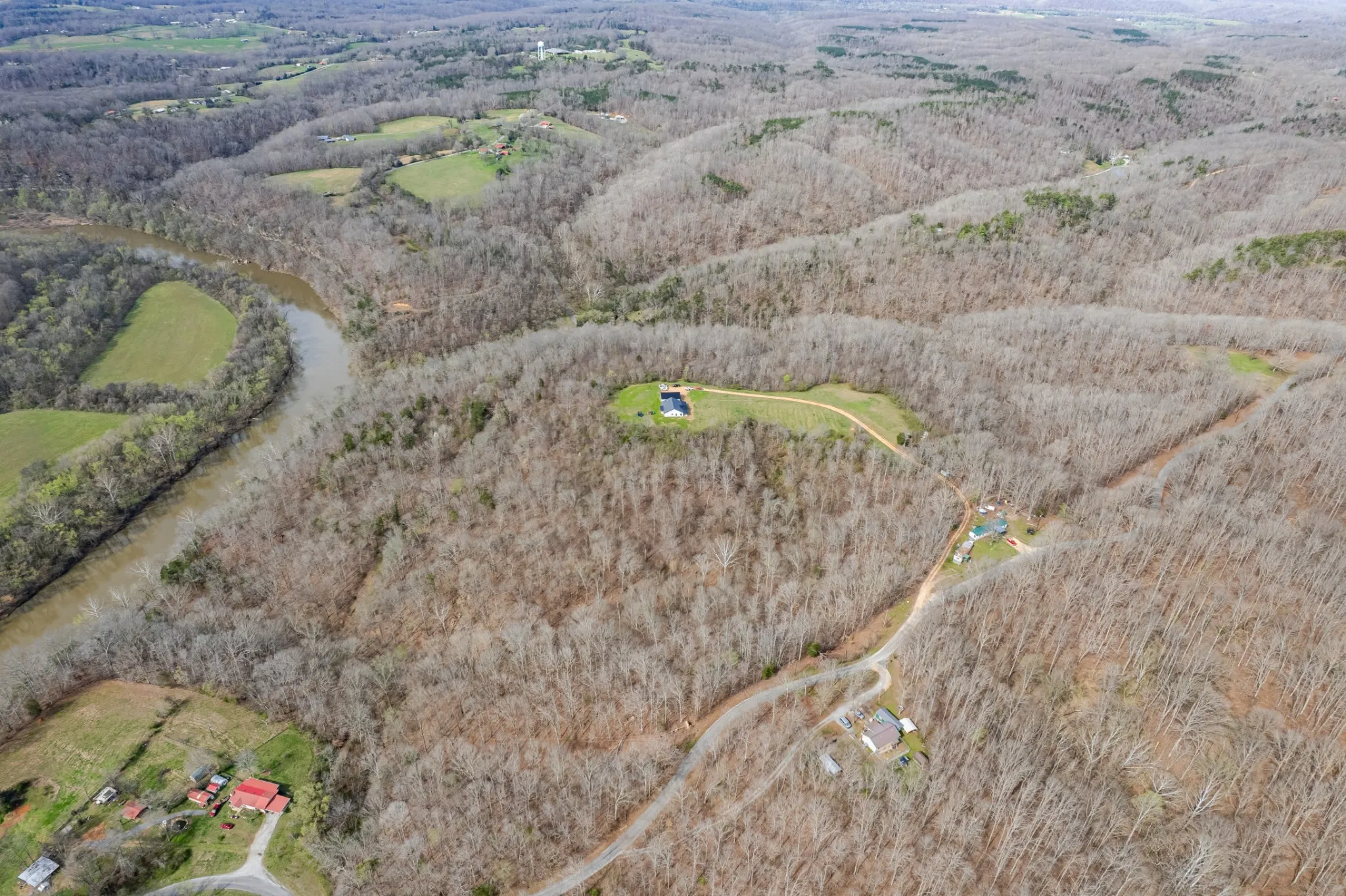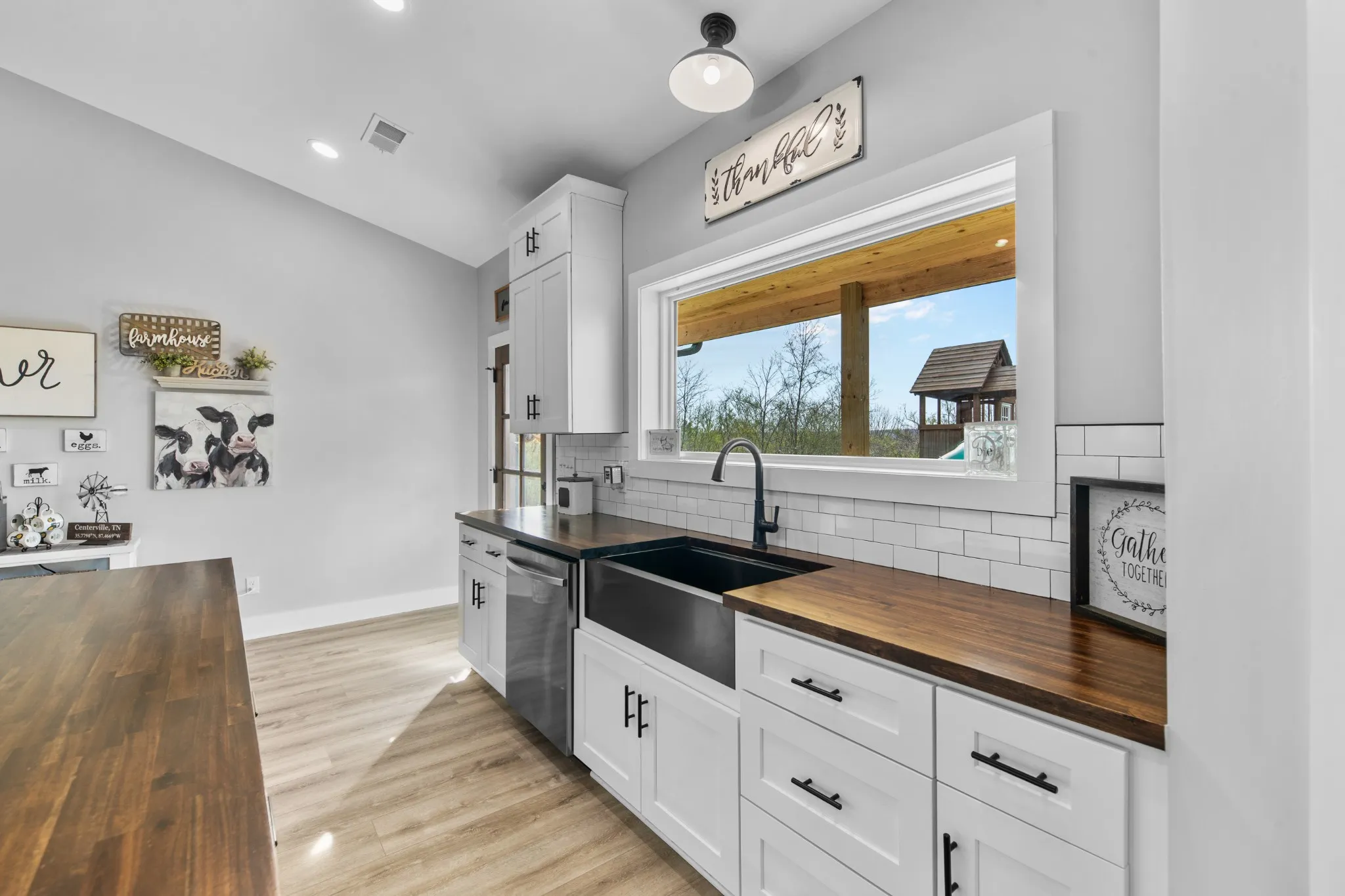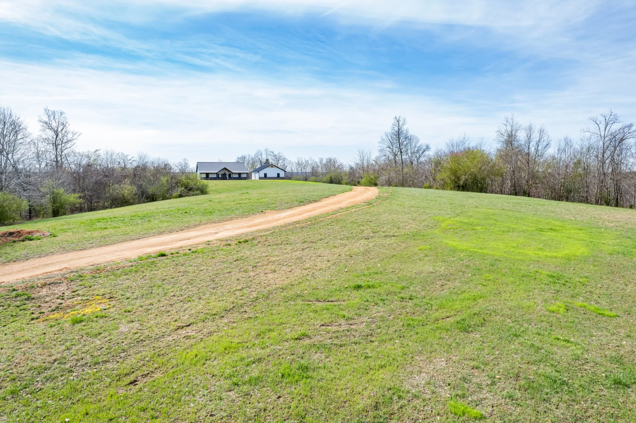 Scenic & Secluded Sanctuary overlooking Centerville! Welcome Home to this beautifully built 2,000 sq ft Farmhouse style 3bdrm/2bath BARNDO on 45.23 Acres w/Detached Garage. This home blends rustic charm with laid-back country living. Perched high above the scenic Duck River and overlooking the timeless Town of Centerville, TN. This tract offers Plenty of Open Field for Farming or Furbabies, yet surrounded by Heavily Wooded Rolling Terrain. Imagine winding past the pond, and down the driveway to your Perfect Getaway called “HOME”! Step into the open great room with vaulted ceilings and a stunning shiplap and stone fireplace wrapped in a heavy beam mantle. The kitchen is straight out of a farmhouse dream with shaker-style white cabinetry, butcher block countertops, subway tile backsplash, Stainless Steel Appliances, a bold black built-in range hood, and a shiplap-accented island. A walk-in pantry with a stained pine door adds warmth and character. The spacious primary suite offers a walk-in closet and a beautifully tiled shower with subway tile walls and glass door. Granite countertops, shaker cabinetry, and durable LVP flooring throughout the home keep things both stylish and practical. Outside is where this one really shines…Enjoy a 500 sq ft covered front porch with tongue-and-groove ceiling, gorgeous stone accents, a spacious covered back porch, and a wide-open concrete patio breezeway connecting to the 1,200 sq ft detached 2-car garage. This property allows you room to spread out and enjoy true country living.