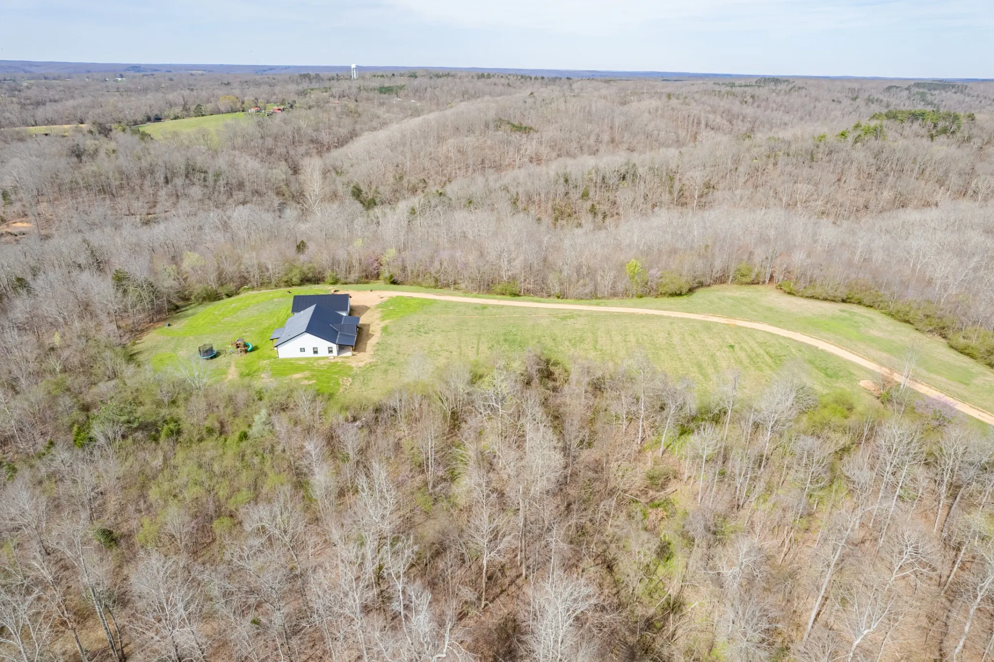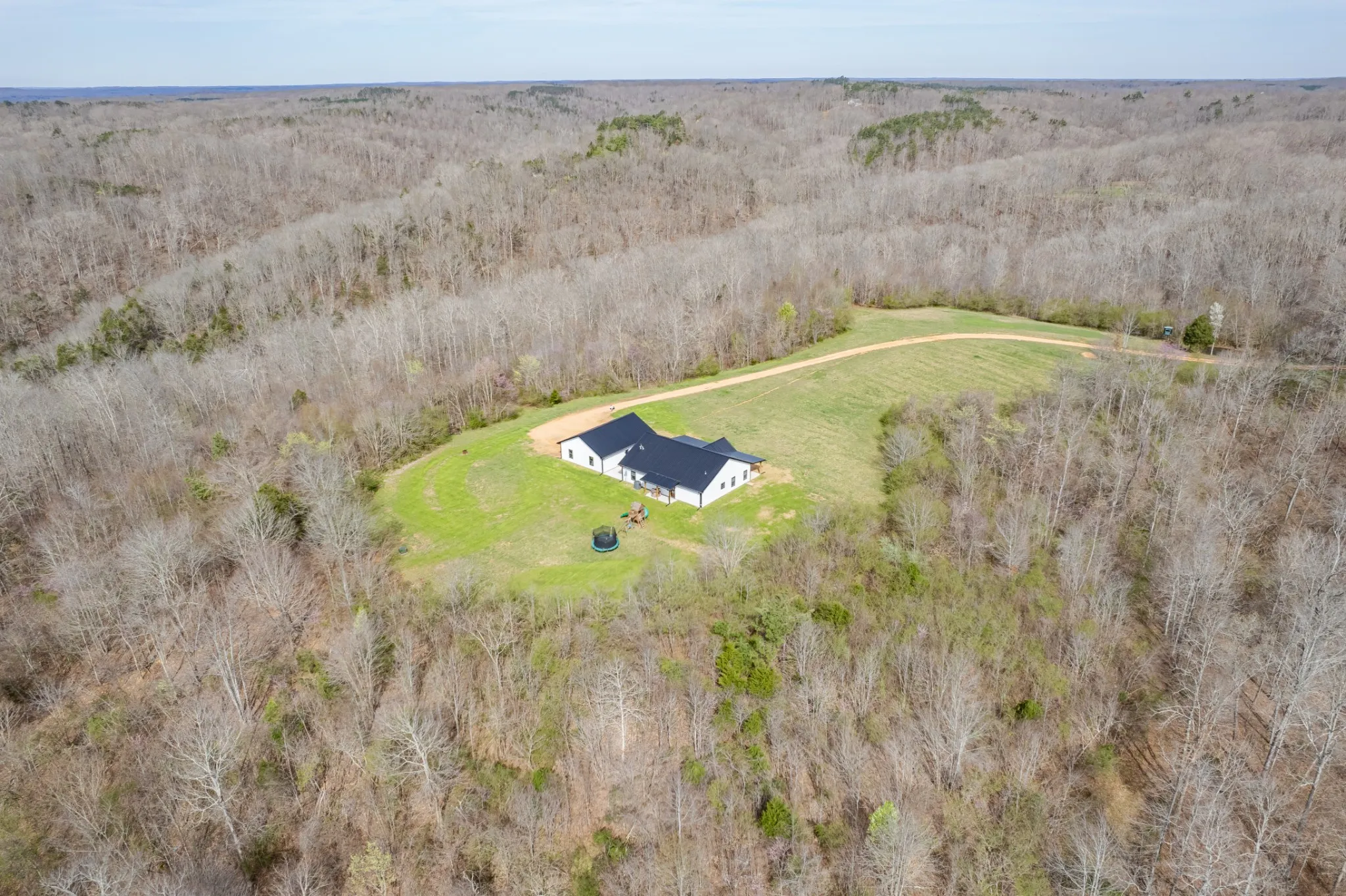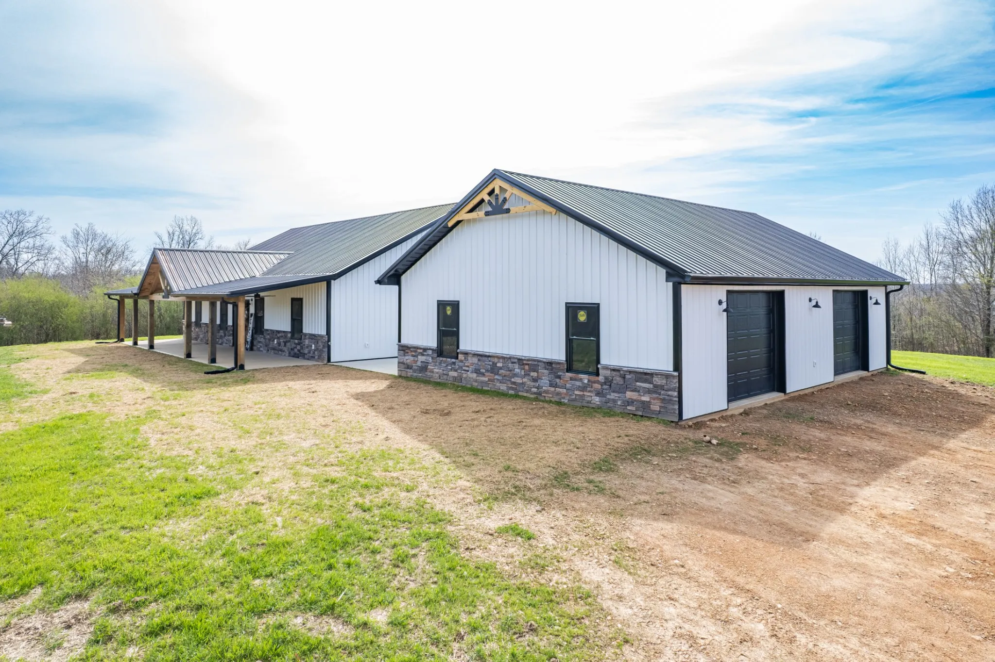 Scenic & Secluded Sanctuary overlooking Centerville! Welcome Home to this beautifully built 2,000 sq ft Farmhouse style 3bdrm/2bath BARNDO on 45.23 Acres w/Detached Garage. This home blends rustic charm with laid-back country living. Perched high above the scenic Duck River and overlooking the timeless Town of Centerville, TN. This tract offers Plenty of Open Field for Farming or Furbabies, yet surrounded by Heavily Wooded Rolling Terrain. Imagine winding past the pond, and down the driveway to your Perfect Getaway called “HOME”! Step into the open great room with vaulted ceilings and a stunning shiplap and stone fireplace wrapped in a heavy beam mantle. The kitchen is straight out of a farmhouse dream with shaker-style white cabinetry, butcher block countertops, subway tile backsplash, Stainless Steel Appliances, a bold black built-in range hood, and a shiplap-accented island. A walk-in pantry with a stained pine door adds warmth and character. The spacious primary suite offers a walk-in closet and a beautifully tiled shower with subway tile walls and glass door. Granite countertops, shaker cabinetry, and durable LVP flooring throughout the home keep things both stylish and practical. Outside is where this one really shines…Enjoy a 500 sq ft covered front porch with tongue-and-groove ceiling, gorgeous stone accents, a spacious covered back porch, and a wide-open concrete patio breezeway connecting to the 1,200 sq ft detached 2-car garage. This property allows you room to spread out and enjoy true country living.