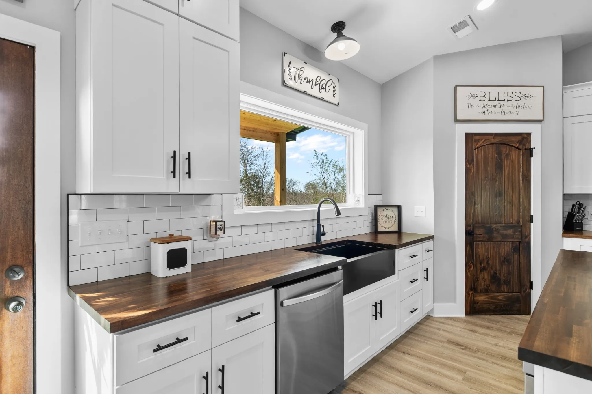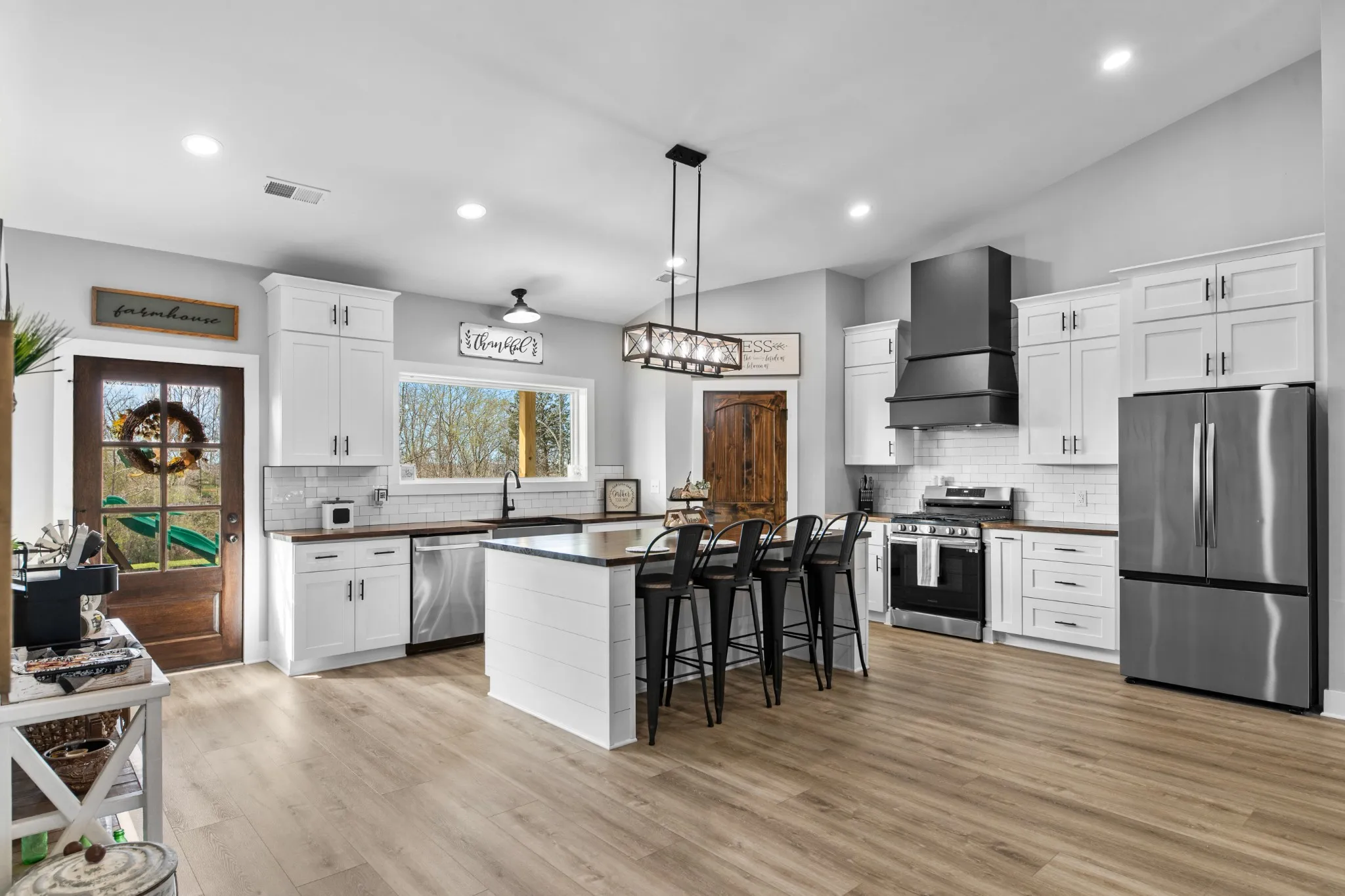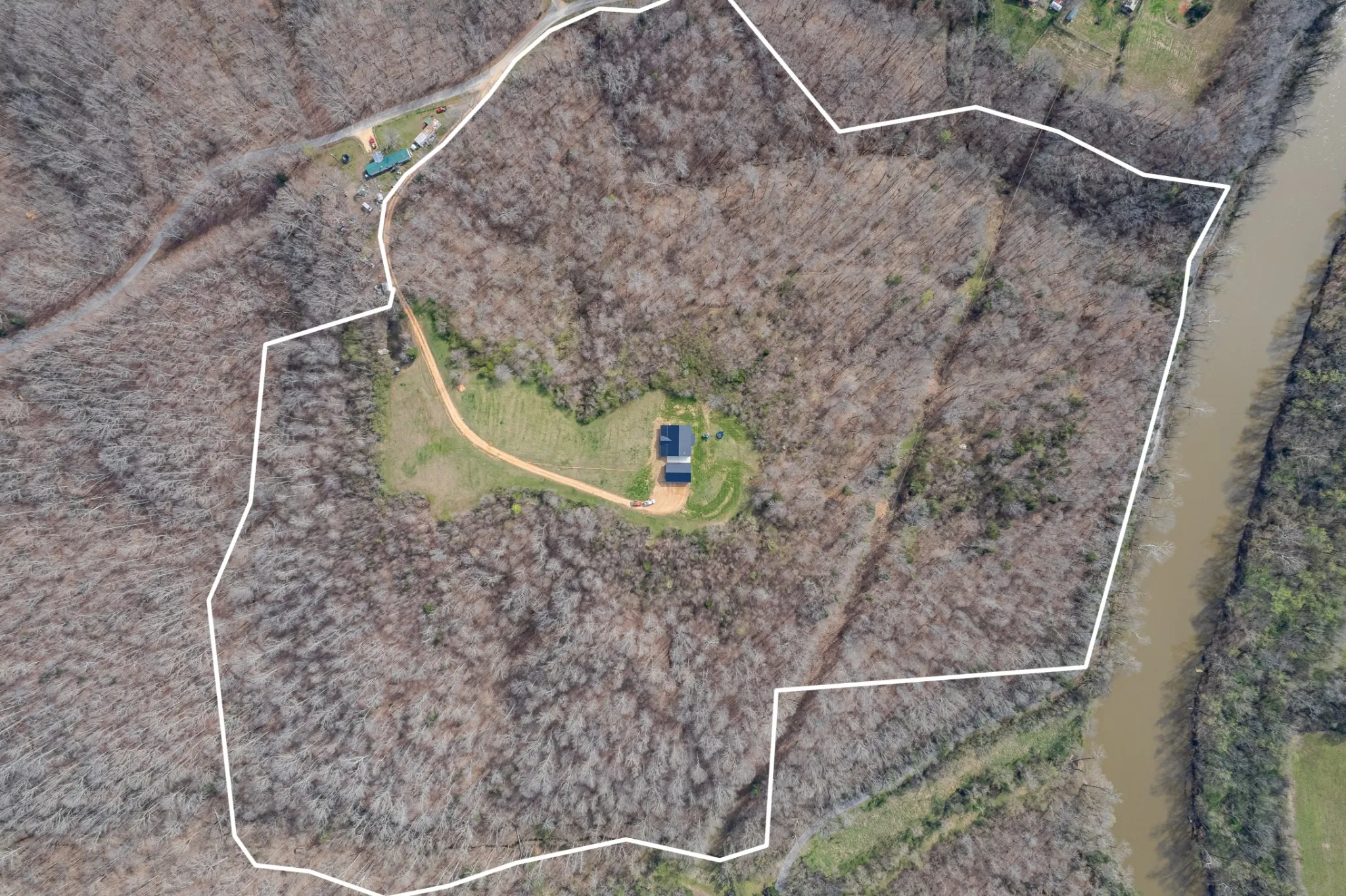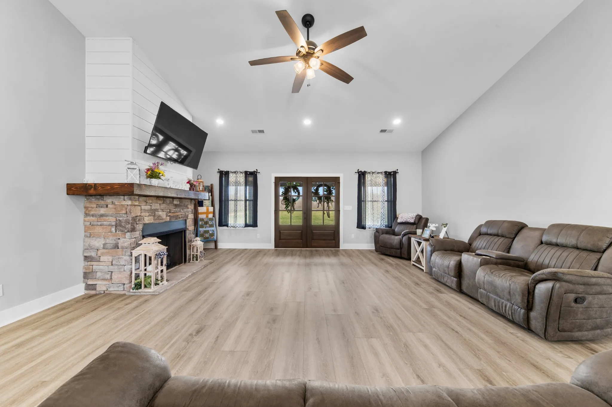 Scenic & Secluded Sanctuary overlooking Centerville! Welcome Home to this beautifully built 2,000 sq ft Farmhouse style 3bdrm/2bath BARNDO on 45.23 Acres w/Detached Garage. This home blends rustic charm with laid-back country living. Perched high above the scenic Duck River and overlooking the timeless Town of Centerville, TN. This tract offers Plenty of Open Field for Farming or Furbabies, yet surrounded by Heavily Wooded Rolling Terrain. Imagine winding past the pond, and down the driveway to your Perfect Getaway called “HOME”! Step into the open great room with vaulted ceilings and a stunning shiplap and stone fireplace wrapped in a heavy beam mantle. The kitchen is straight out of a farmhouse dream with shaker-style white cabinetry, butcher block countertops, subway tile backsplash, Stainless Steel Appliances, a bold black built-in range hood, and a shiplap-accented island. A walk-in pantry with a stained pine door adds warmth and character. The spacious primary suite offers a walk-in closet and a beautifully tiled shower with subway tile walls and glass door. Granite countertops, shaker cabinetry, and durable LVP flooring throughout the home keep things both stylish and practical. Outside is where this one really shines…Enjoy a 500 sq ft covered front porch with tongue-and-groove ceiling, gorgeous stone accents, a spacious covered back porch, and a wide-open concrete patio breezeway connecting to the 1,200 sq ft detached 2-car garage. This property allows you room to spread out and enjoy true country living.