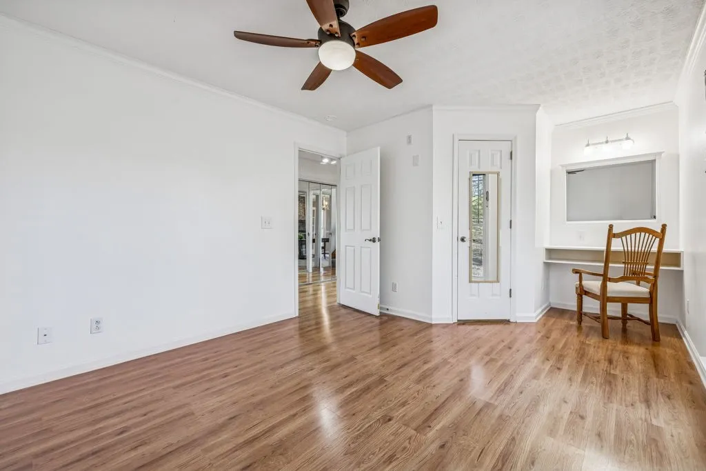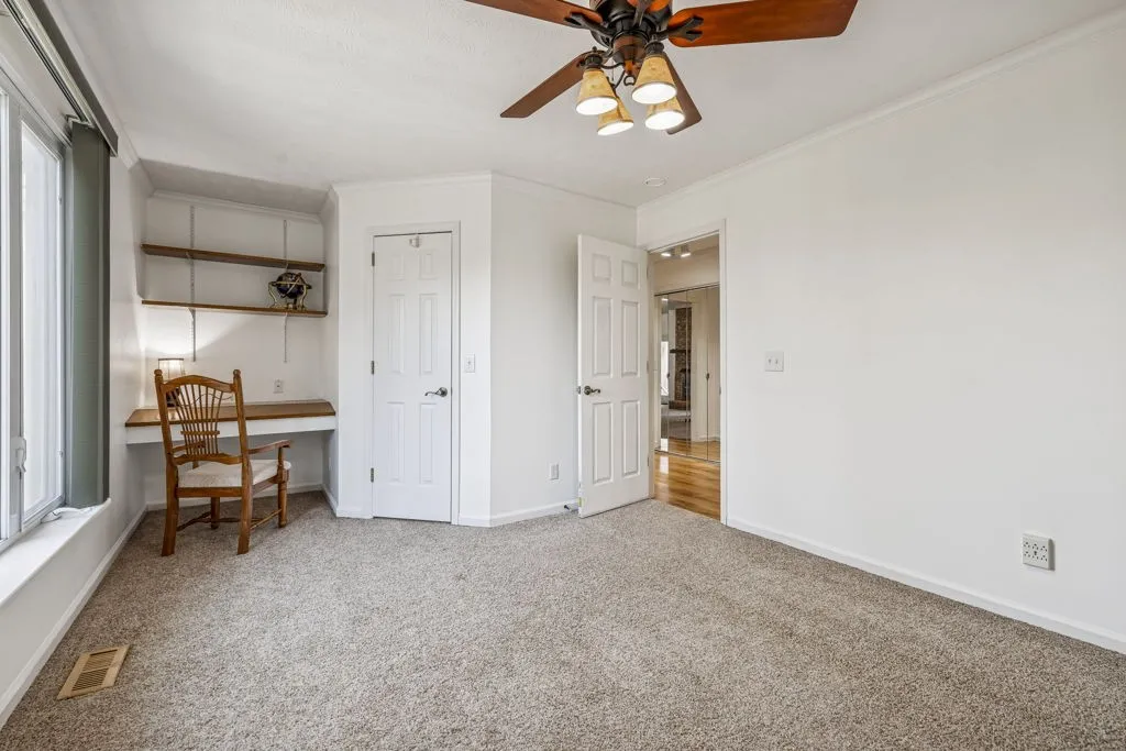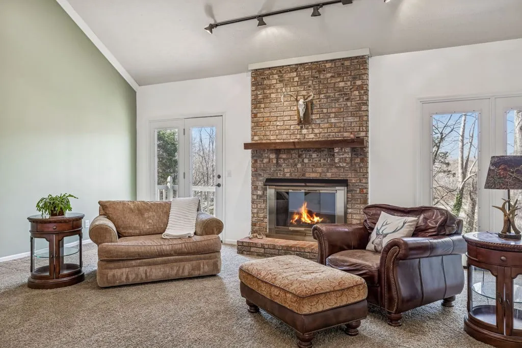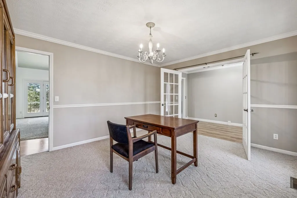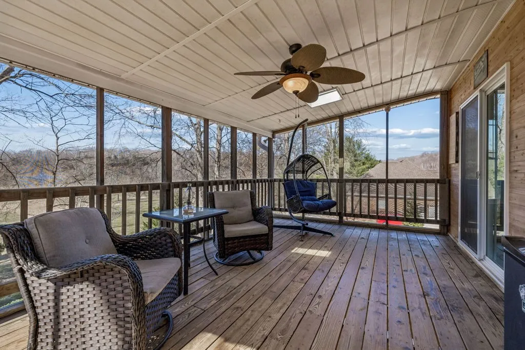 The main level impresses with a generously sized entry, French doors leading to a formal dining or private home office space, soaring vaulted living room highlighted by skylights, rich architectural detail, access to your very own Juliet balcony and one of two gas fireplaces. The eat-in kitchen is appointed with solid wood cabinetry, granite countertops, and seamless transition to the screened-in porch and expansive two-tier deck. The spacious primary suite on the main level features a walk-in closet, and private ensuite. Two secondary bedrooms, both with walk-in closets and custom built-ins, complete the main floor.
