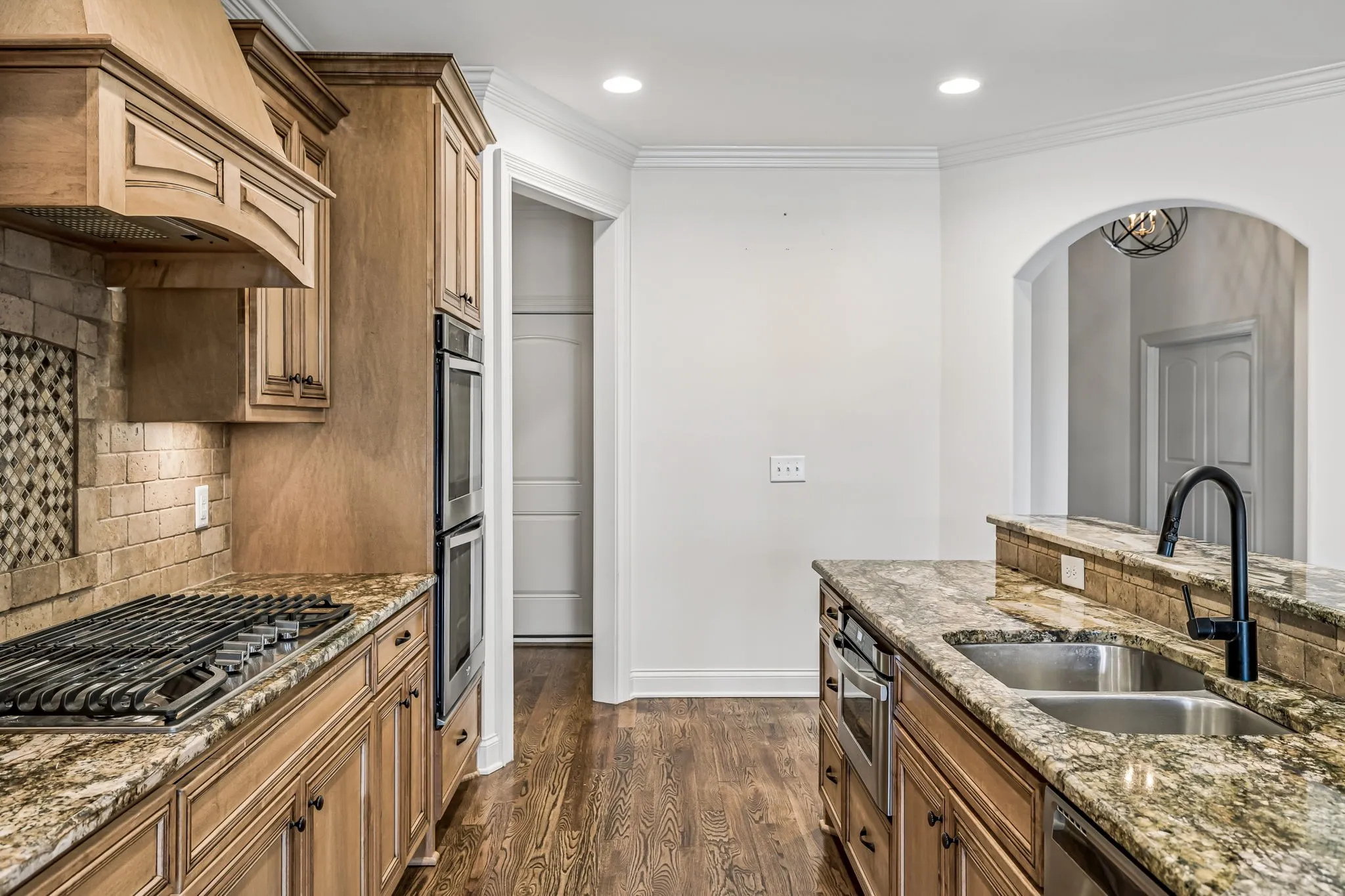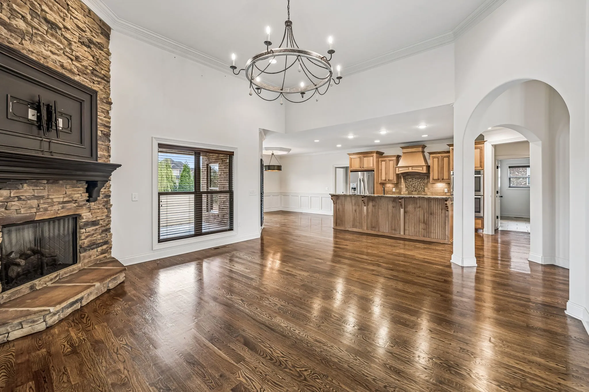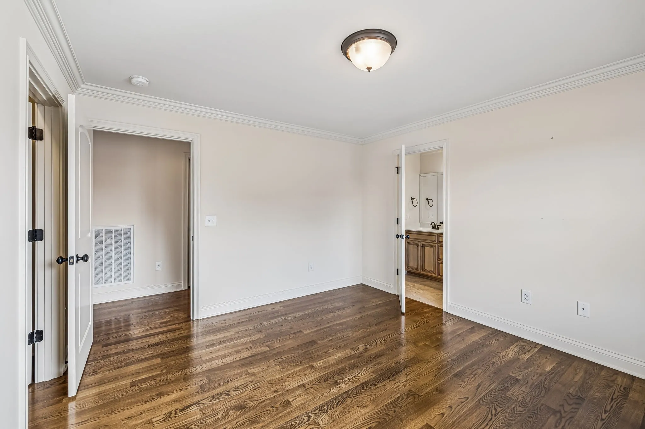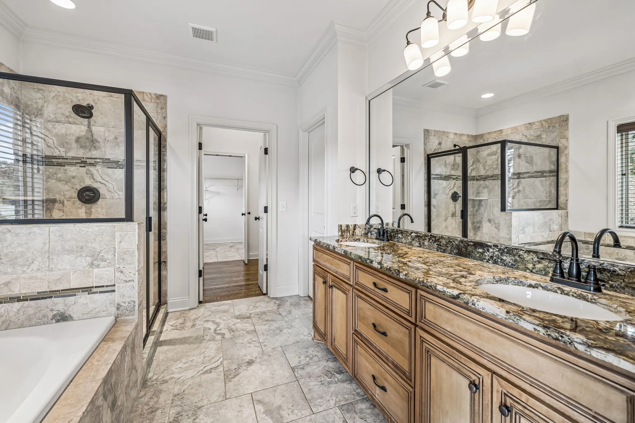 Natural Custom wood flooring runs across both levels, with tile in select areas—no carpet anywhere in the home. The main floor features a spacious owner’s suite with a relaxing soaking tub, tiled walk-in shower, and generous closet space. An additional room on the first floor works perfectly as a guest room or workspace.