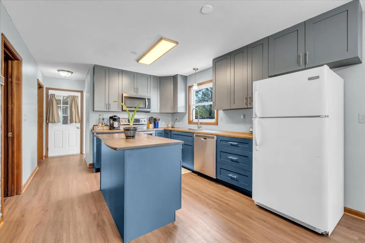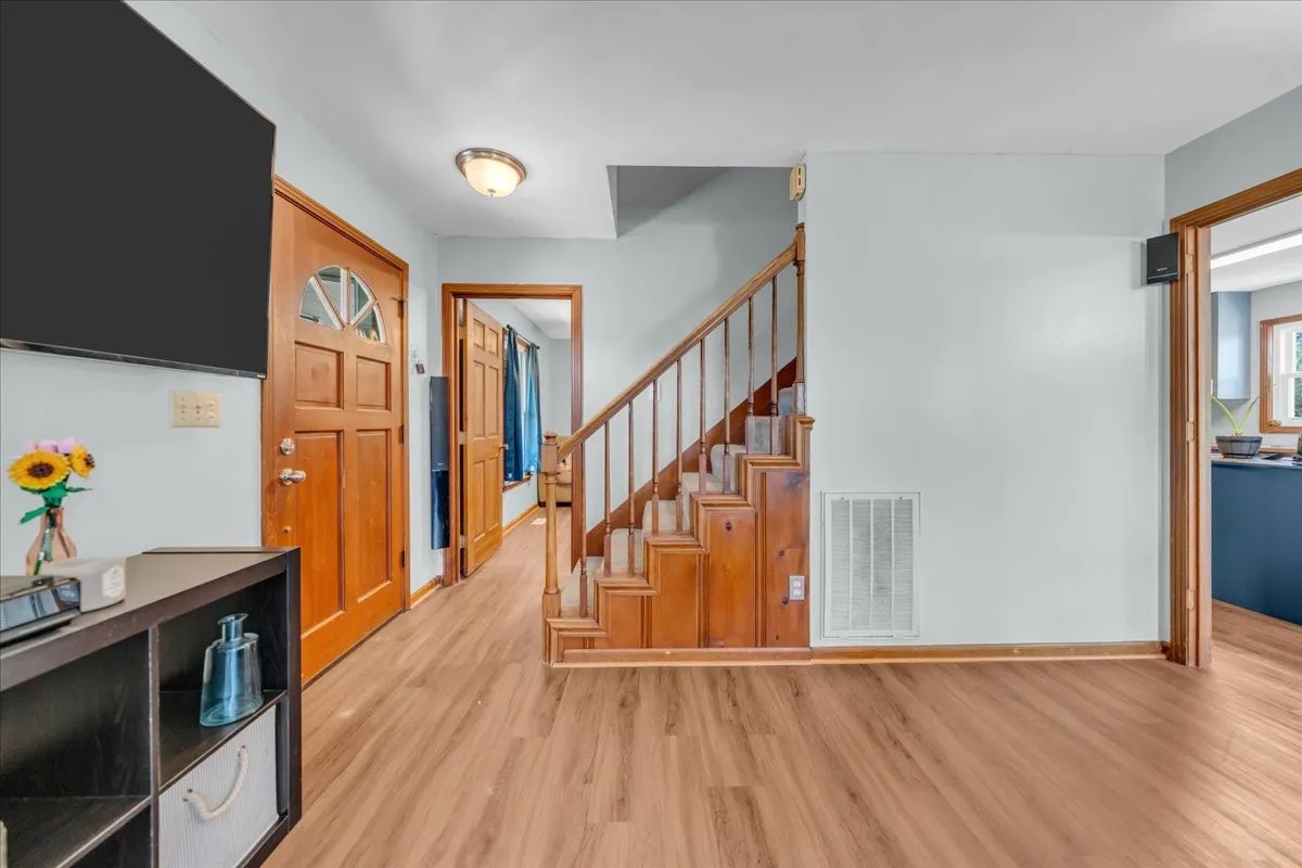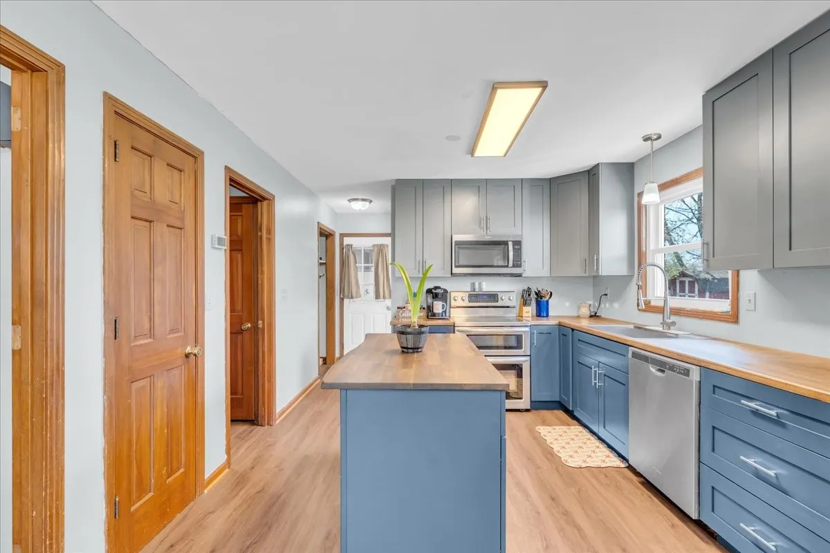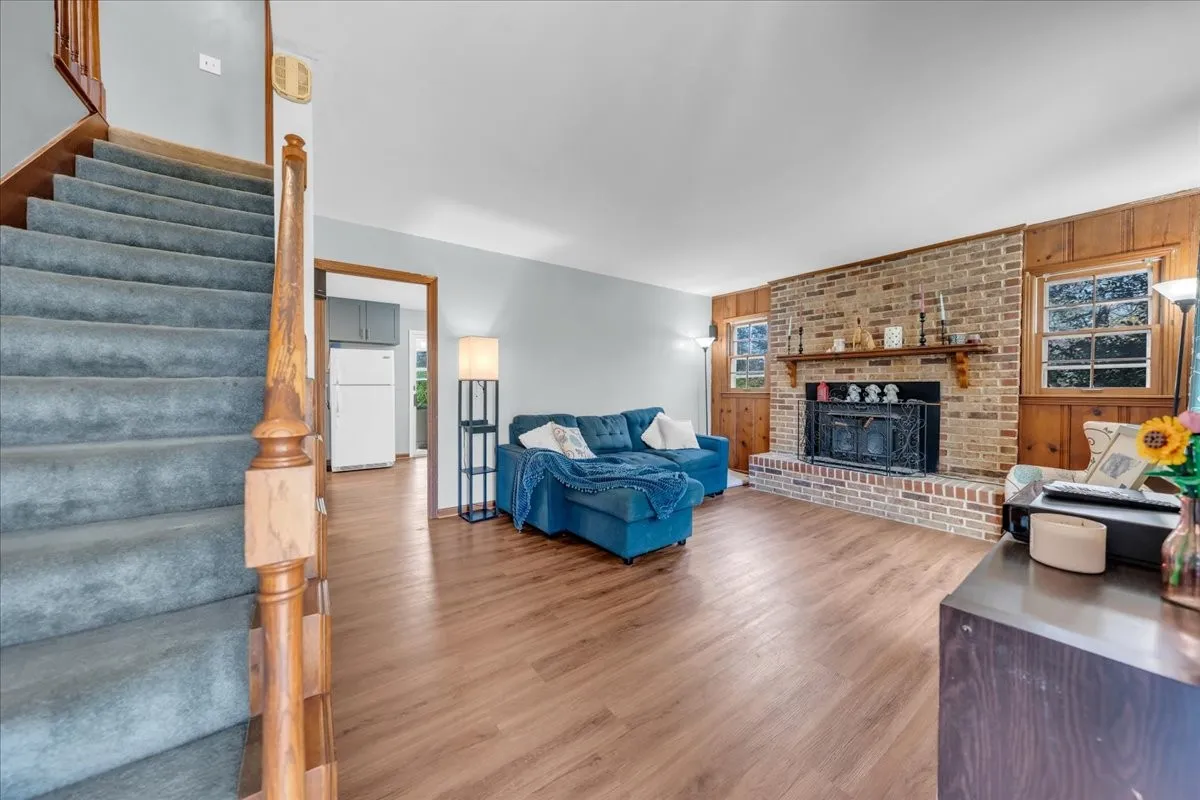 Inside, this home blends original character with thoughtful updates. The wood-burning fireplace creates a cozy focal point, with built in surround sound, while touches like the original wooden banister preserve its timeless charm. The updated kitchen is designed to impress with a custom island, butcher block countertops, double oven, and additional built-in cabinetry in the dine-in area.