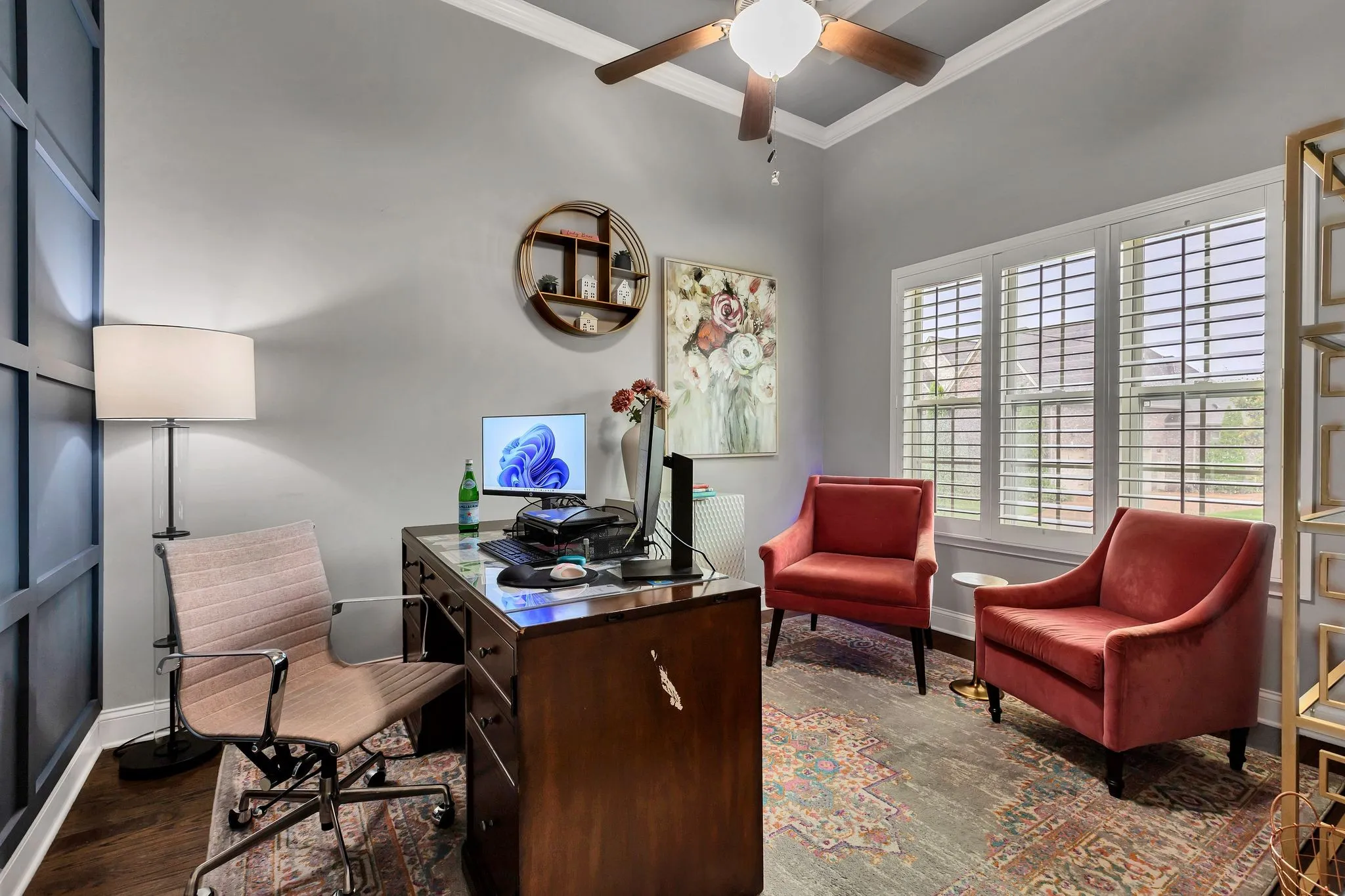 Refined Traditional Living located in the sought-after Cherry Grove community, this all-brick home offers 5 bedrooms, 4.5 bathrooms, and over 4,100 square feet of thoughtfully designed living space. Built in 2013 and positioned on one of the neighborhood’s premier lots, the home features 10-foot ceilings, newly installed hardwood floors on the main level, and an open-concept layout ideal for everyday living and entertaining. The custom kitchen includes double islands, a pot filler, extensive cabinetry, and a vaulted breakfast nook with exposed beams that flows seamlessly into the great room with coffered ceiling, built-in bookcases, and gas fireplace. The primary suite and dedicated office are located on the main level. Upstairs offers spacious secondary bedrooms, a large bonus room, and a versatile 16-by-16 flex room ideal for a media room, exercise space, or additional bedroom. Outdoor living features a covered and screened porch with wood-burning fireplace. Additional highlights include a three-car garage, new roof, and community pool access. Buyer and Buyer’s agent to verify all pertinent information.