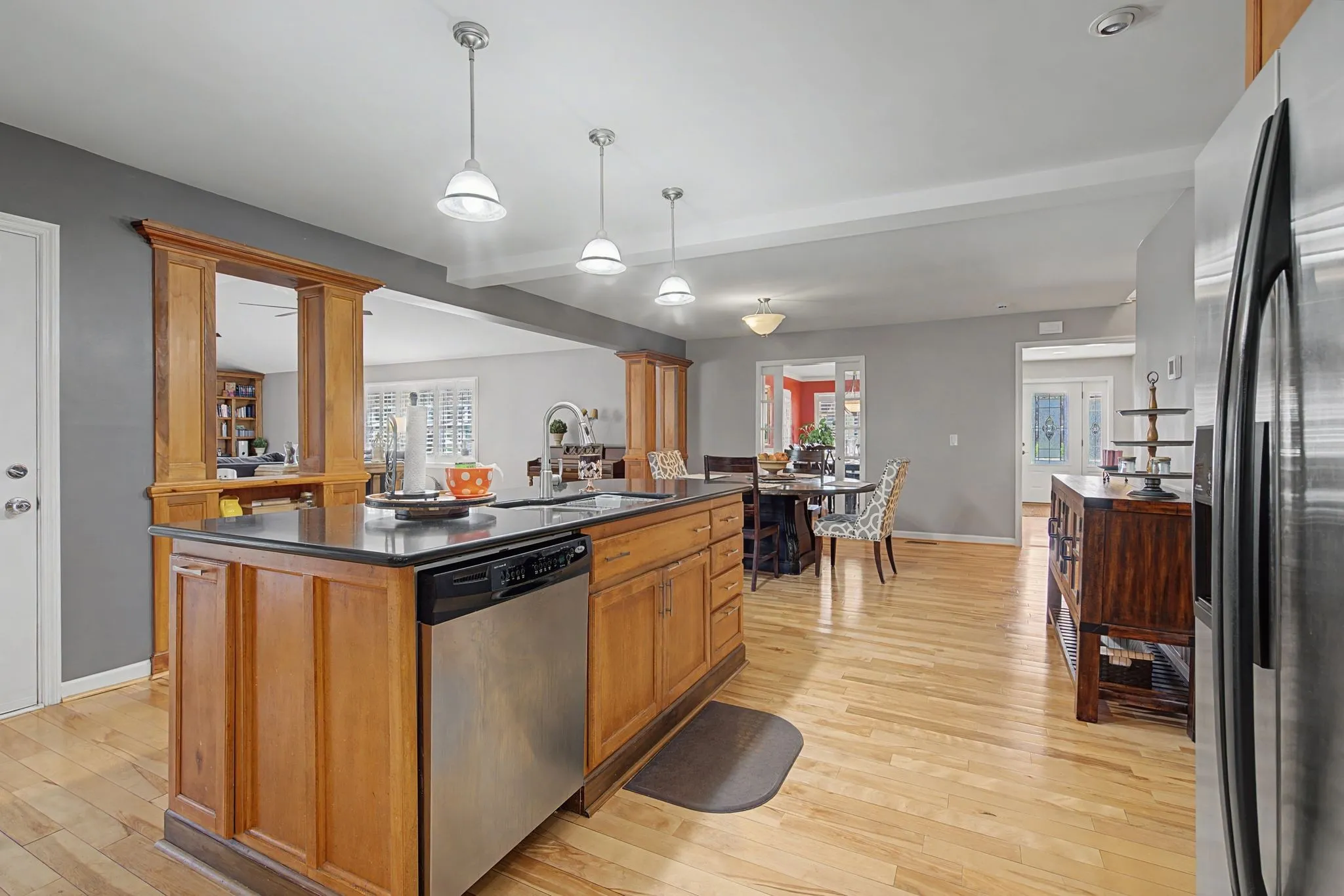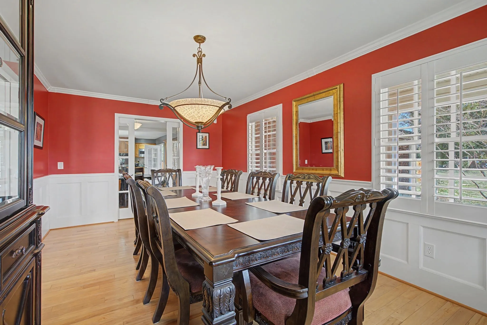Inside, with hardwoods and plantation shutters throughout main level, warm and comfort abound with two gas fireplaces. One fireplace enhances the great room, while the second is a stunning two-sided fireplace shared between the large master bedroom with ample room for a sitting area and Master en suite—creating a cozy retreat atmosphere in both spaces.