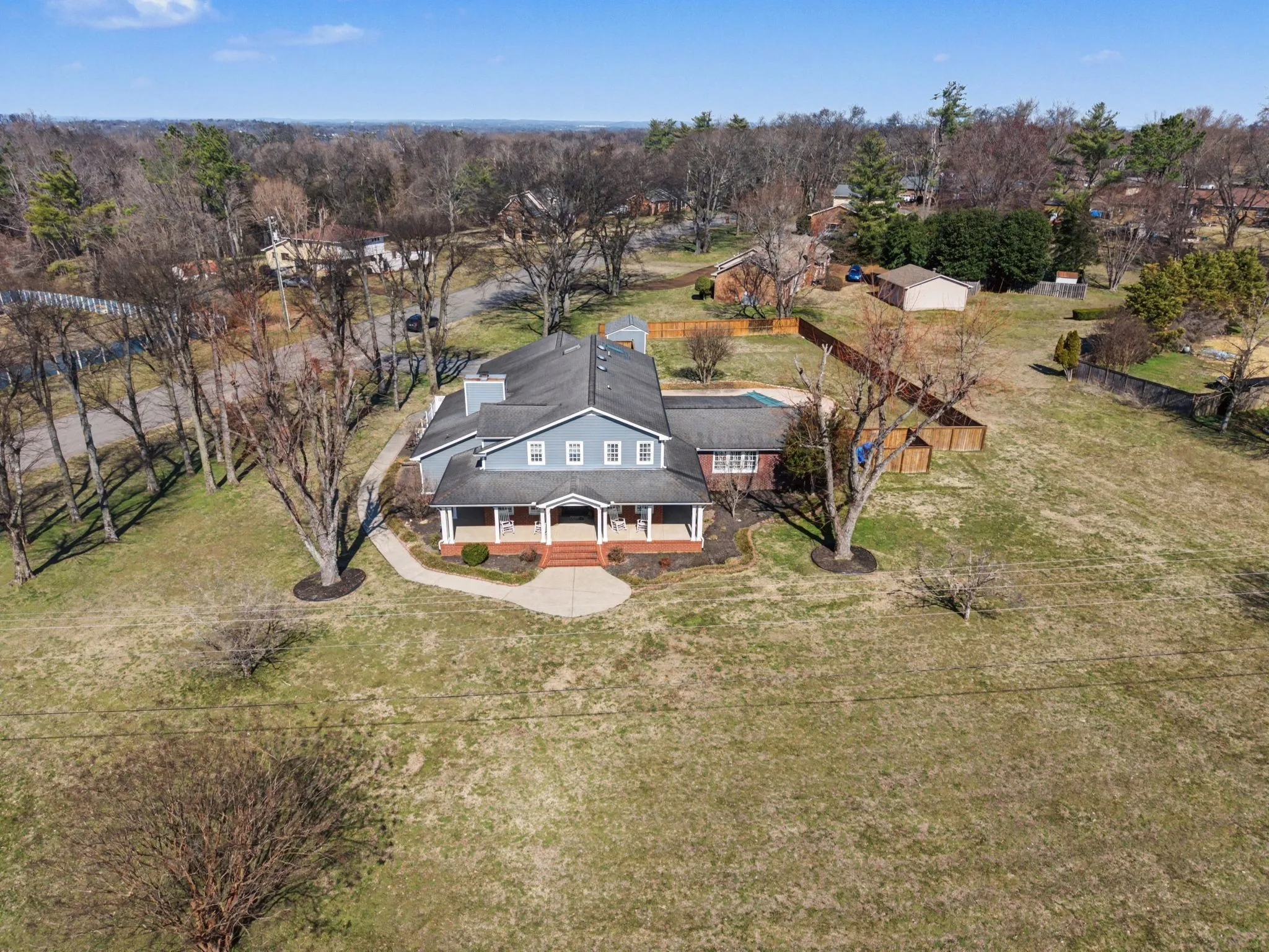 (P) From the moment you arrive, you’ll be drawn to the comfortable covered front porch wrapping around three sides of the home, highlighted by classic columns offering the perfect setting for morning coffee and evening sunsets. Out back, you will find a screened-in porch overlooking an in-ground pool, offering the perfect place to unwind or entertain.