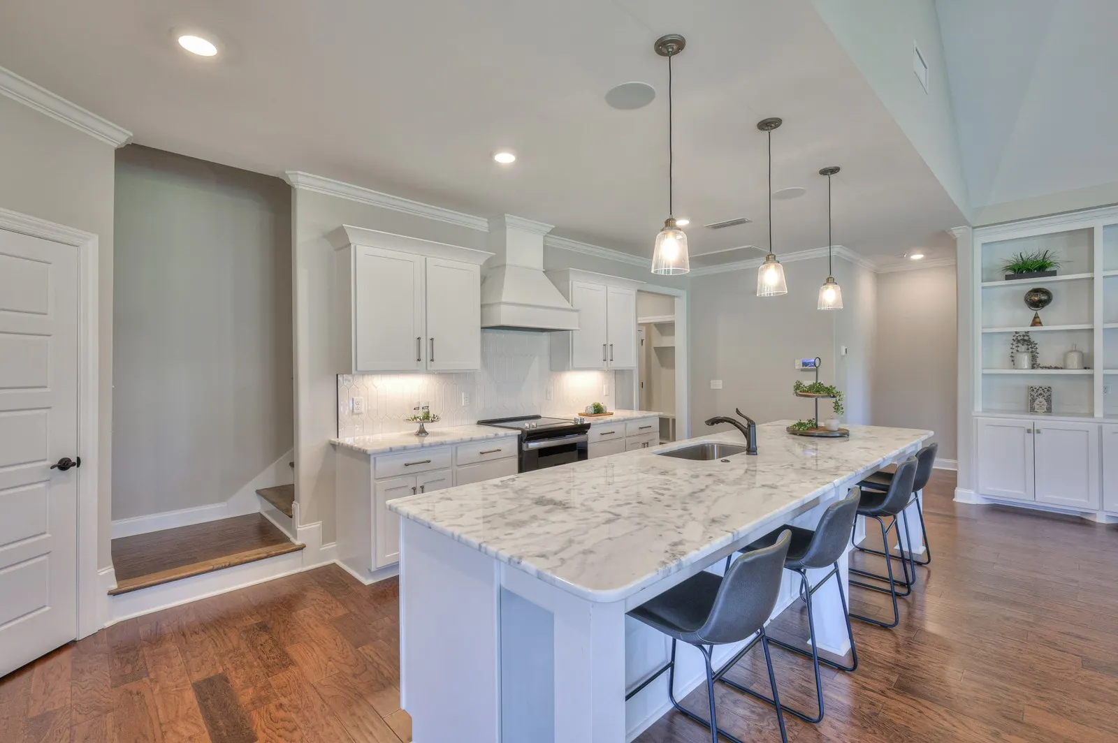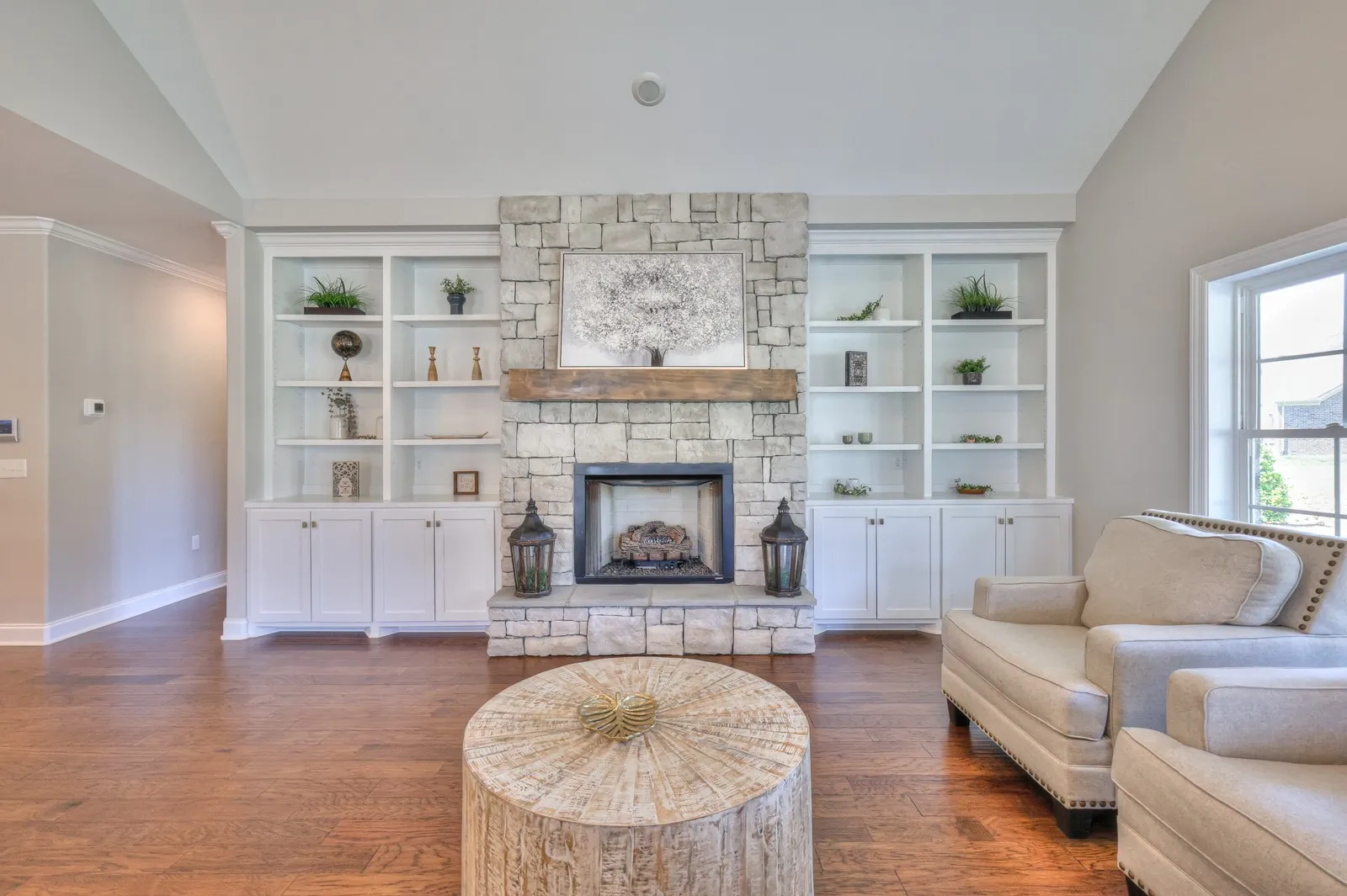 This upgraded home in a gated community features hardwood floors on the main level, a spacious kitchen with large island and walk-in pantry, wood staircase, crown molding, built-in shelving, stone fireplace, covered back patio, and a 2-car epoxy garage.