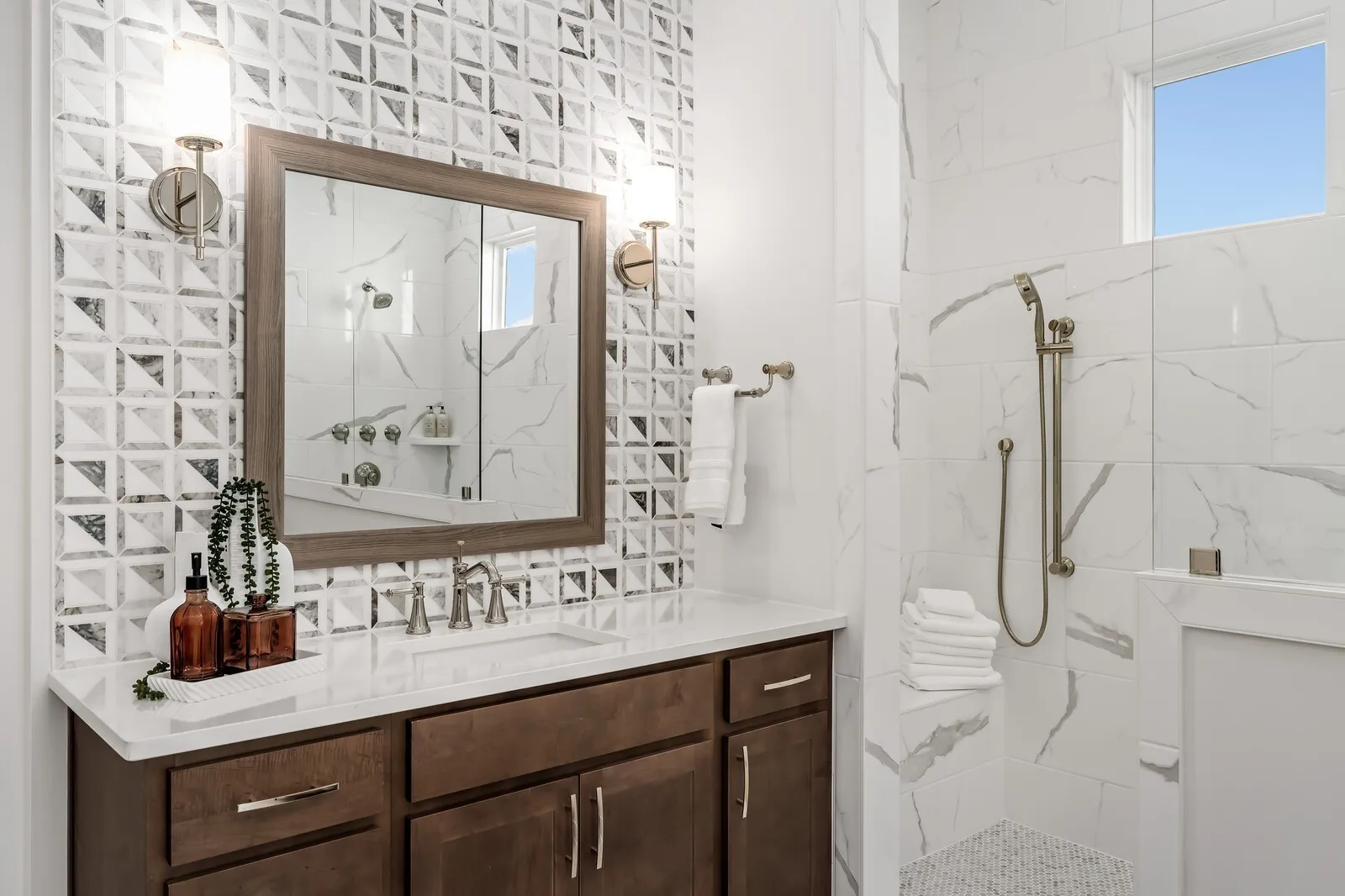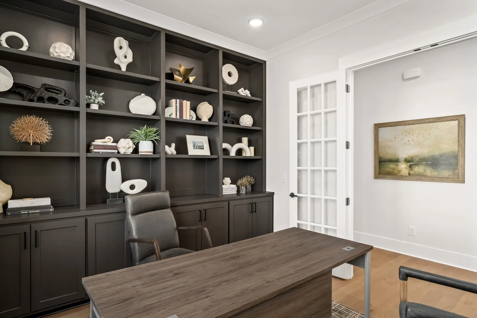 The luxurious primary retreat is designed for comfort and sophistication, featuring dual walk-in closets, split vanities with a linen closet, and an oversized spa-style shower. A light-filled main-level guest suite with private bath provides ideal accommodations for visitors seeking stair-free access.