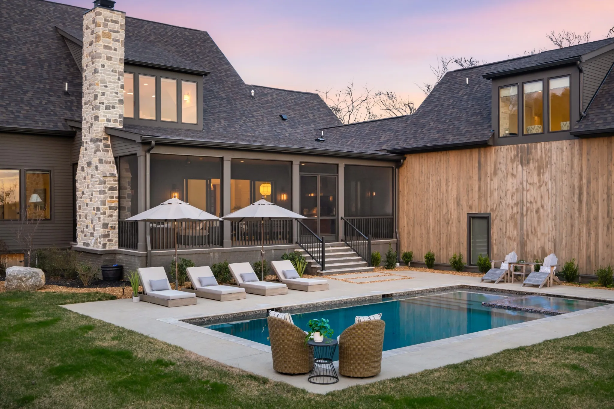 Outdoor living is equally impressive. A welcoming front porch and expansive back porch, both with fireplaces, invite year round enjoyment. The screened porch features a built in grilling area, while the backyard centers around a resort style gunite saltwater pool and spa overlooking peaceful acreage and unforgettable sunset views.