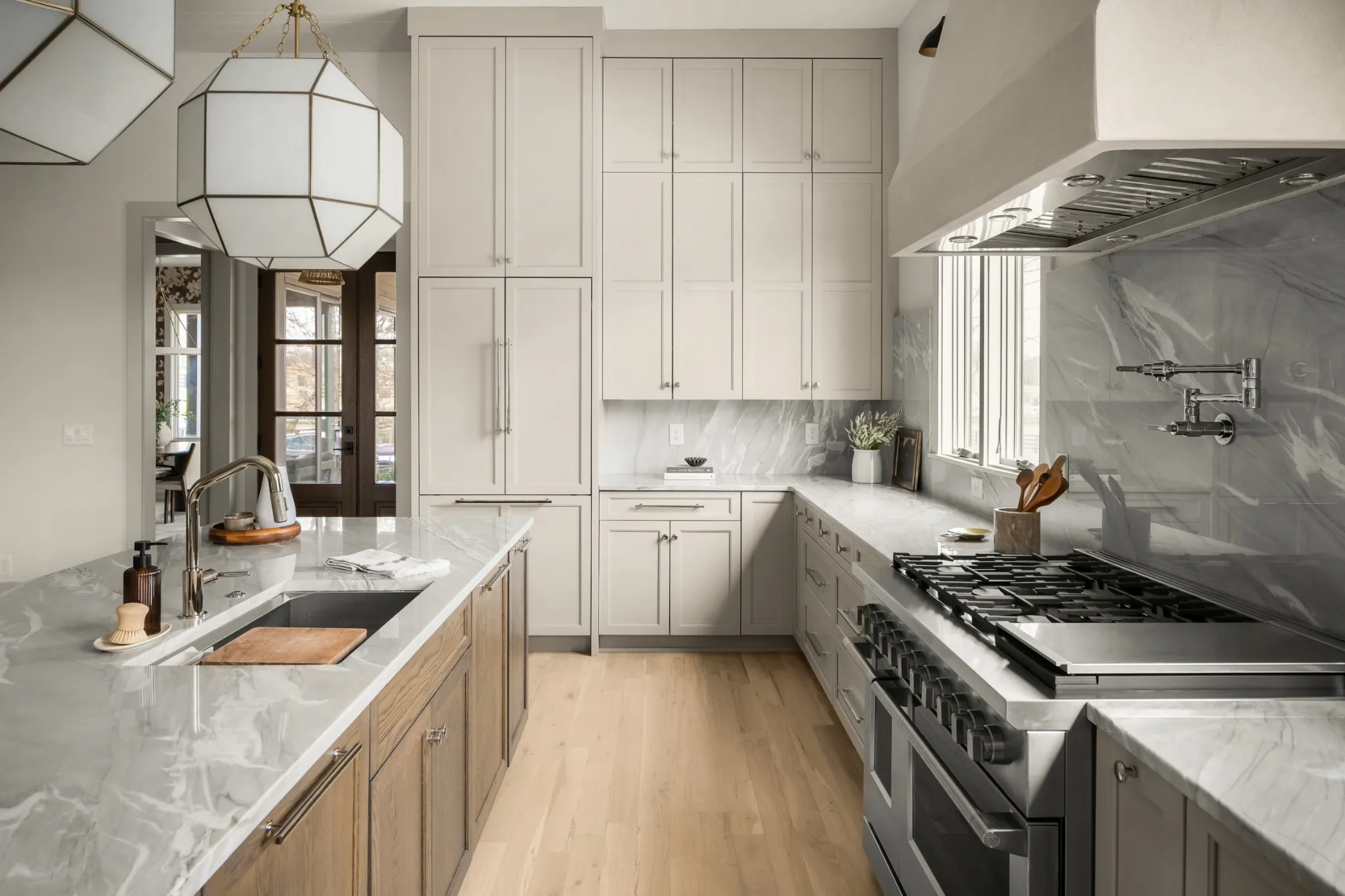 Inside, exceptional craftsmanship and carefully curated design define every space. Hardwood floors run throughout the home, complemented by designer lighting, custom finishes, and striking wallpaper selections that bring warmth and character. The kitchen is outfitted with premium Fisher & Paykel appliances and anchored by stunning natural stone, creating a space that is both beautiful and highly functional for everyday living and entertaining.
