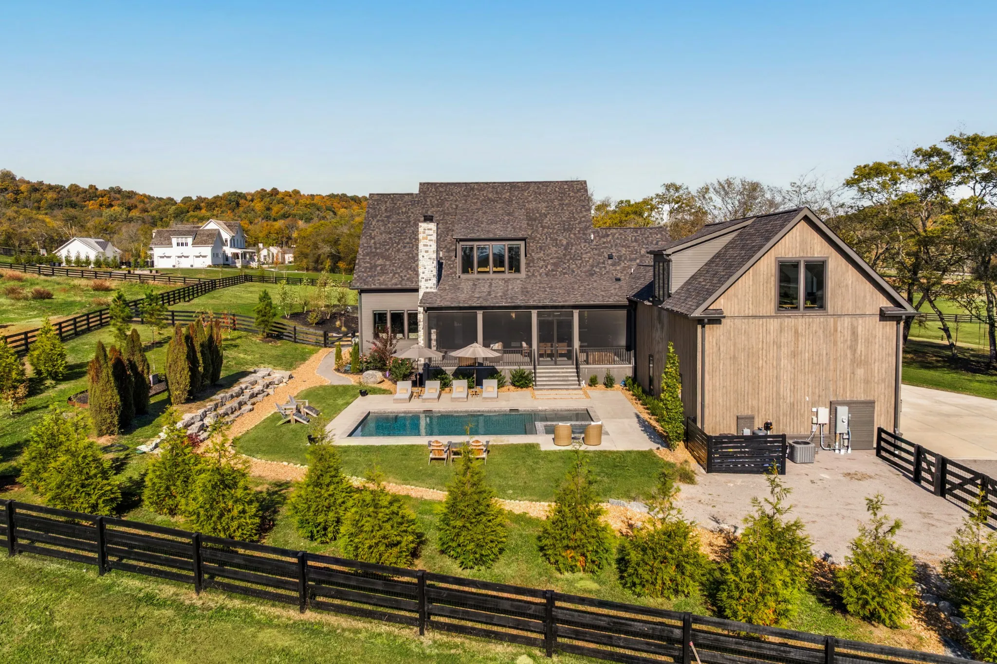 Set well back from the road behind a line of mature trees, the property offers a sense of privacy that is increasingly rare this close to town. The pea gravel drive leads to open green space where life unfolds naturally, children running through the field, a rope swing hanging from a favorite tree, afternoons spent gardening, and long evenings gathered by the pool.