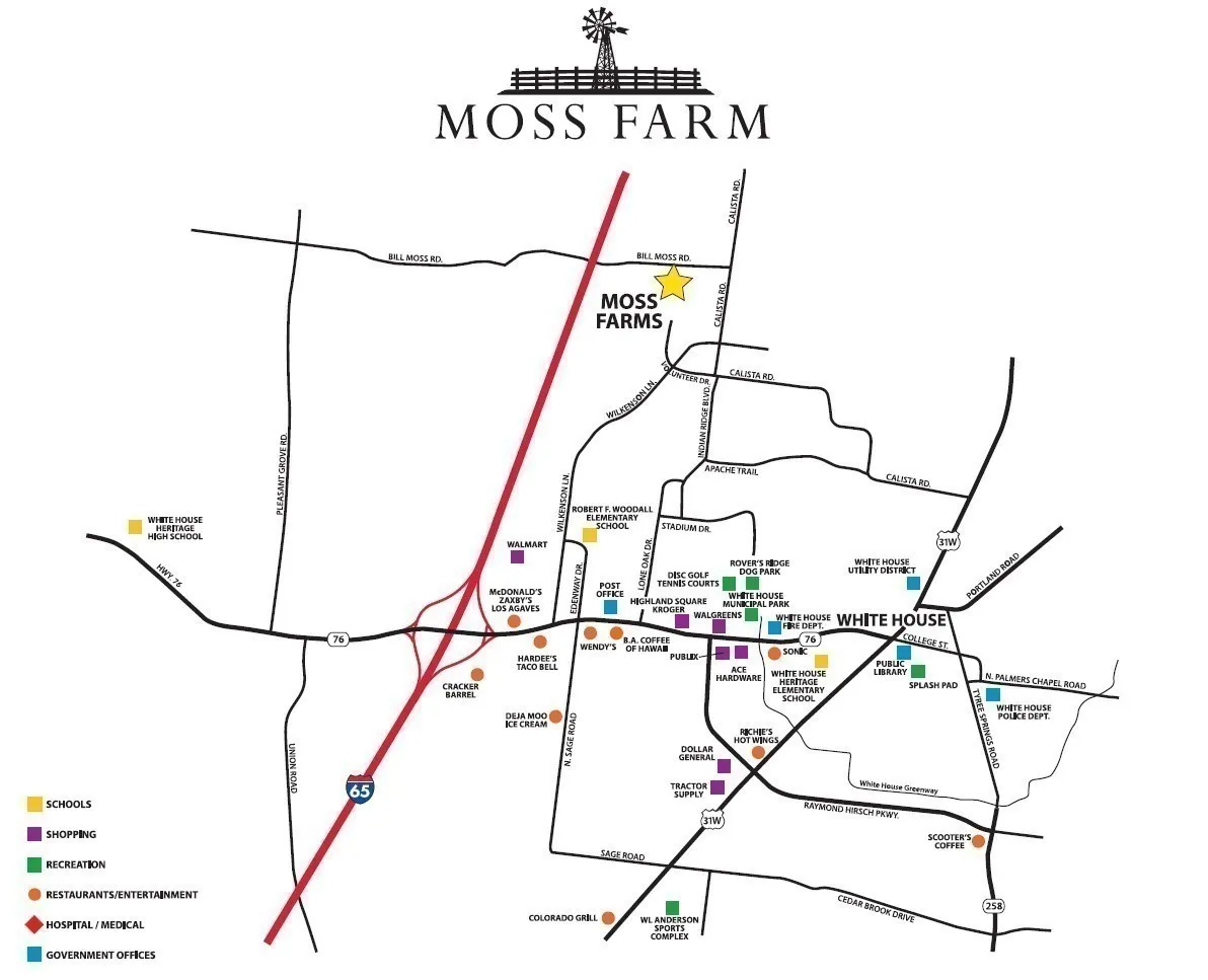 - Directions: From Nashville take I-65 North toward Louisville for 18 miles, then take exit 108 to TN-76 E., and turn right onto TN-76 toward White House. Next turn left onto Wilkinson Ln., then turn left onto Calista Rd, and finally turn left onto Bill Moss Rd.