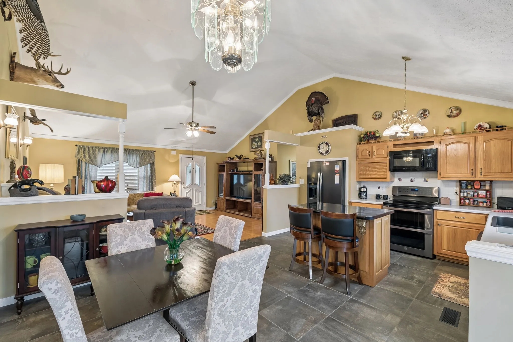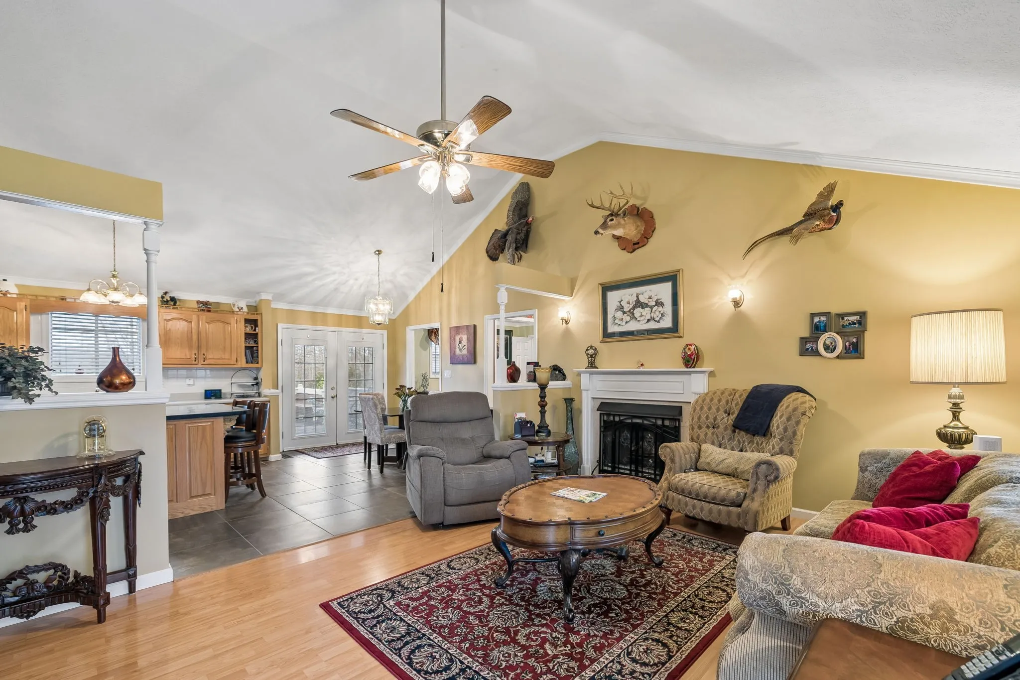 The adjoining den features a cathedral ceiling and a propane fireplace, creating a warm and inviting gathering space, while ceiling fans throughout enhance year-round comfort. The French doors open to a large wooden deck great for entertaining.