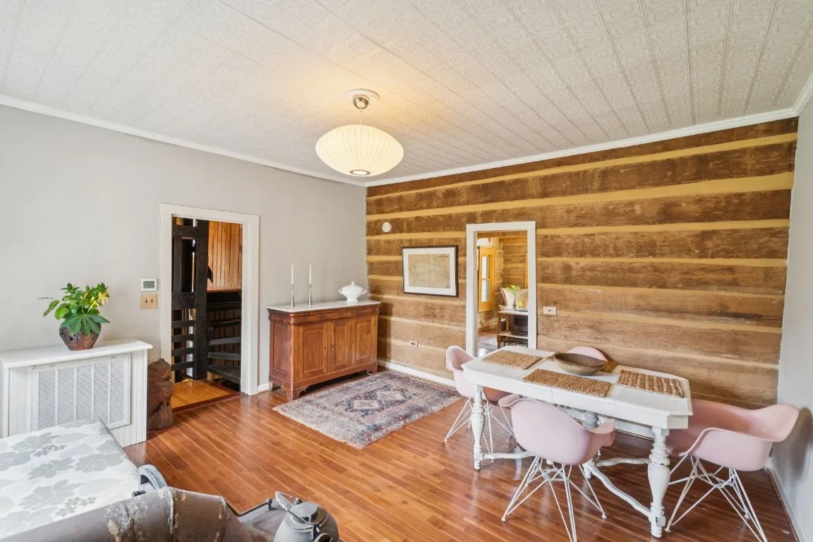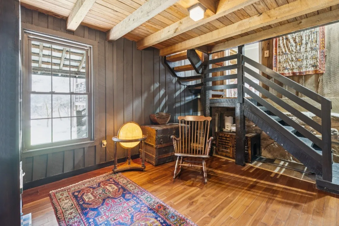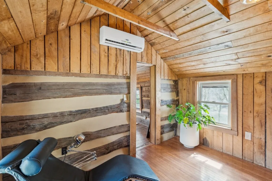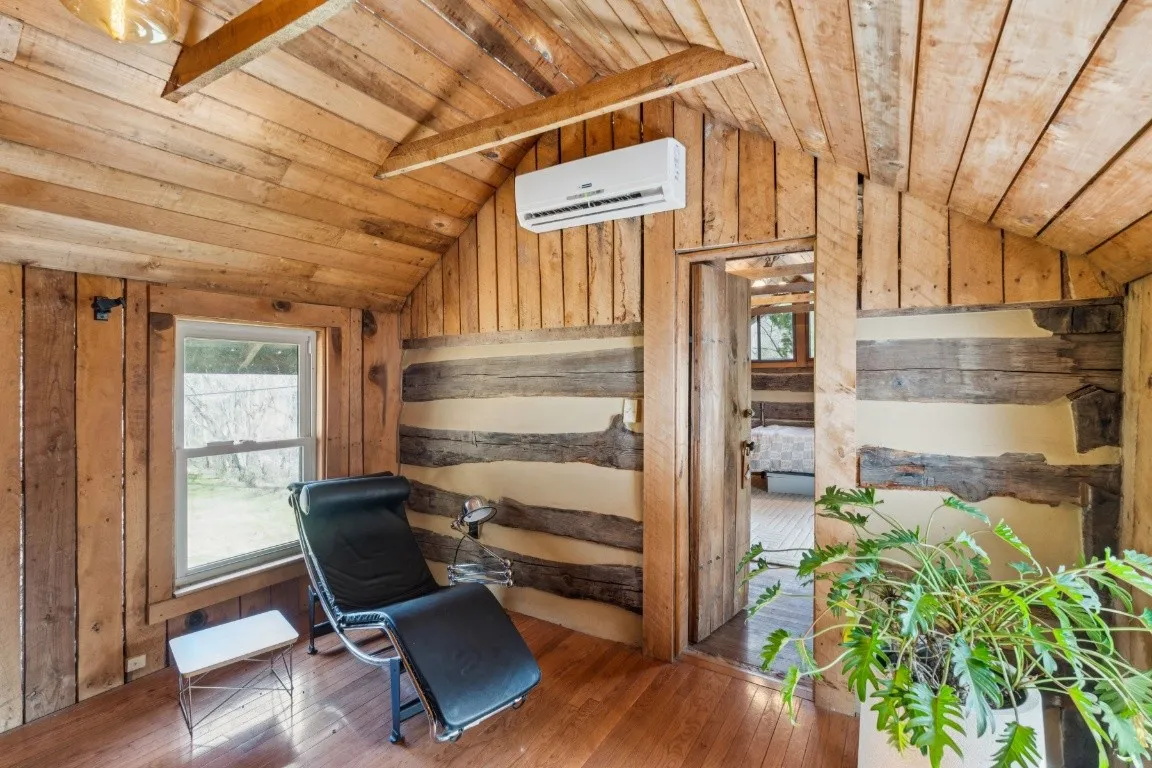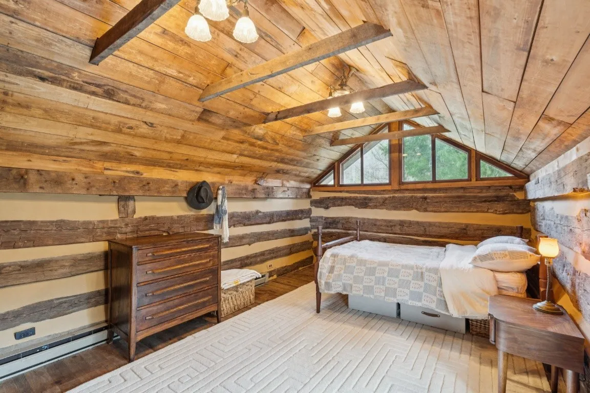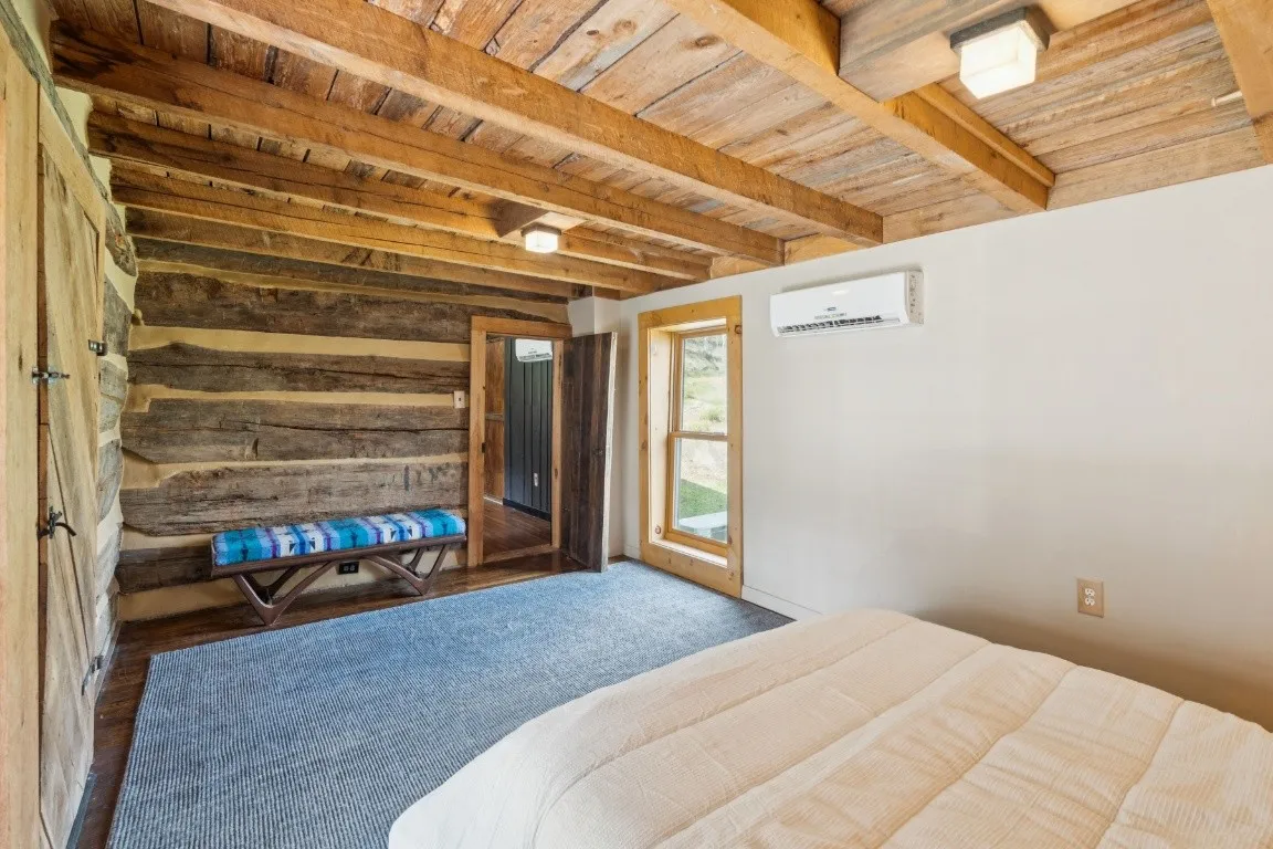 The home offers 1,781 square feet of living space with 2 bedrooms and 1 bathroom, featuring a spacious living room with vaulted ceilings, warm wood finishes, and abundant natural light that highlights the cabin’s rustic charm. A well-appointed kitchen with stainless steel appliances, a renovated bathroom and utility area, and updated fixtures throughout provide comfort while preserving the home’s historic character.