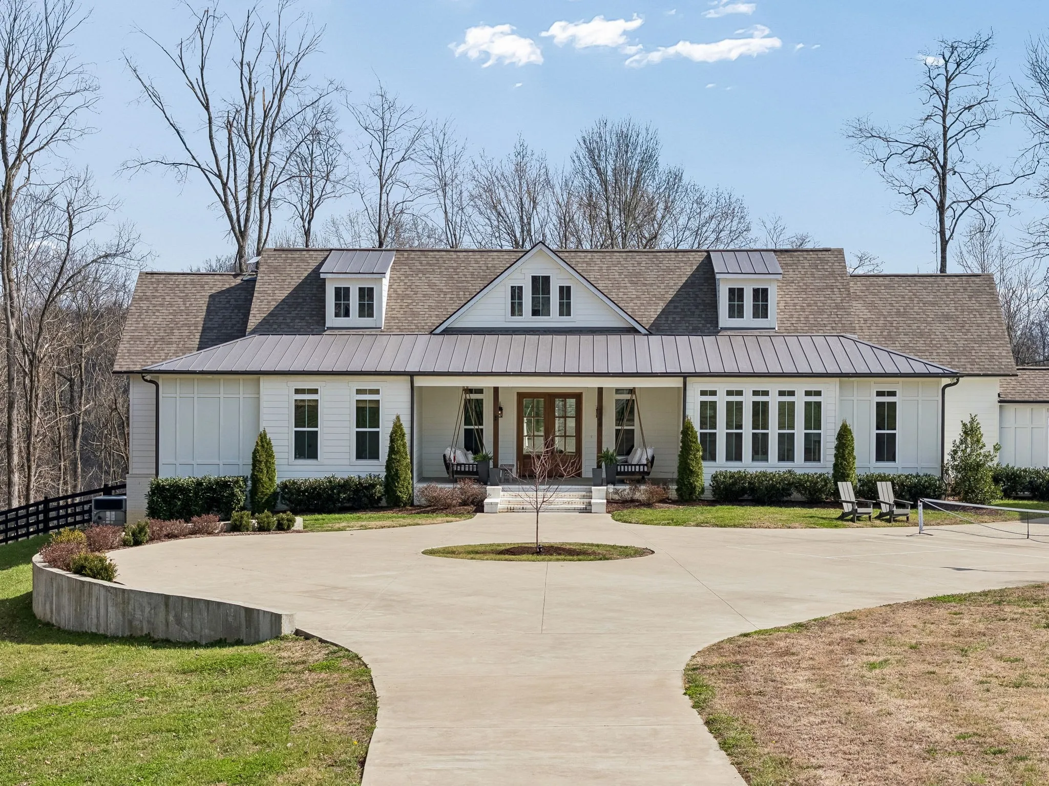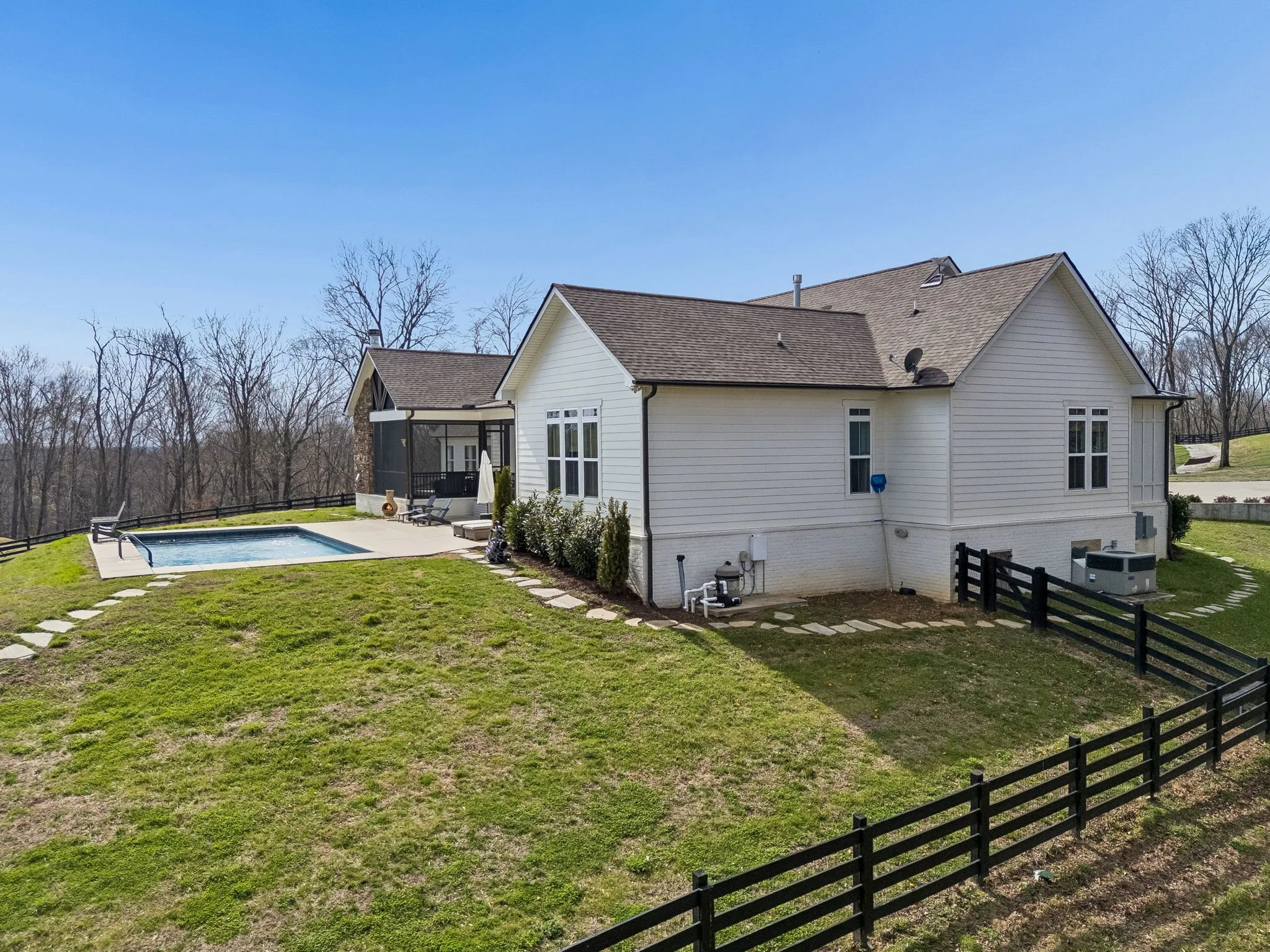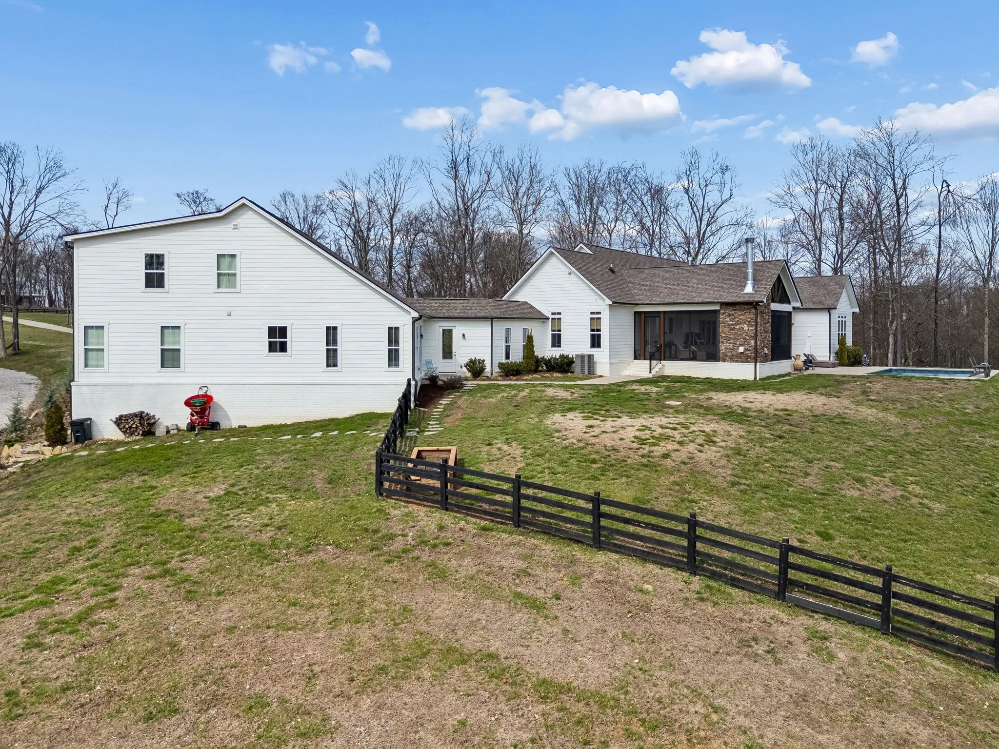 Welcome to your luxurious private retreat on 34 breathtaking acres, offering exceptional privacy & peaceful country living just minutes from local dining & shopping. Enter through a custom solar-powered iron security gate with remote access & solar lighting. This estate welcomes you as you drive to this stunning farmhouse designed for comfort, entertaining & functionality. Inside, the home features a spacious open floor plan that seamlessly connects the living, dining & kitchen areas, perfect for gatherings. Beautiful hardwood floors throughout & the main house thoughtfully designed layout offers one-level living with private full baths for every bedroom. This home is listed as a 4 Bedroom, but lives like a 6 Bedroom.The kitchen includes floating shelves, under-cabinet lighting & a custom pantry, while the primary suite & guest bedrooms feature custom closets. A unique feature in the living room is a hidden closet behind a secret bookshelf door. The oversized laundry room provides space for two sets of W/Ds. A 1,685 sq. ft. attached guest house offers the perfect space for in-laws, family or guests, complete with living area, kitchen, laundry & sleeping quarters, +Toto toilets. Outdoor living is just as impressive with an in-ground pool, enclosed back patio & a huge covered patio with wood-burning fireplace, creating the ideal setting for relaxing or entertaining. Enjoy pickleball on the court set up on the driveway complete w/net & lighting. The 3 + car garage features epoxy floors, a workout area & a large utility sink that doubles as a dog-washing station. The land has been thoughtfully improved with cleared pasture areas, landscaping for erosion control, & a 2nd wooden gate with gravel access to a pad ready for a future barn or build site. Even the charming chicken coop stands out with a shingle roof, wallpaper interior & predator-protected run. Added upgrades include a new pool robot sweeper, UV light system for the HVAC system, & well system add peace of mind.