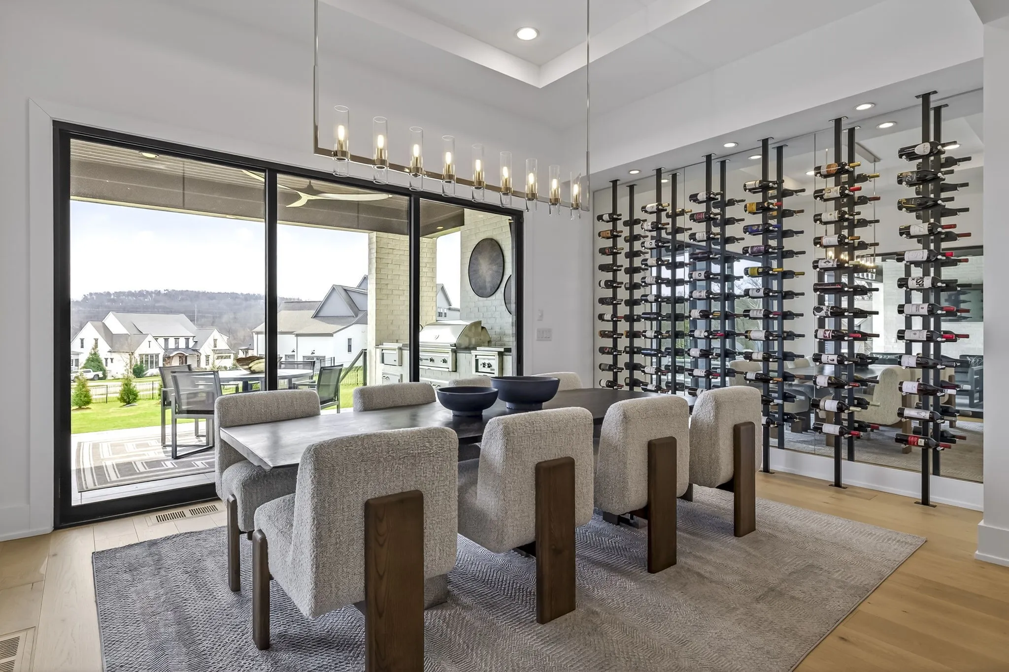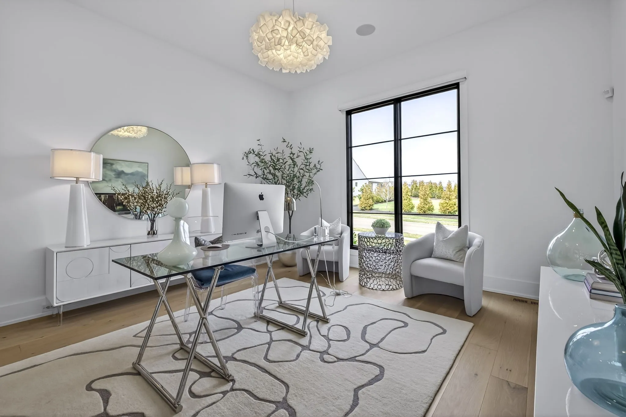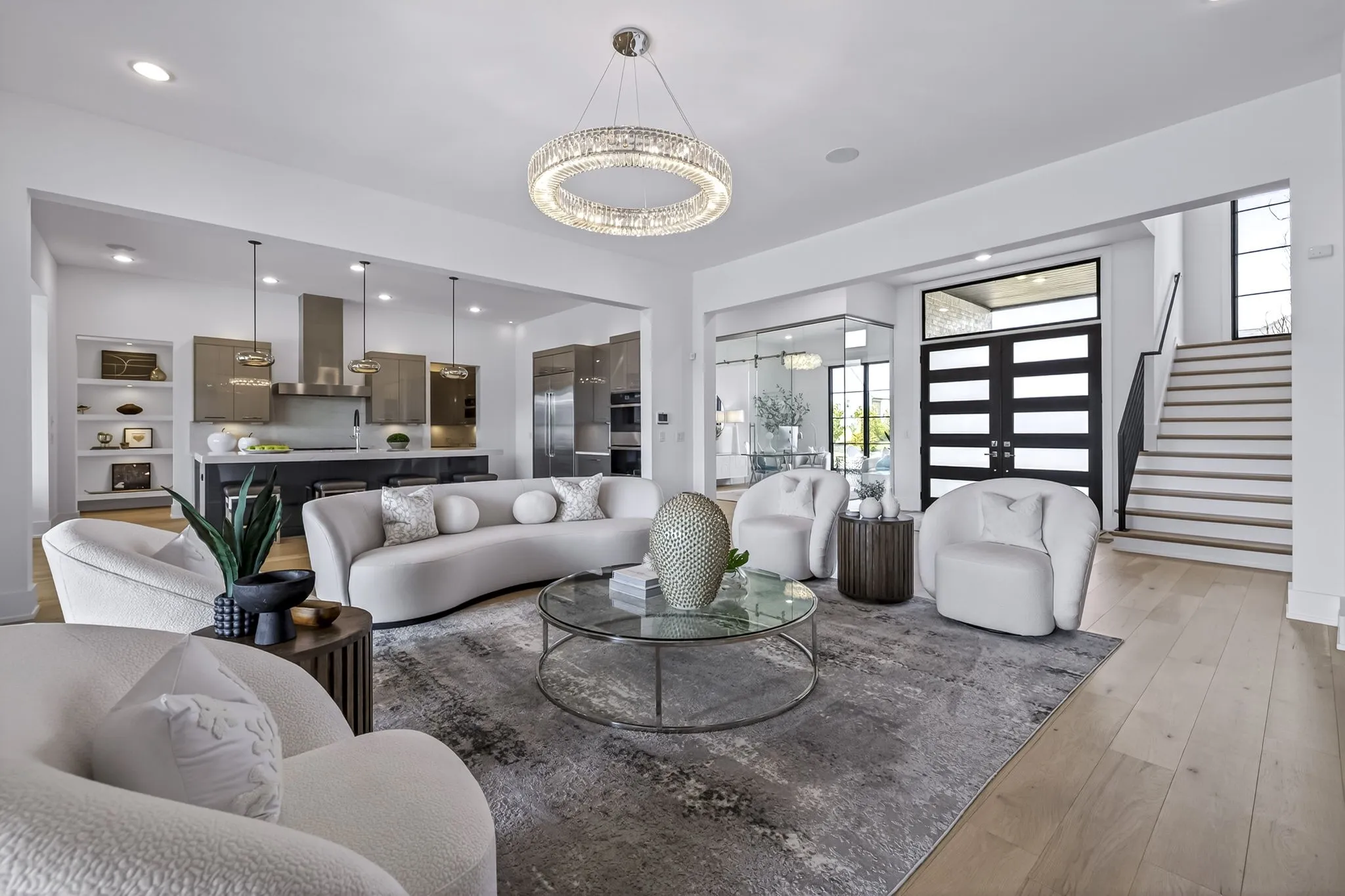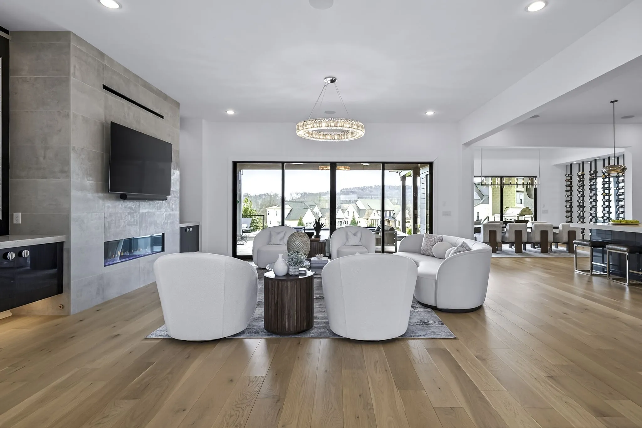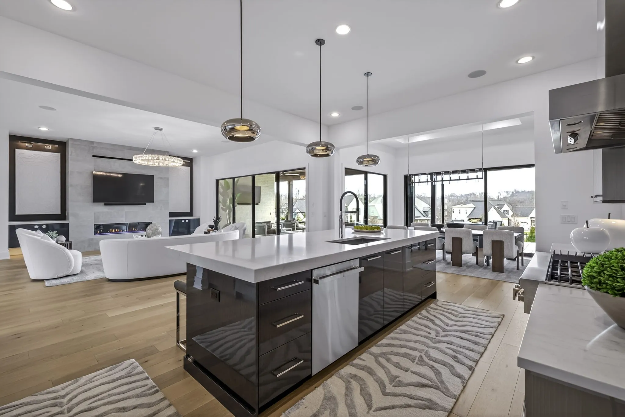 At the heart of this gorgeous property is a beautifully designed gourmet kitchen featuring frameless custom cabinetry, top-of-the-line JennAir appliances, and a working pantry for exceptional storage and organization. The kitchen flows seamlessly into the main living and dining spaces, making it easy to stay connected while cooking, hosting, or spending time together. Floor-to-ceiling windows and oversized sliding doors fill the home with natural light and showcase views of the surrounding property. The inviting living room features a sleek linear gas fireplace with floating cabinetry, creating a warm space for relaxing evenings or entertaining guests, while a custom glass-walled office provides a quiet and inspiring work-from-home setting.