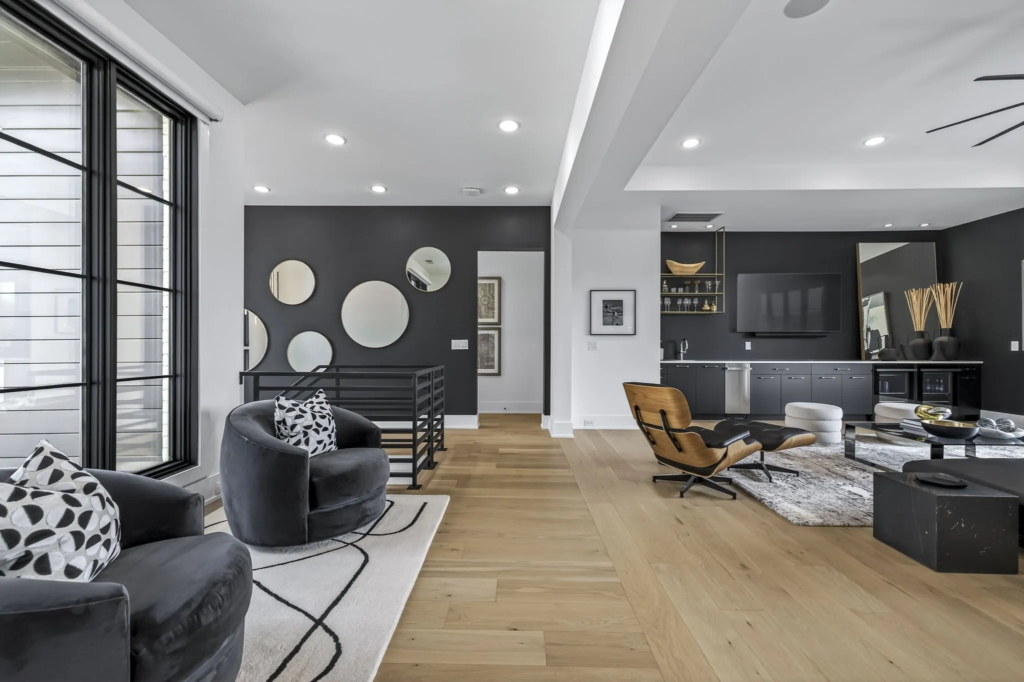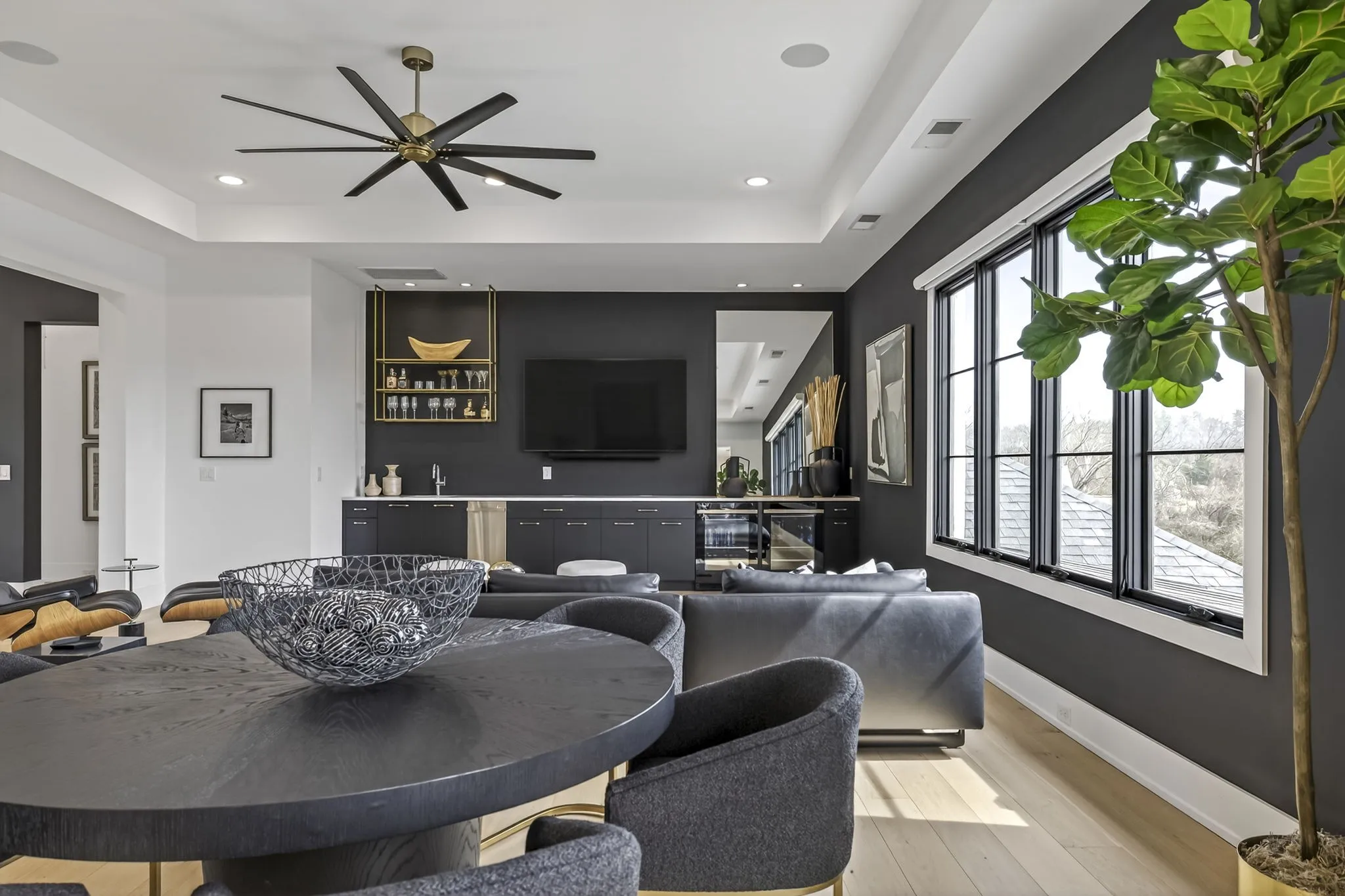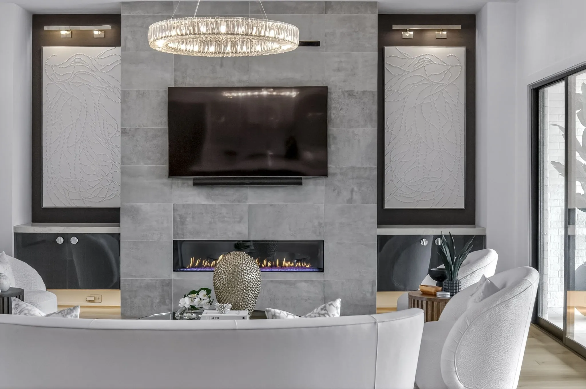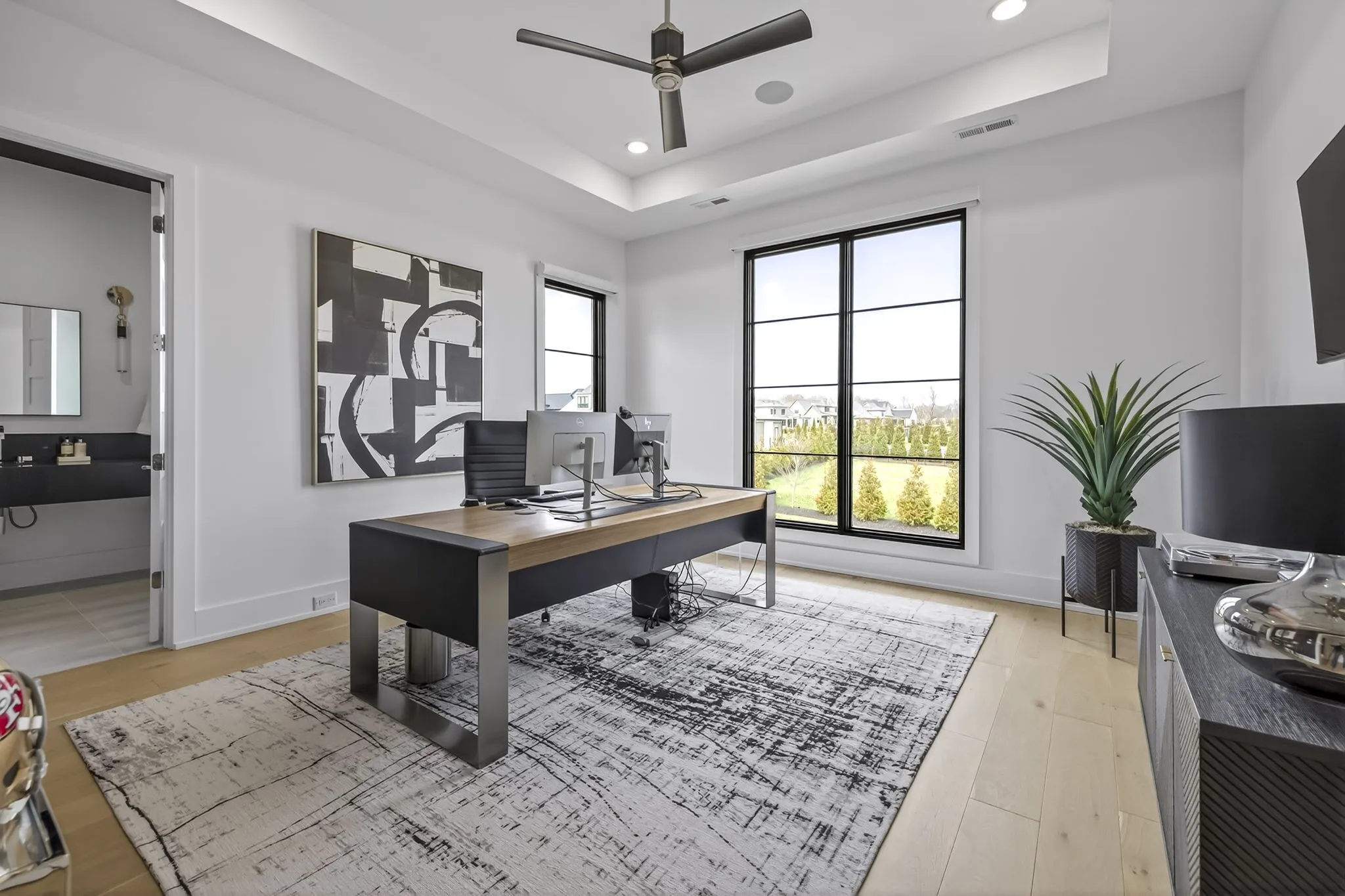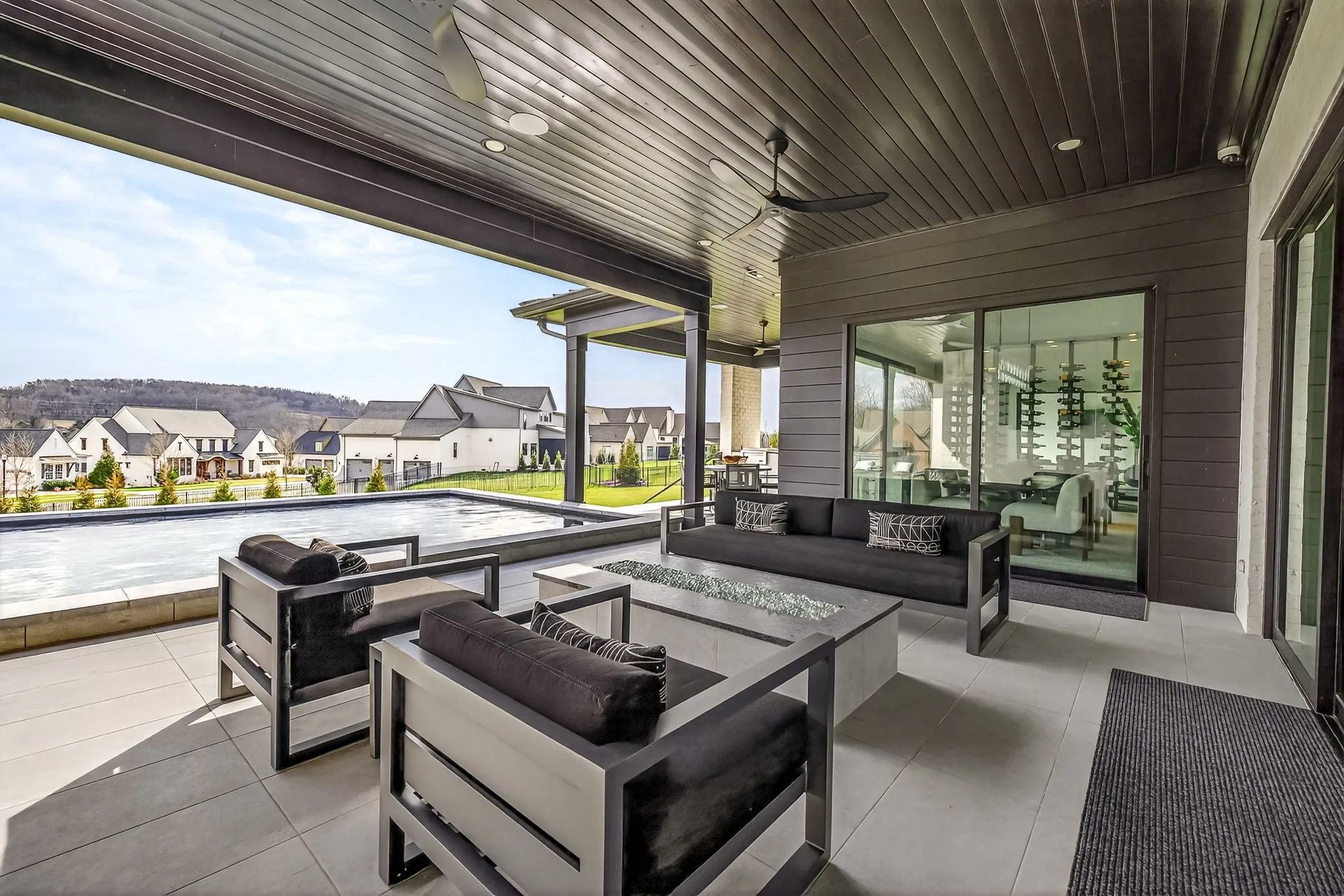 At the heart of this gorgeous property is a beautifully designed gourmet kitchen featuring frameless custom cabinetry, top-of-the-line JennAir appliances, and a working pantry for exceptional storage and organization. The kitchen flows seamlessly into the main living and dining spaces, making it easy to stay connected while cooking, hosting, or spending time together. Floor-to-ceiling windows and oversized sliding doors fill the home with natural light and showcase views of the surrounding property. The inviting living room features a sleek linear gas fireplace with floating cabinetry, creating a warm space for relaxing evenings or entertaining guests, while a custom glass-walled office provides a quiet and inspiring work-from-home setting.