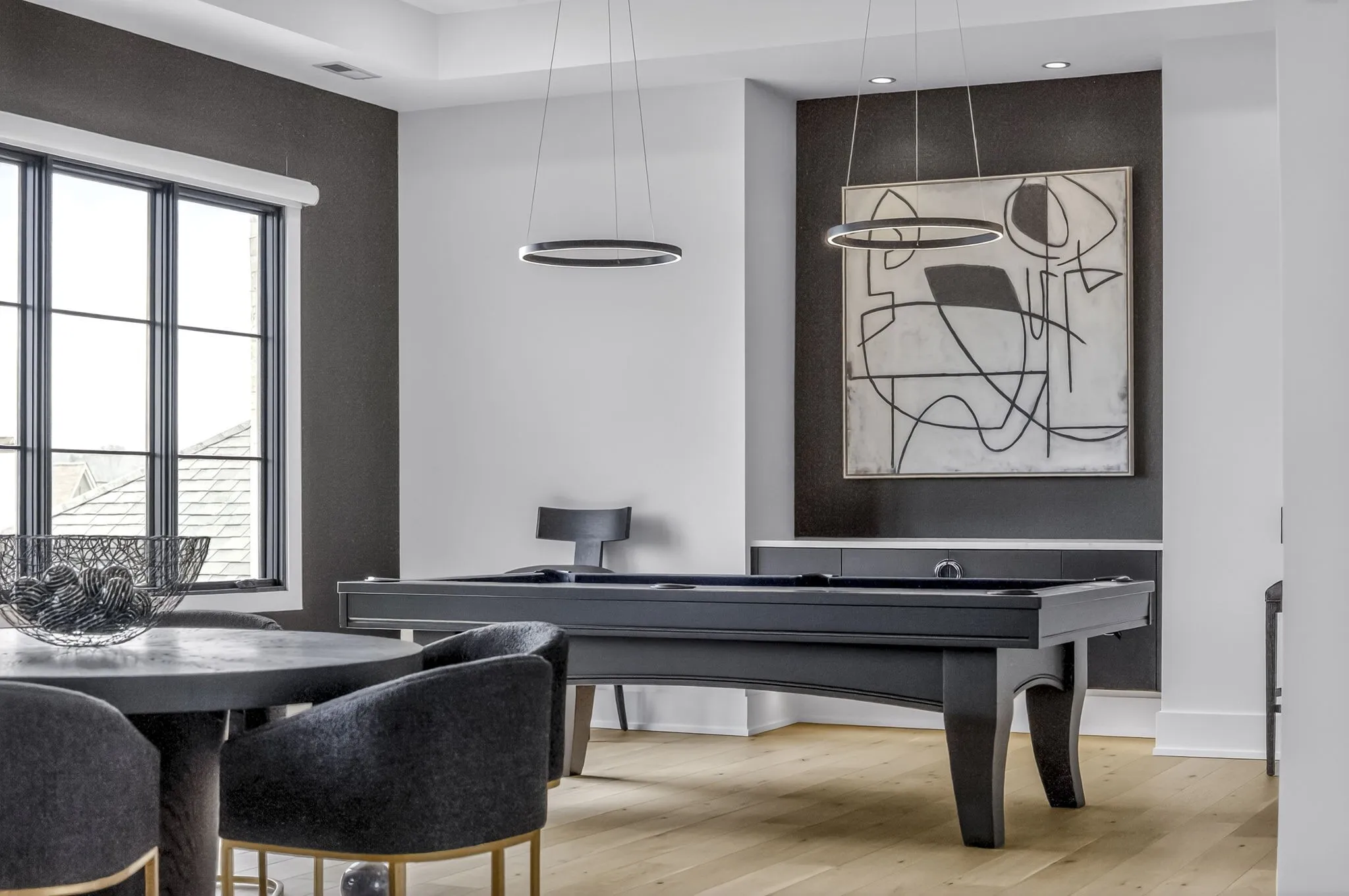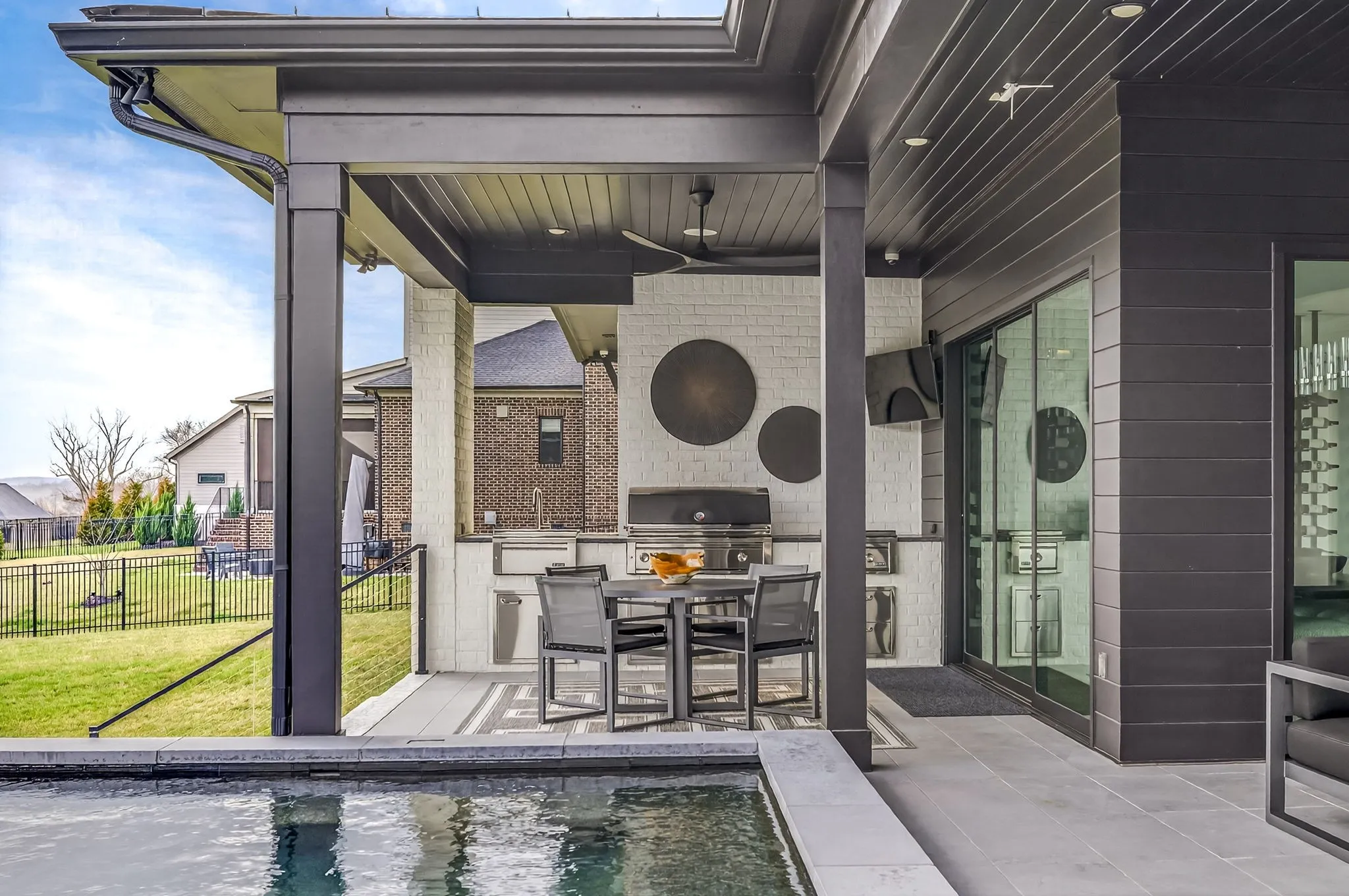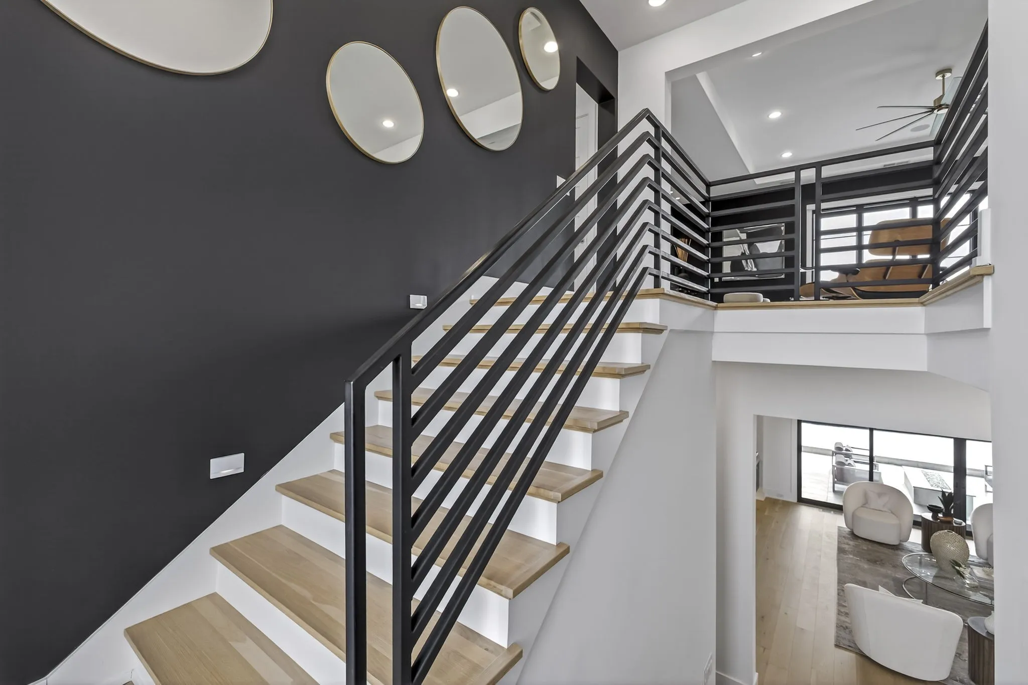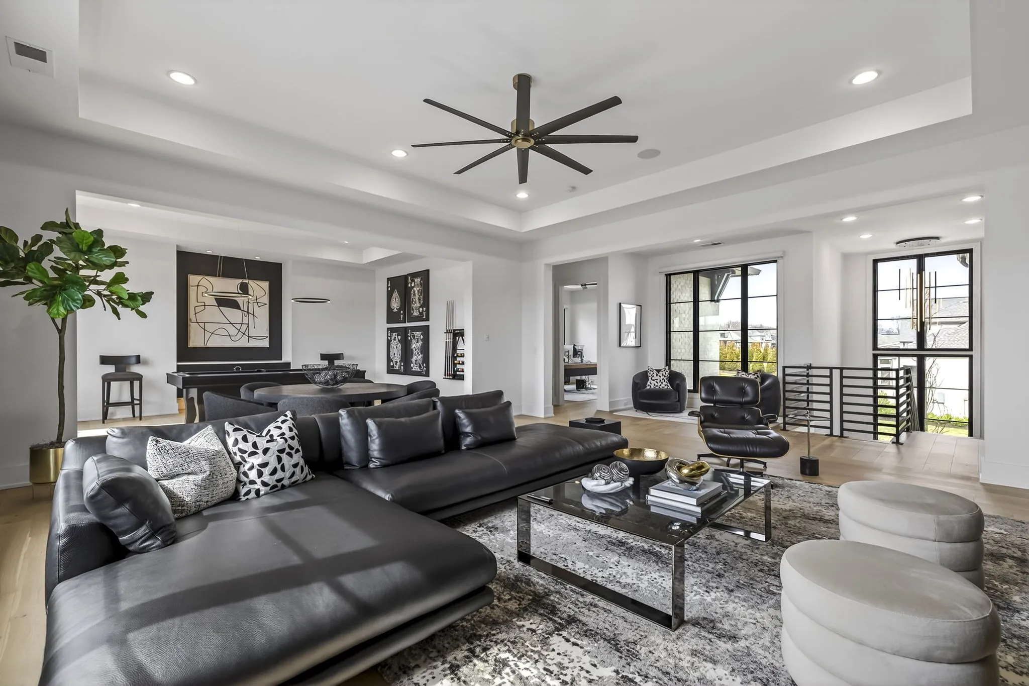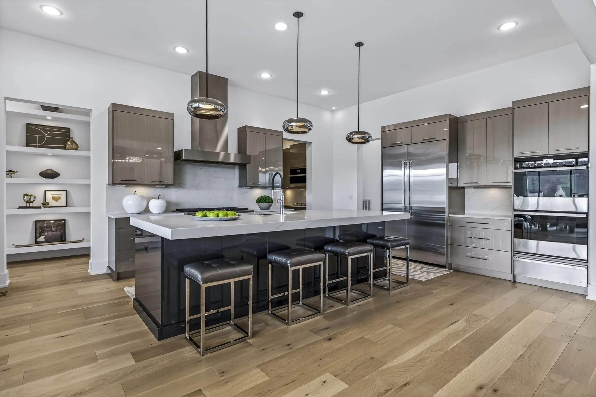 At the heart of this gorgeous property is a beautifully designed gourmet kitchen featuring frameless custom cabinetry, top-of-the-line JennAir appliances, and a working pantry for exceptional storage and organization. The kitchen flows seamlessly into the main living and dining spaces, making it easy to stay connected while cooking, hosting, or spending time together. Floor-to-ceiling windows and oversized sliding doors fill the home with natural light and showcase views of the surrounding property. The inviting living room features a sleek linear gas fireplace with floating cabinetry, creating a warm space for relaxing evenings or entertaining guests, while a custom glass-walled office provides a quiet and inspiring work-from-home setting.