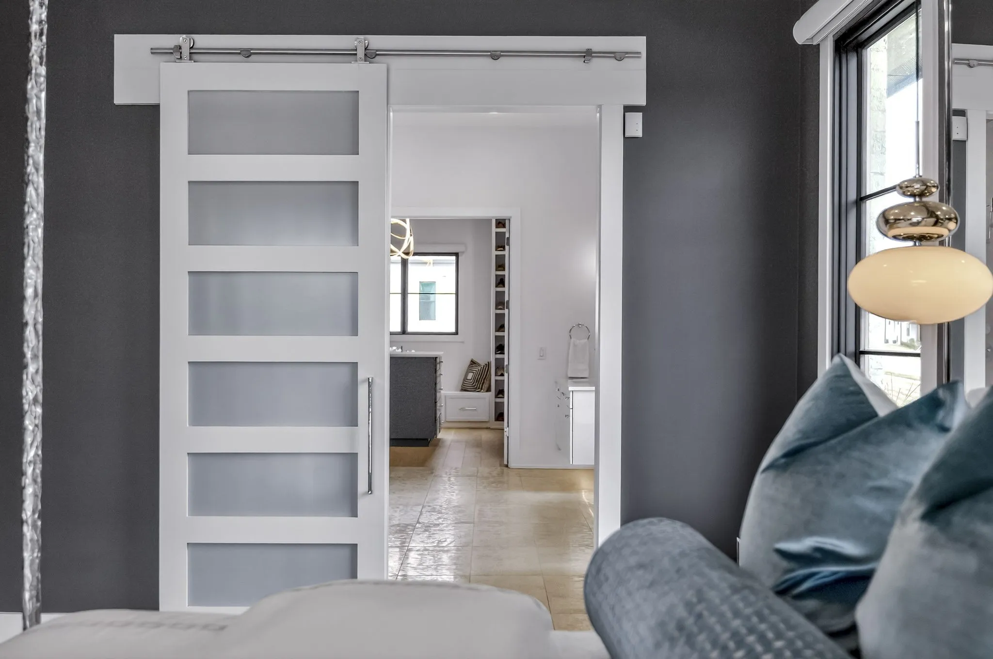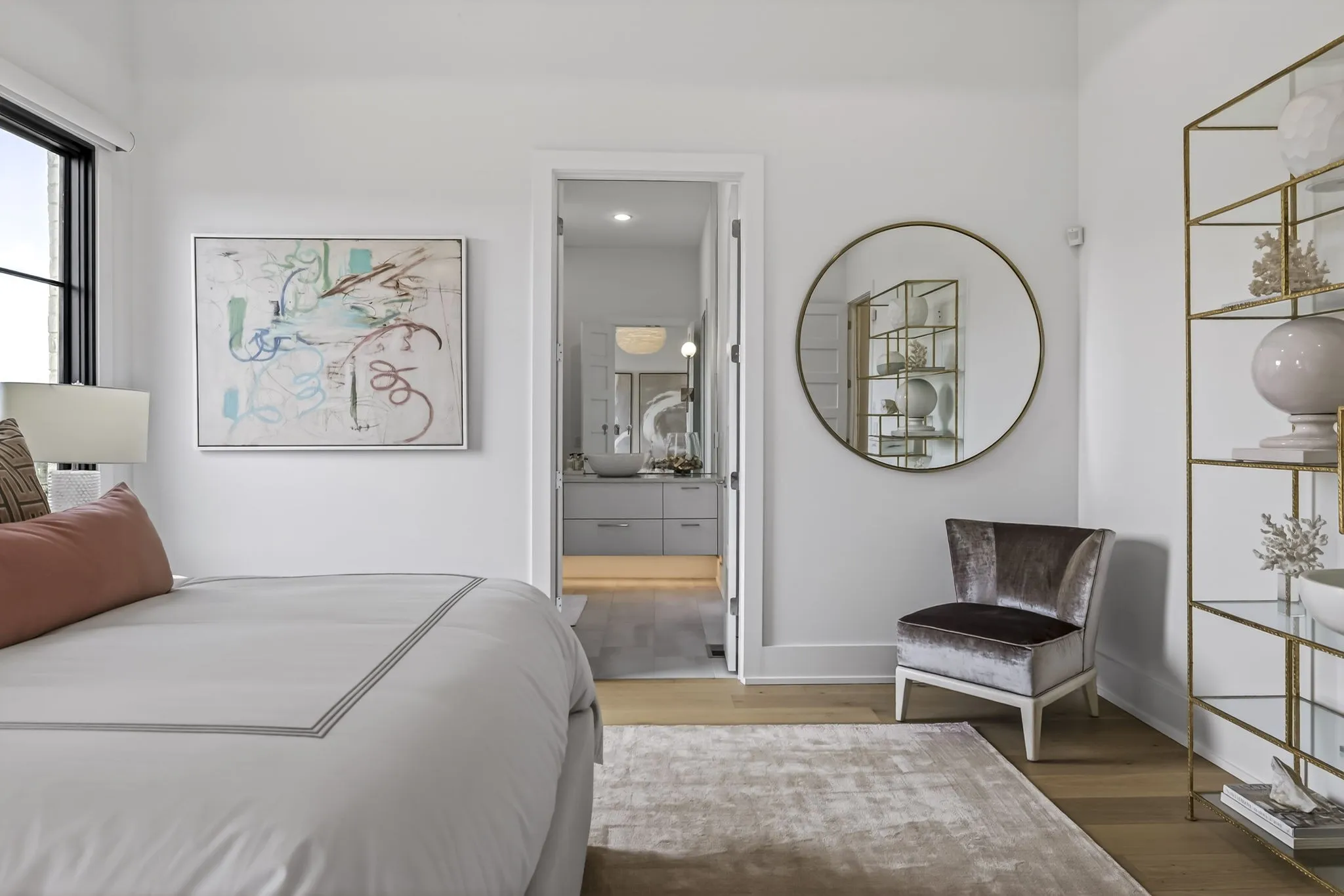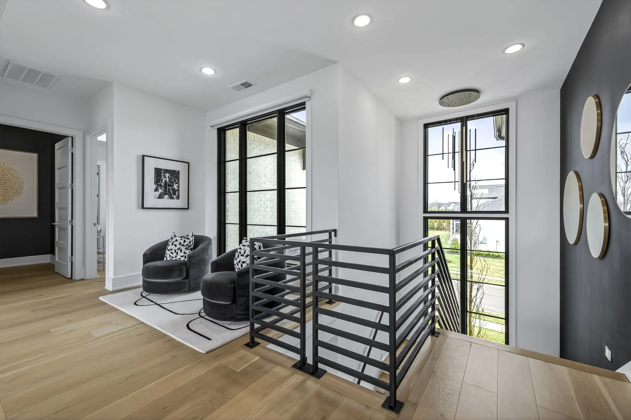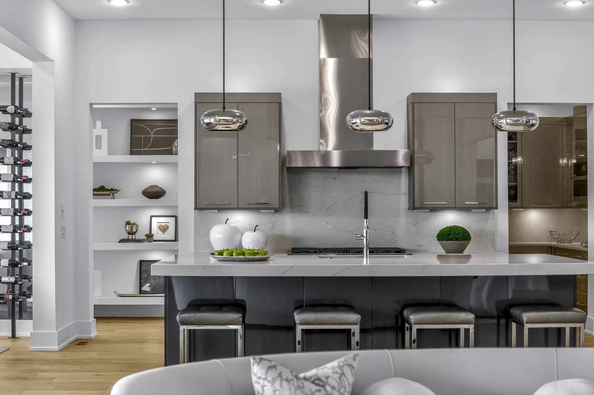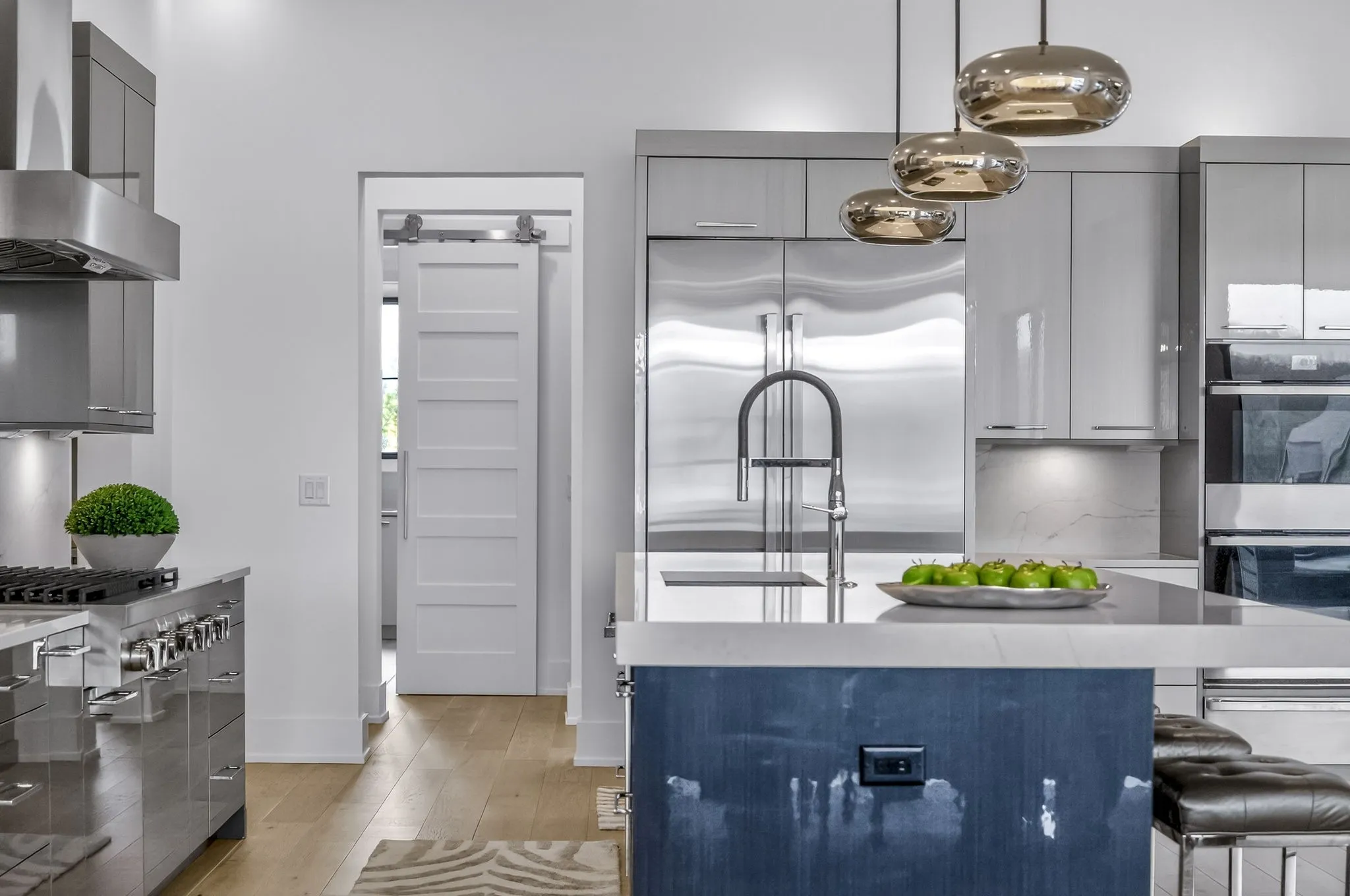 At the heart of this gorgeous property is a beautifully designed gourmet kitchen featuring frameless custom cabinetry, top-of-the-line JennAir appliances, and a working pantry for exceptional storage and organization. The kitchen flows seamlessly into the main living and dining spaces, making it easy to stay connected while cooking, hosting, or spending time together. Floor-to-ceiling windows and oversized sliding doors fill the home with natural light and showcase views of the surrounding property. The inviting living room features a sleek linear gas fireplace with floating cabinetry, creating a warm space for relaxing evenings or entertaining guests, while a custom glass-walled office provides a quiet and inspiring work-from-home setting.