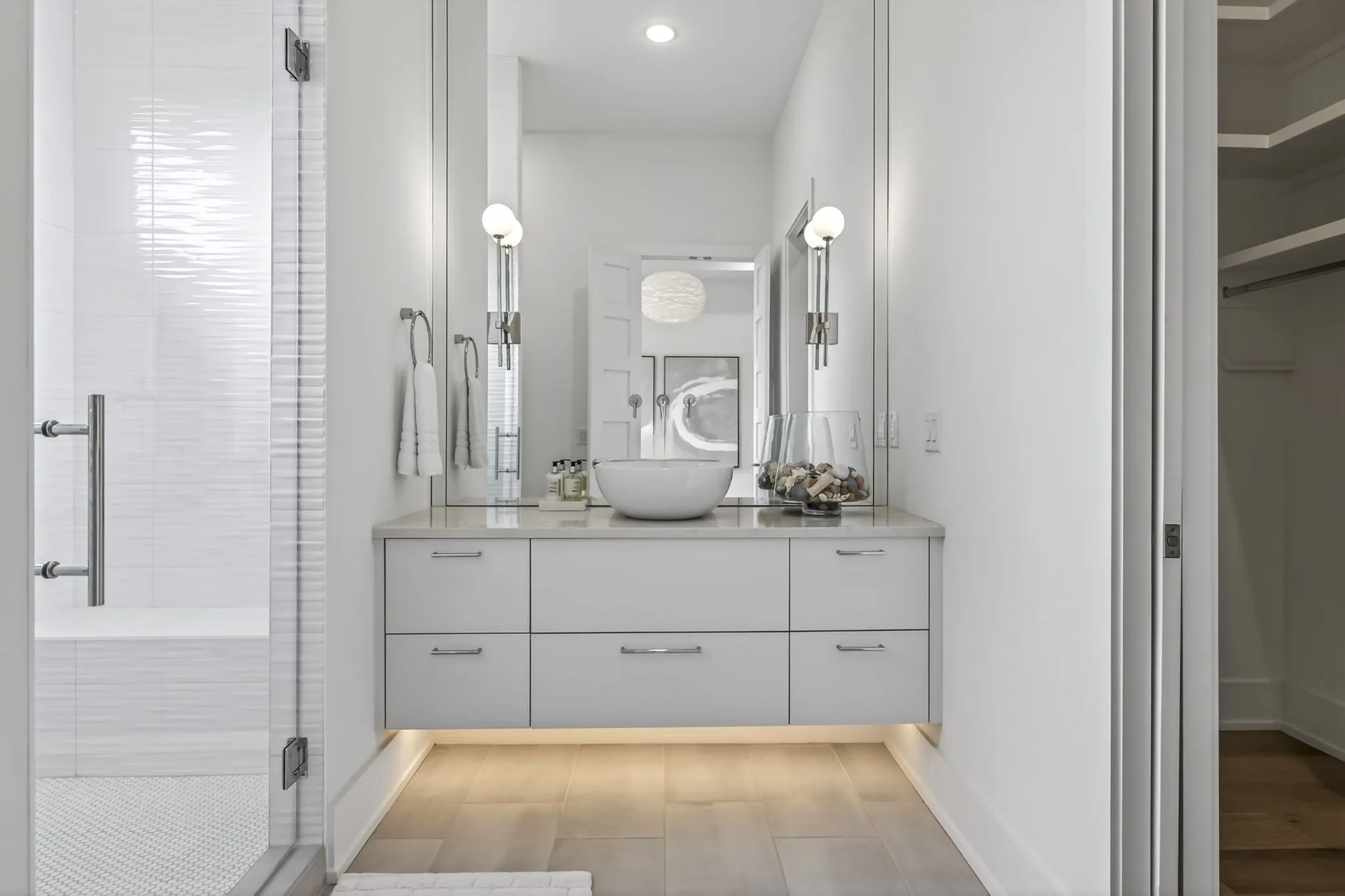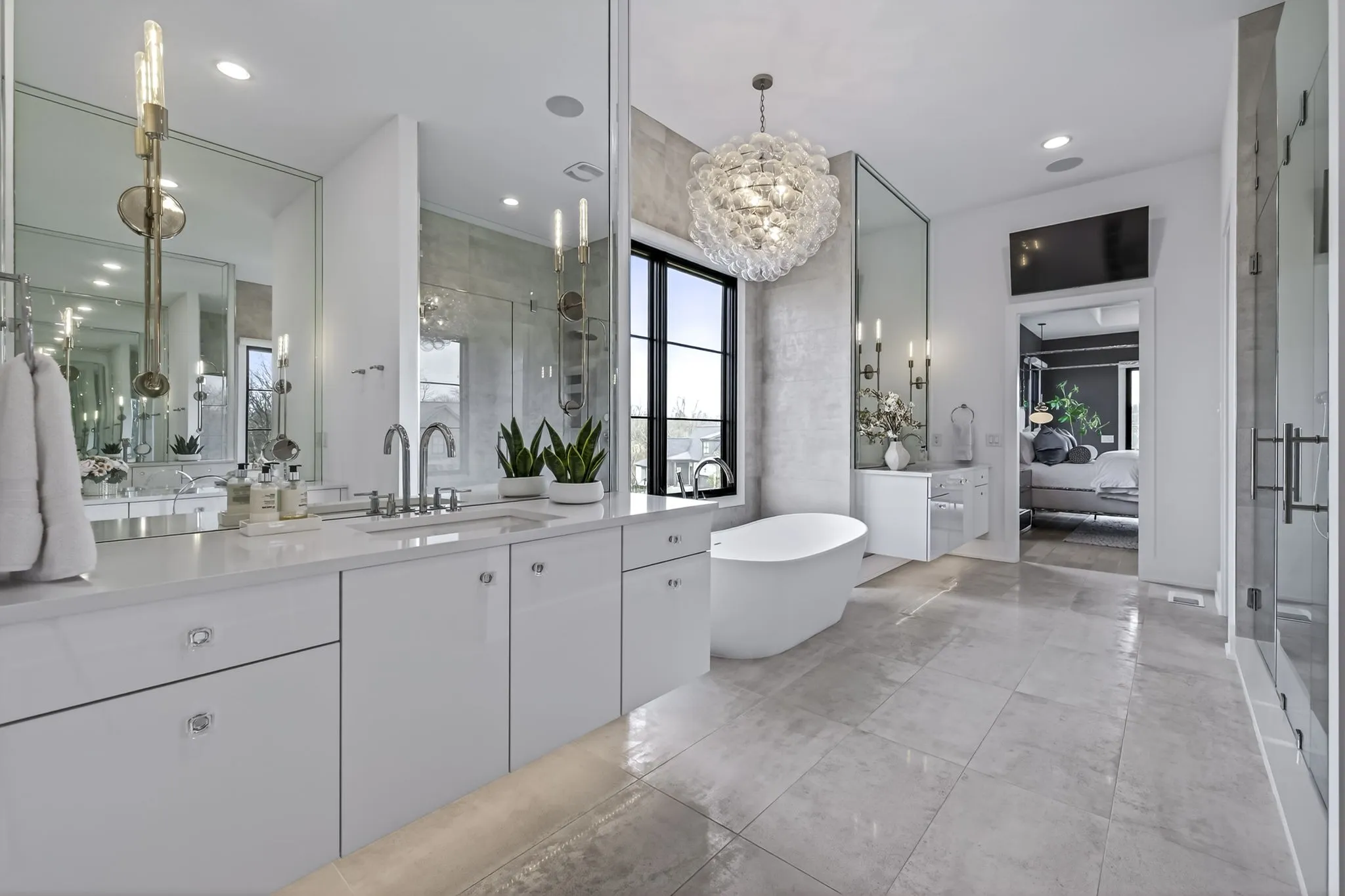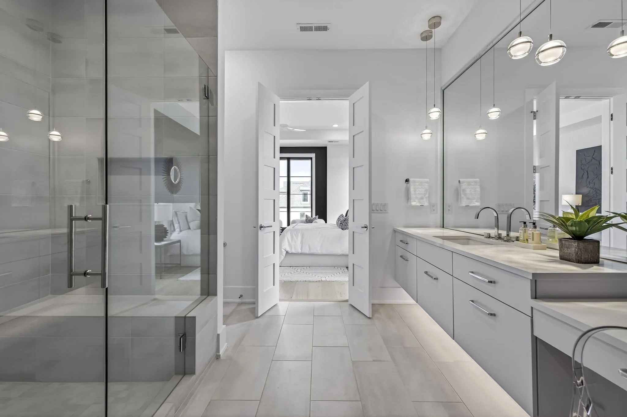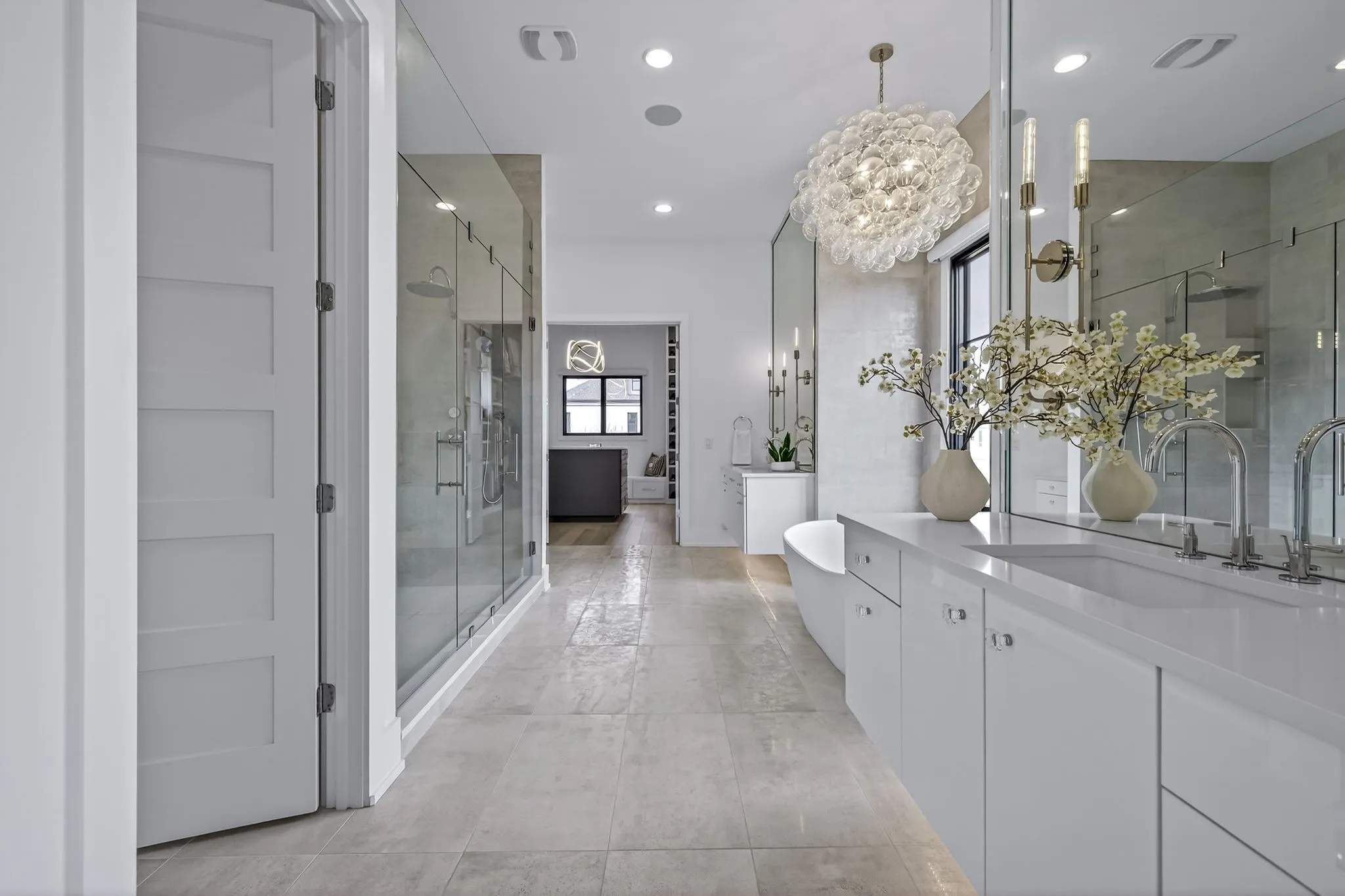 The main-level owner’s suite offers a peaceful retreat with a spa-inspired bath featuring an oversized walk-in shower, freestanding soaking tub, double floating vanities, and a spacious custom walk-in closet. A private guest suite on the main level is perfect forvisitors or multigenerational living.