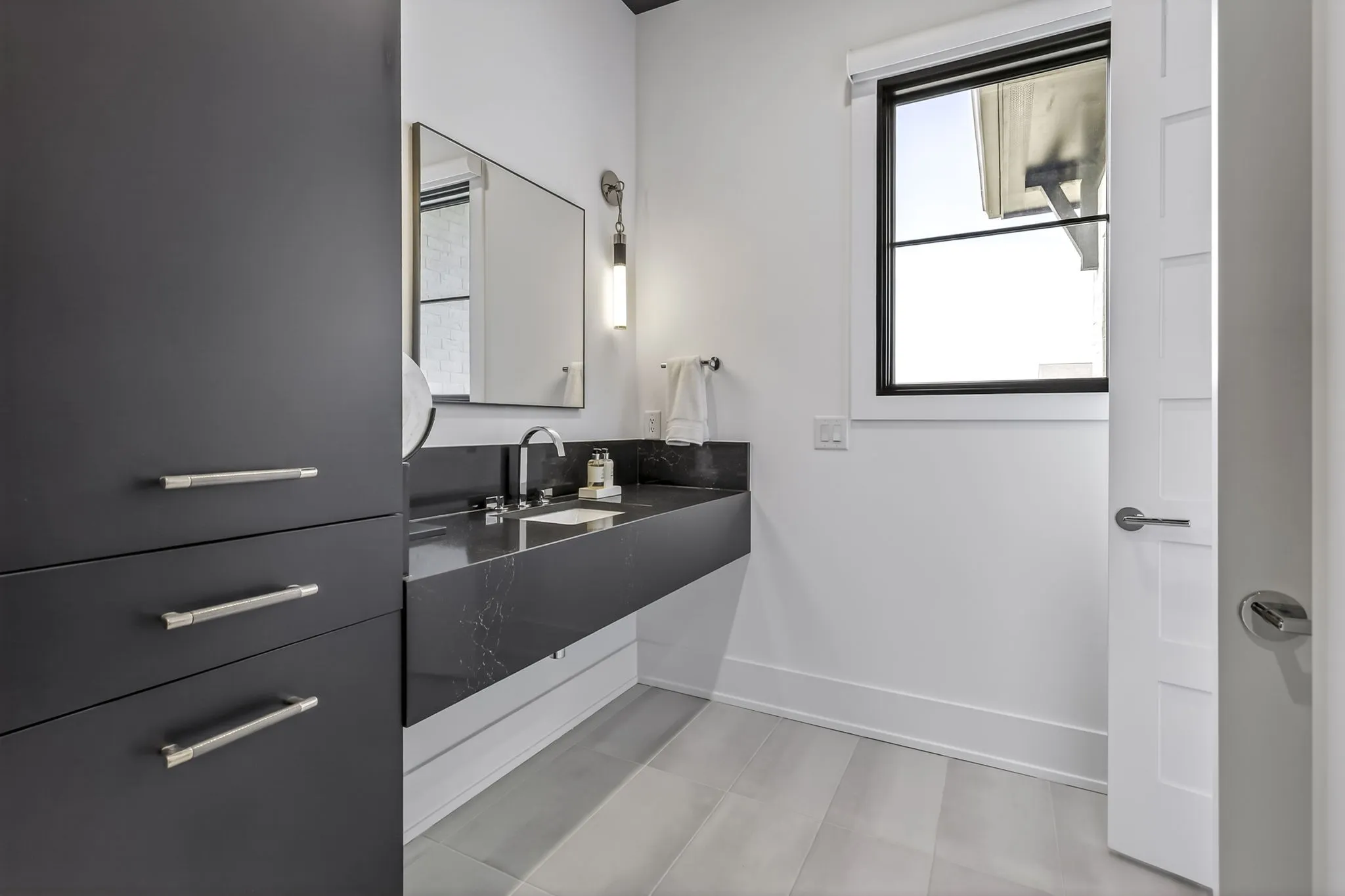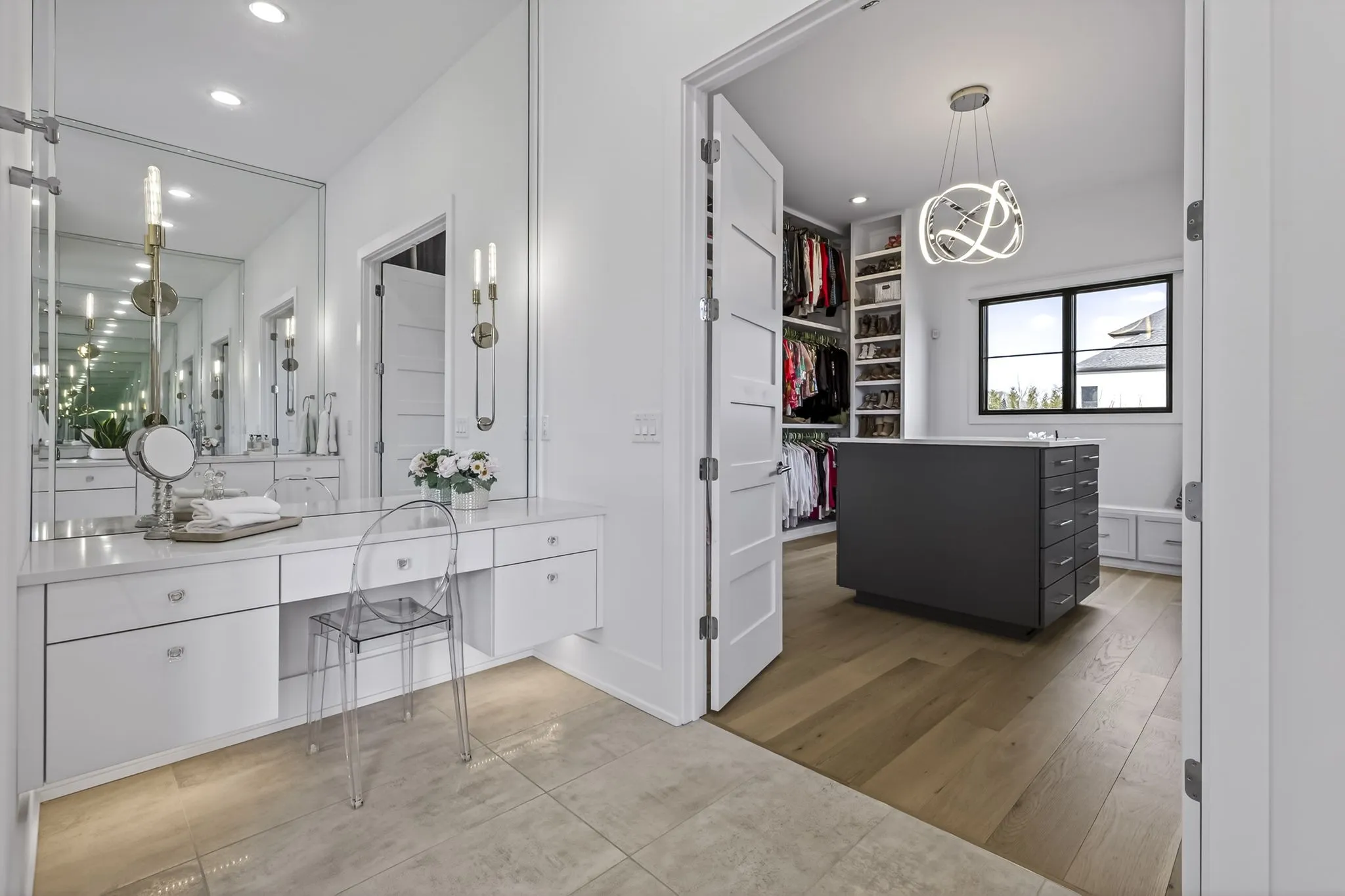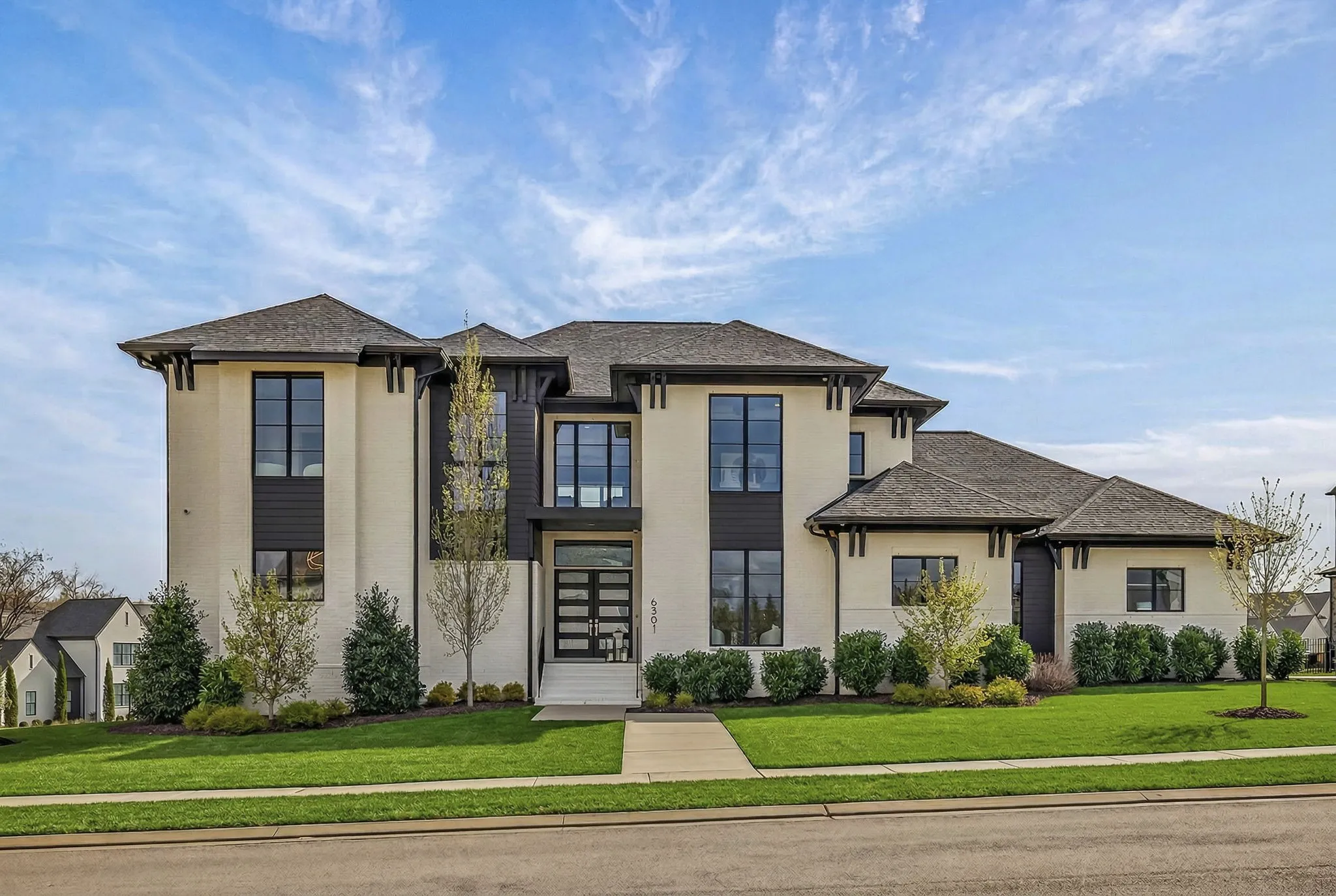 The main-level owner’s suite offers a peaceful retreat with a spa-inspired bath featuring an oversized walk-in shower, freestanding soaking tub, double floating vanities, and a spacious custom walk-in closet. A private guest suite on the main level is perfect forvisitors or multigenerational living.