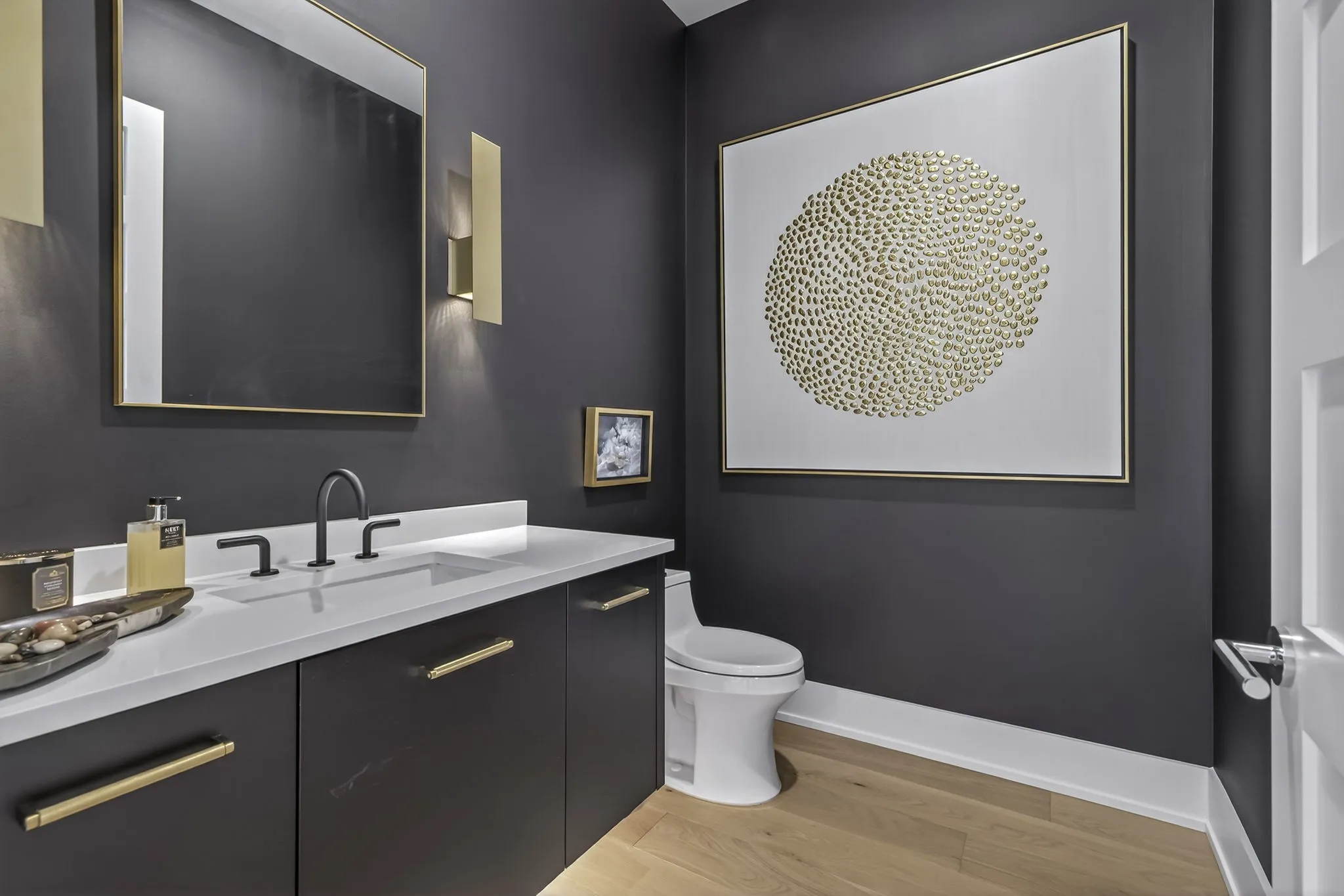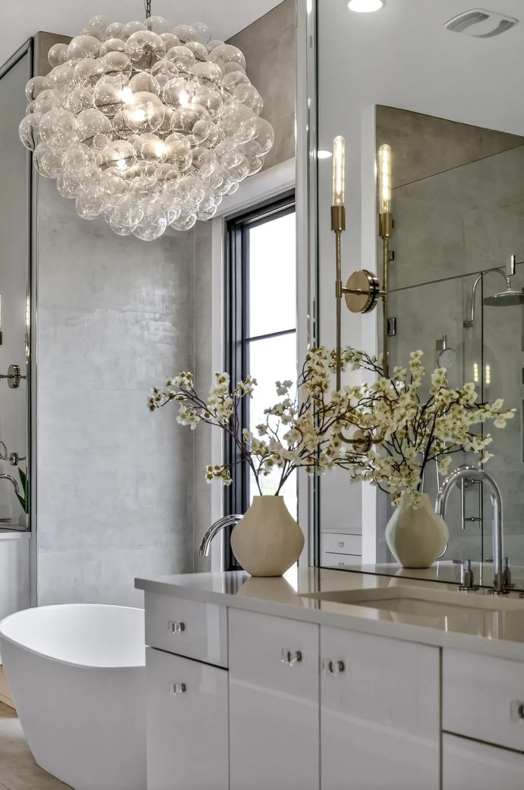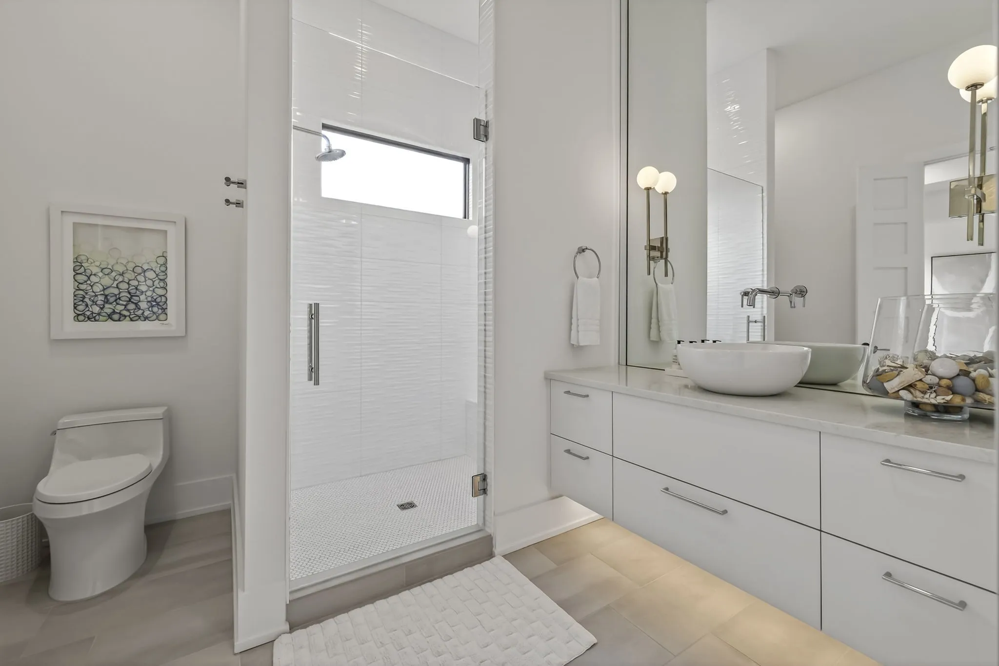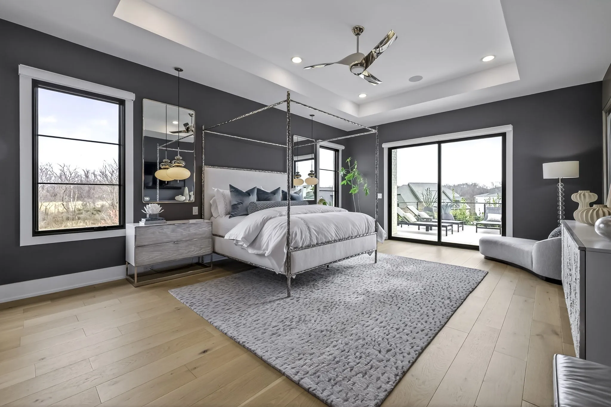 The main-level owner’s suite offers a peaceful retreat with a spa-inspired bath featuring an oversized walk-in shower, freestanding soaking tub, double floating vanities, and a spacious custom walk-in closet. A private guest suite on the main level is perfect forvisitors or multigenerational living.