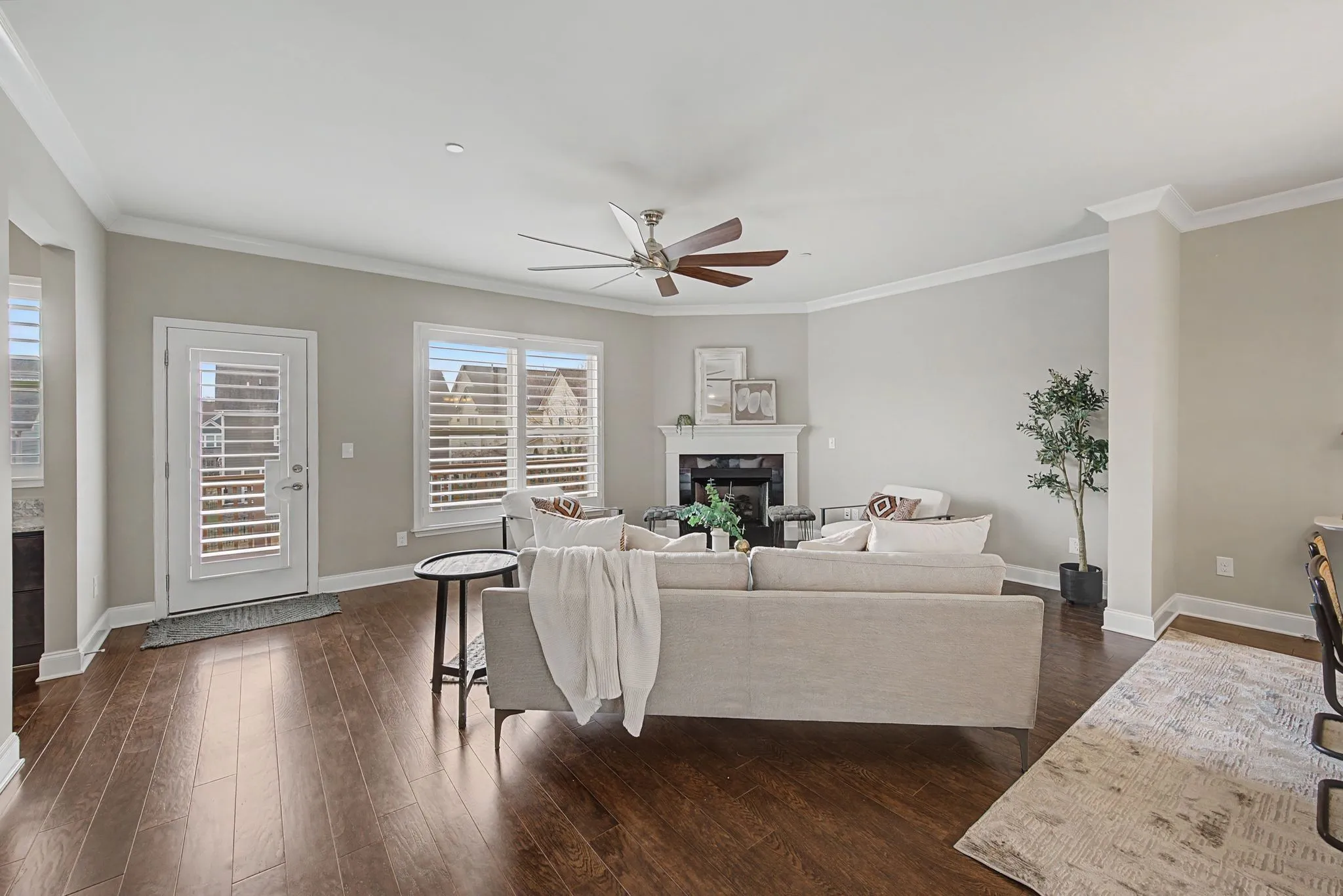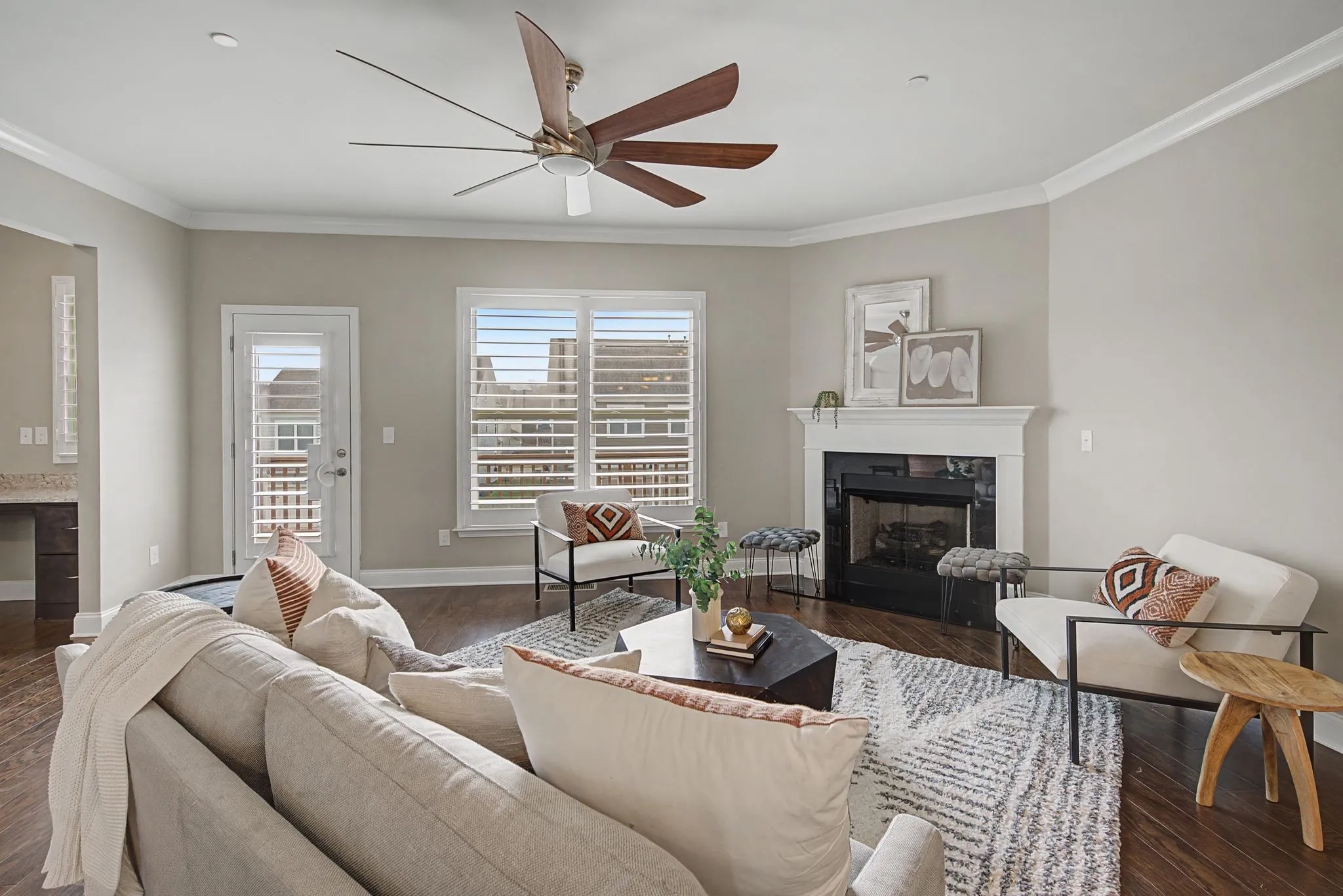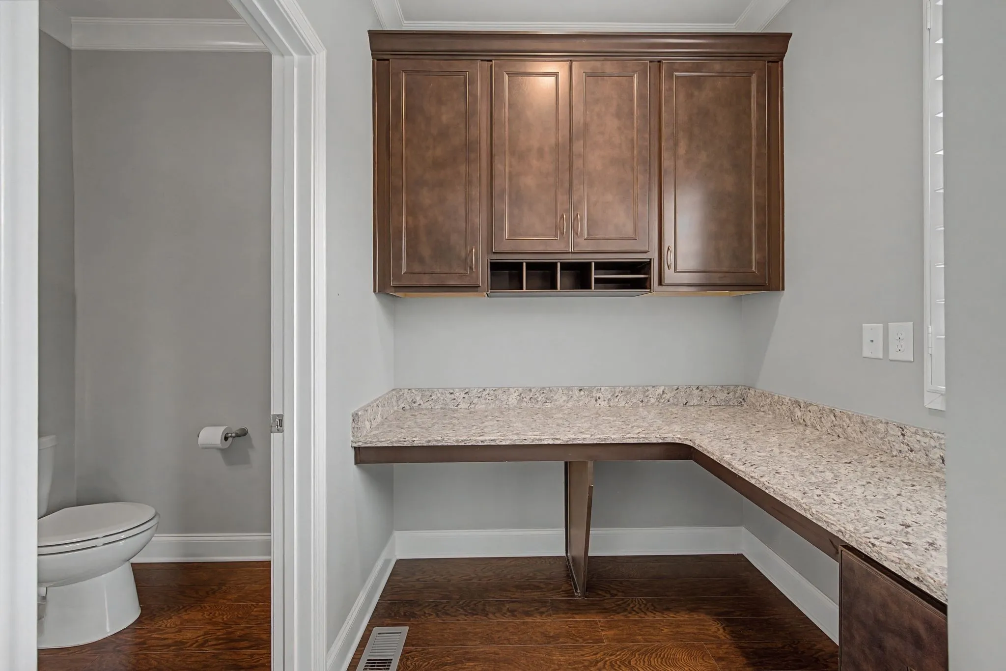 Inside, you’ll find hardwood floors, crown molding, wrought iron stair spindles, and custom plantation-style shutters throughout, adding timeless character. The kitchen features granite countertops that continue into the bathrooms for a cohesive design. An upgraded bar or dedicated work-from-home space adds flexibility, while the enhanced owner’s bath provides a refined retreat.