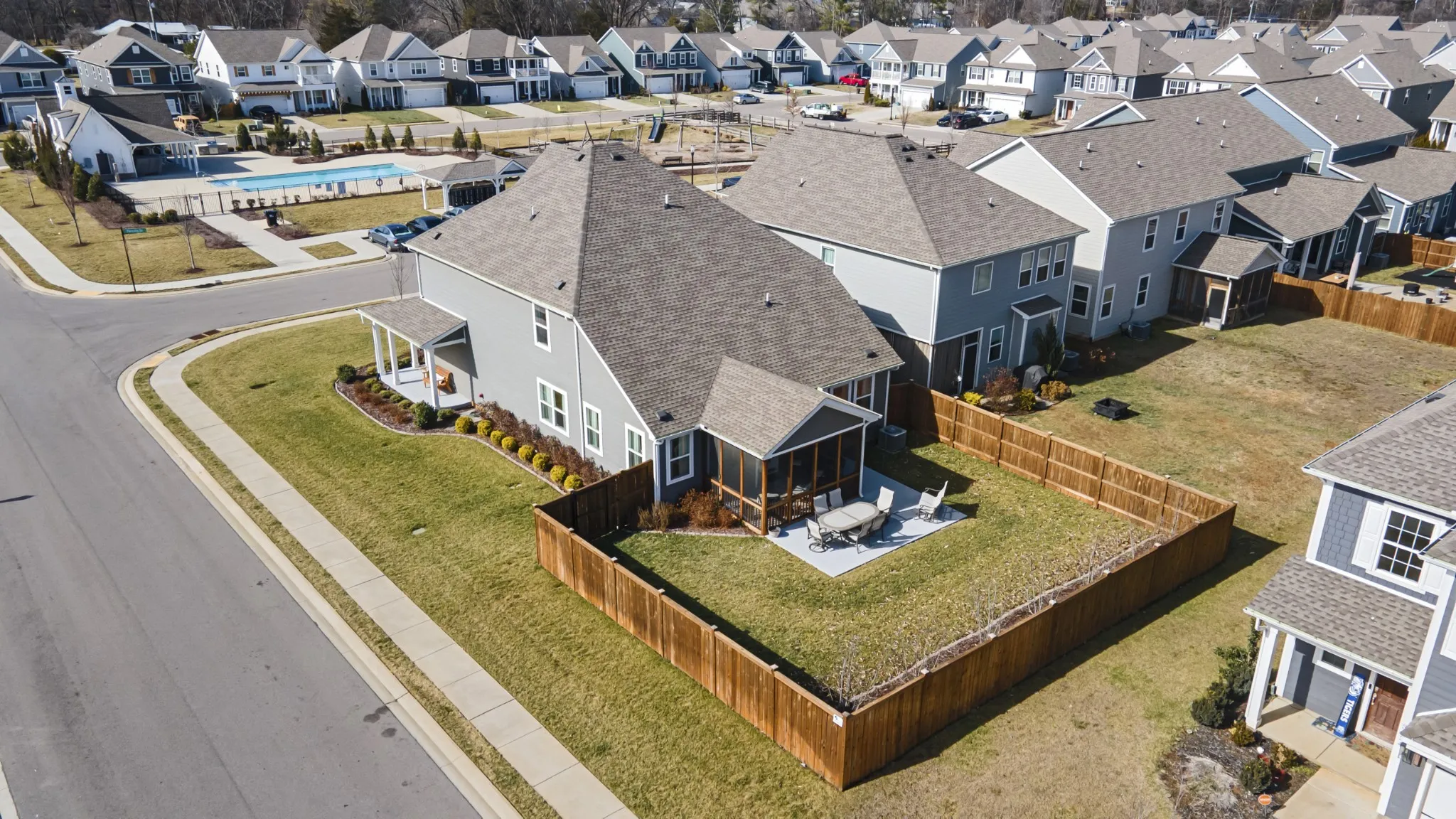 Outdoor relaxation is a breeze with a lovely front porch, large screened back patio, privacy fenced yard, professionally landscaped/irrigation, and access to common outdoor space. On warm days, enjoy the nearby communal pool, perfect for cooling off and socializing. The attached garage ensures convenient parking with plenty of room for your vehicles and gear.