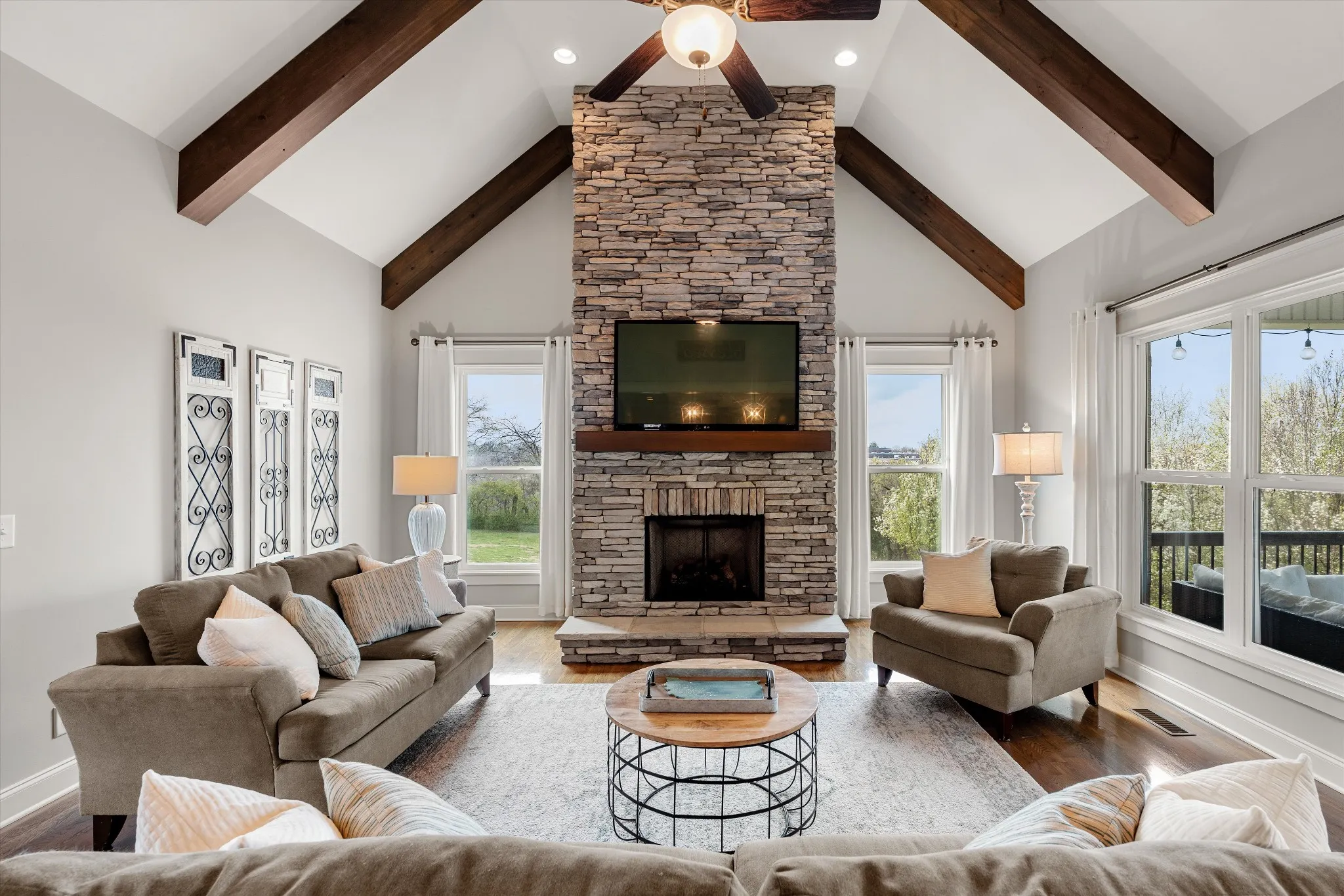 Imagine coming home to a beautifully crafted Eastland Construction Home in the highly sought-after Nichols Vale Community, where Scenic Rolling Hills and Sidewalk-Lined Streets welcome you. As you arrive, the timeless All-Brick exterior, welcoming Front Porch, and 3-car Side-Entry Garage set the tone for the craftsmanship found throughout. Step inside to Gorgeous Hardwood Floors leading into the Great Room, where Soaring Ceilings with Wood Beams and a Stacked Stone Gas Fireplace create an inviting space for gathering. The Open Layout is perfect for hosting, centered around a Standout Kitchen with Quartz