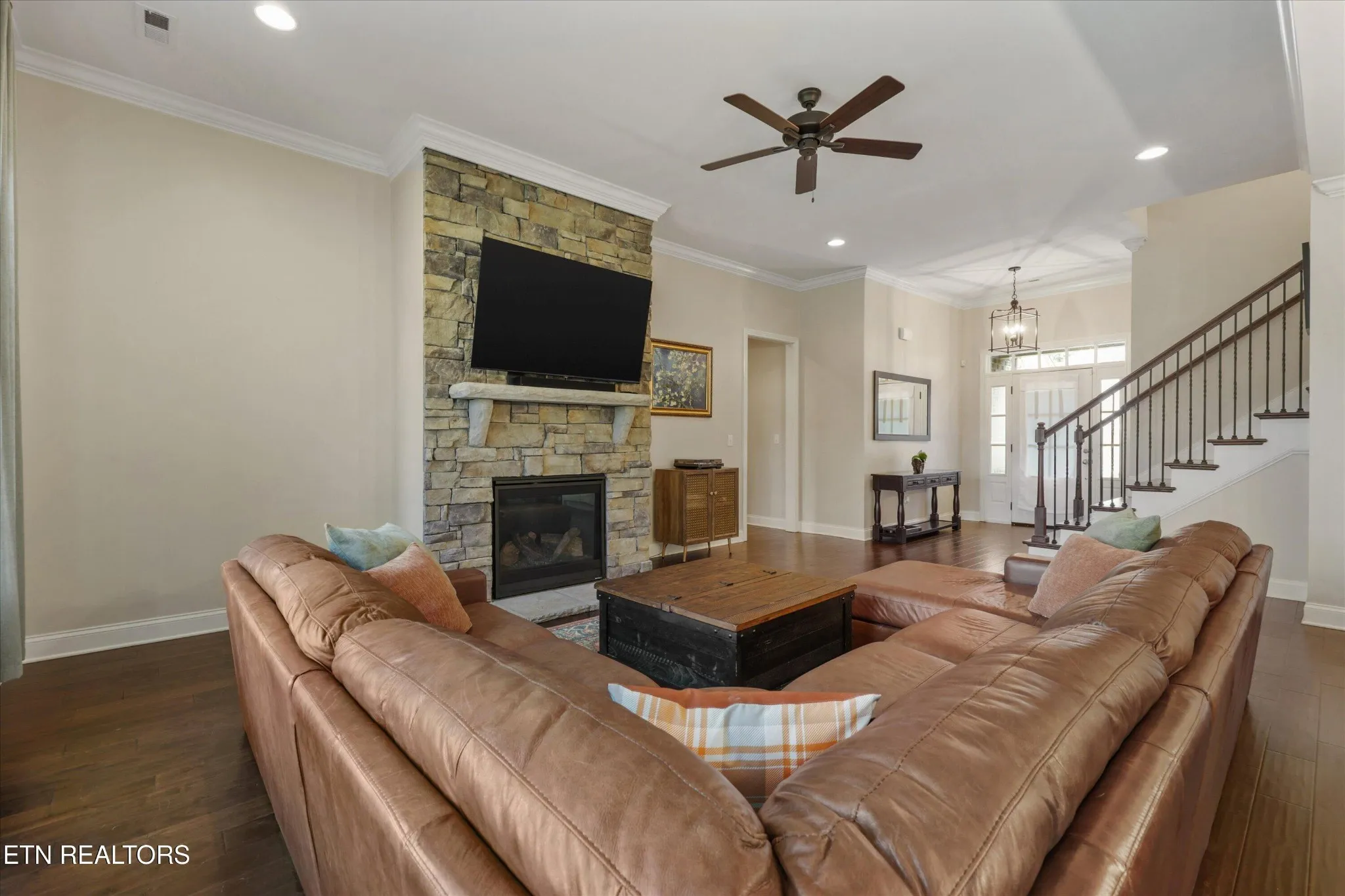 From the moment you step inside, soaring ceilings and beautifully appointed finishes create an immediate sense of openness and warmth. The main living space unfolds in a seamless open-concept design, where rich hardwood floors and detailed moldings complement a striking stone fireplace, the natural focal point of the expansive great room. Ten-foot ceilings enhance the airy atmosphere, while large windows frame tranquil views and invite soft daylight to fill the home.