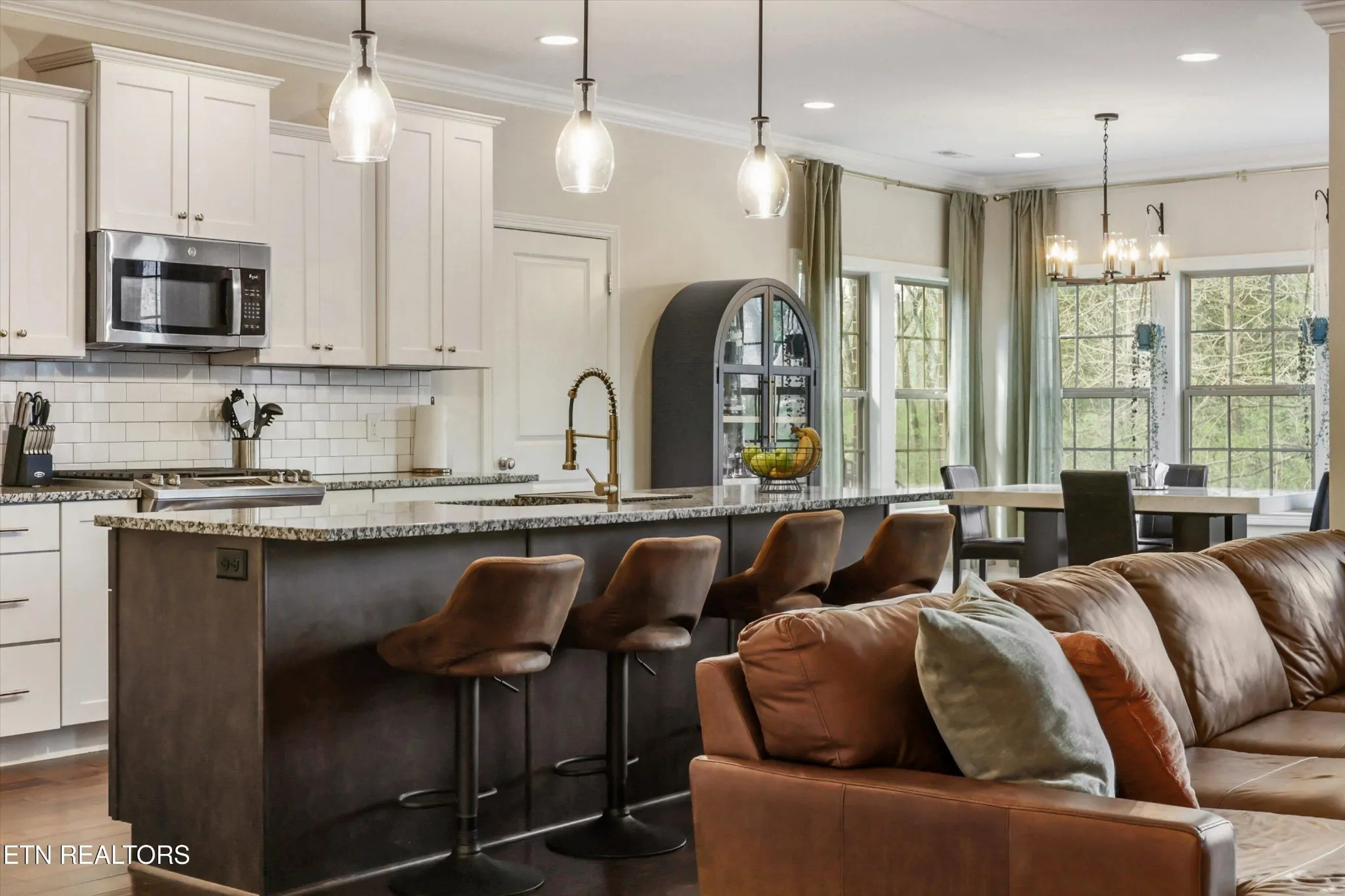 At the heart of the residence, the bright and welcoming kitchen has been crafted with both style and practicality in mind. Granite countertops, stainless steel appliances, a classic tile backsplash, and under-cabinet lighting create a sophisticated culinary space that flows effortlessly into the casual dining area and great room, ideal for hosting gatherings or enjoying relaxed evenings at home.