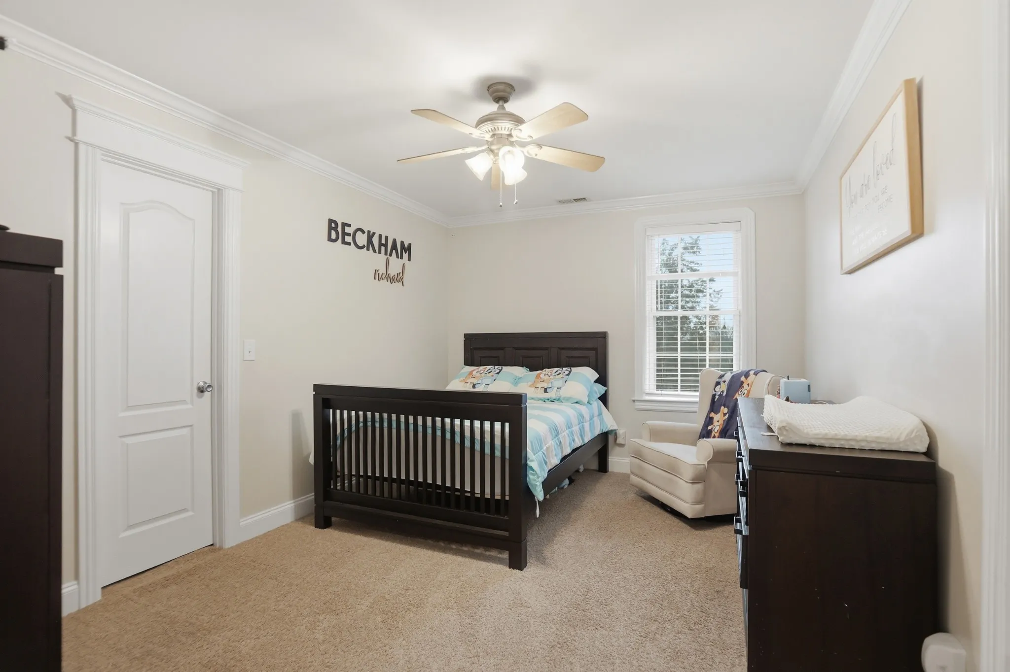 Just outside the suite, you’ll find a spacious bonus room with built-in shelving that can easily serve as a second living area, playroom, or media room, offering incredible flexibility to fit your lifestyle.