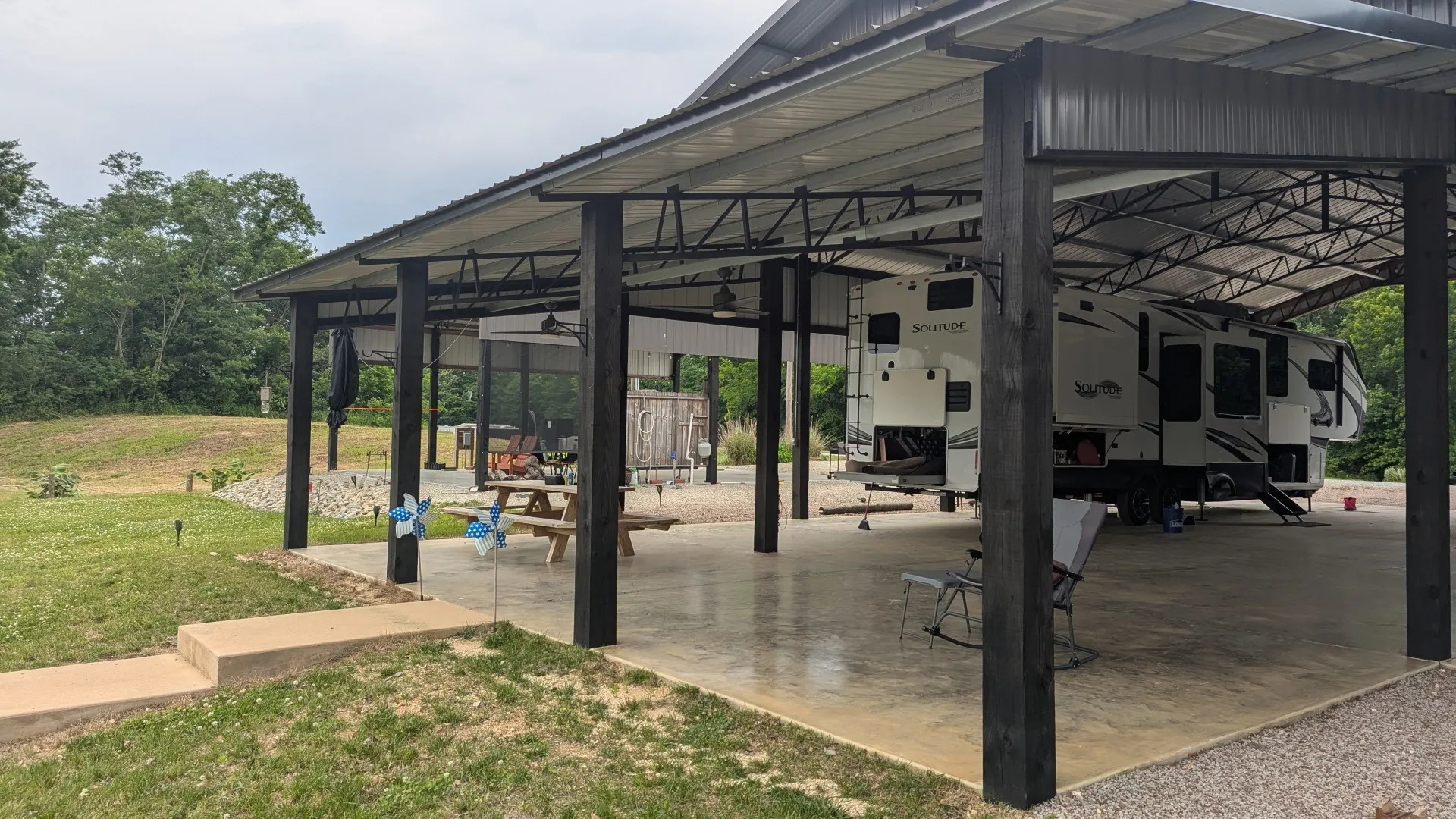 The A-lot features a massive, custom-built pavilion with 8×8 posts and an all-steel roof system, including steel trusses and purlins for unmatched durability. The structure offers expansive covered space, including a 34′ x 60′ main roof, 12′ x 60′ lean-to along the side, and a 14′ x 34′ gabled lean-to facing the lake—perfect for outdoor living, entertaining, or full-time RV use. A large finished concrete pad easily accommodates your RV, with room to spread out and take in the view. There is Fiber Internet and full hookups on both sides of the pavilion to bring in a second RV for friends.