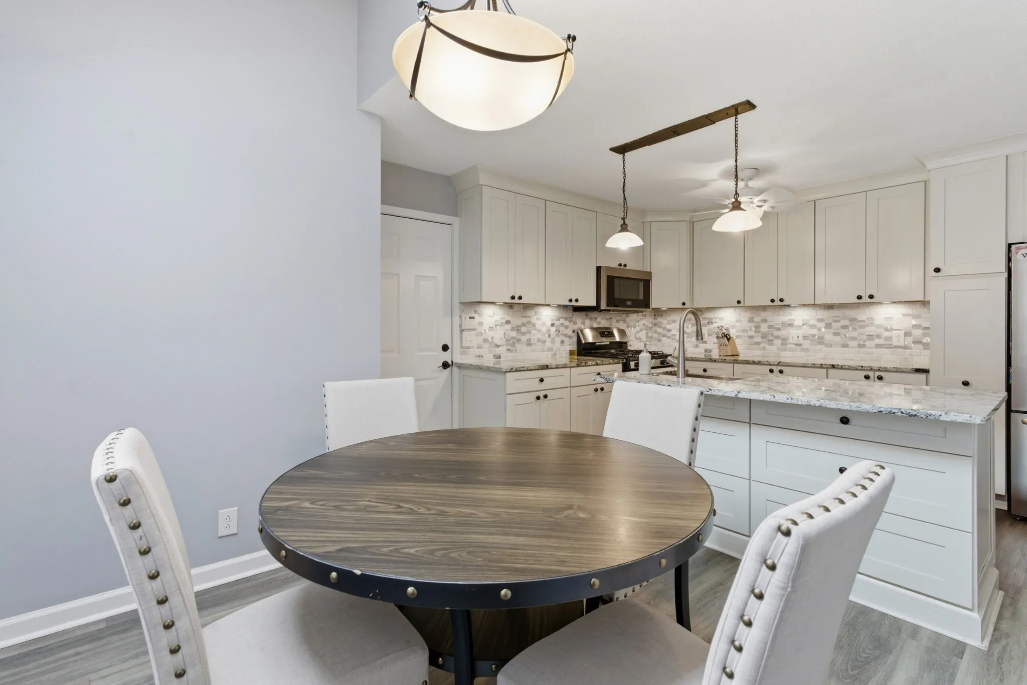 •Updated kitchen and breakfast area with skylights with lots of light. The kitchen opens to the attached two-car garage.