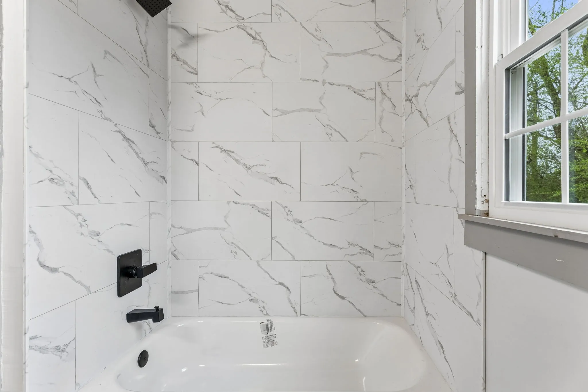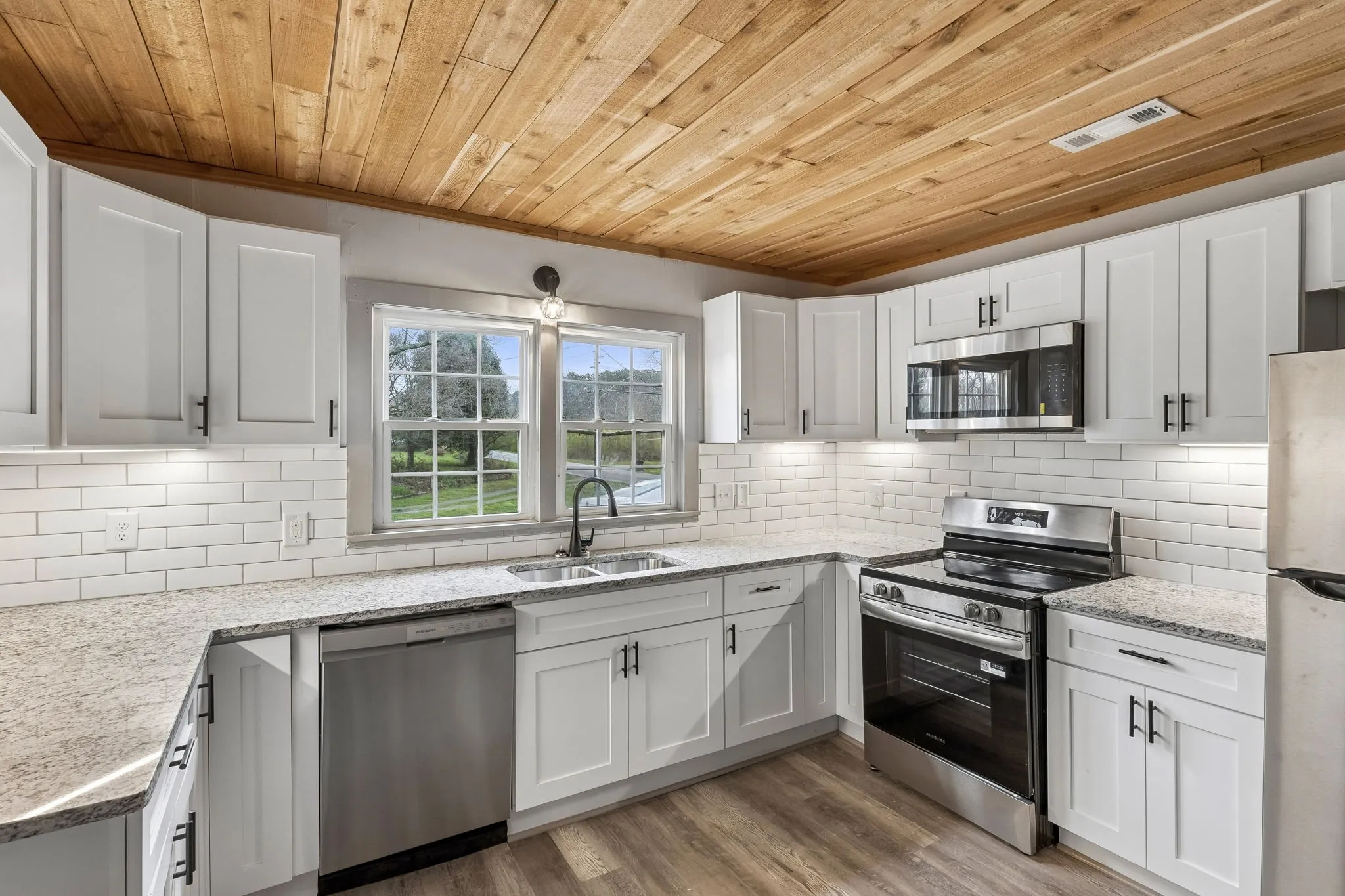 The fully updated kitchen is designed with both style and functionality in mind. It features white shaker-style cabinets, granite-style countertops, subway tile backsplash, stainless steel appliances, and plenty of cabinet and counter space for cooking and storage. Large windows above the sink allow natural light to fill the room and provide pleasant views of the surrounding property.