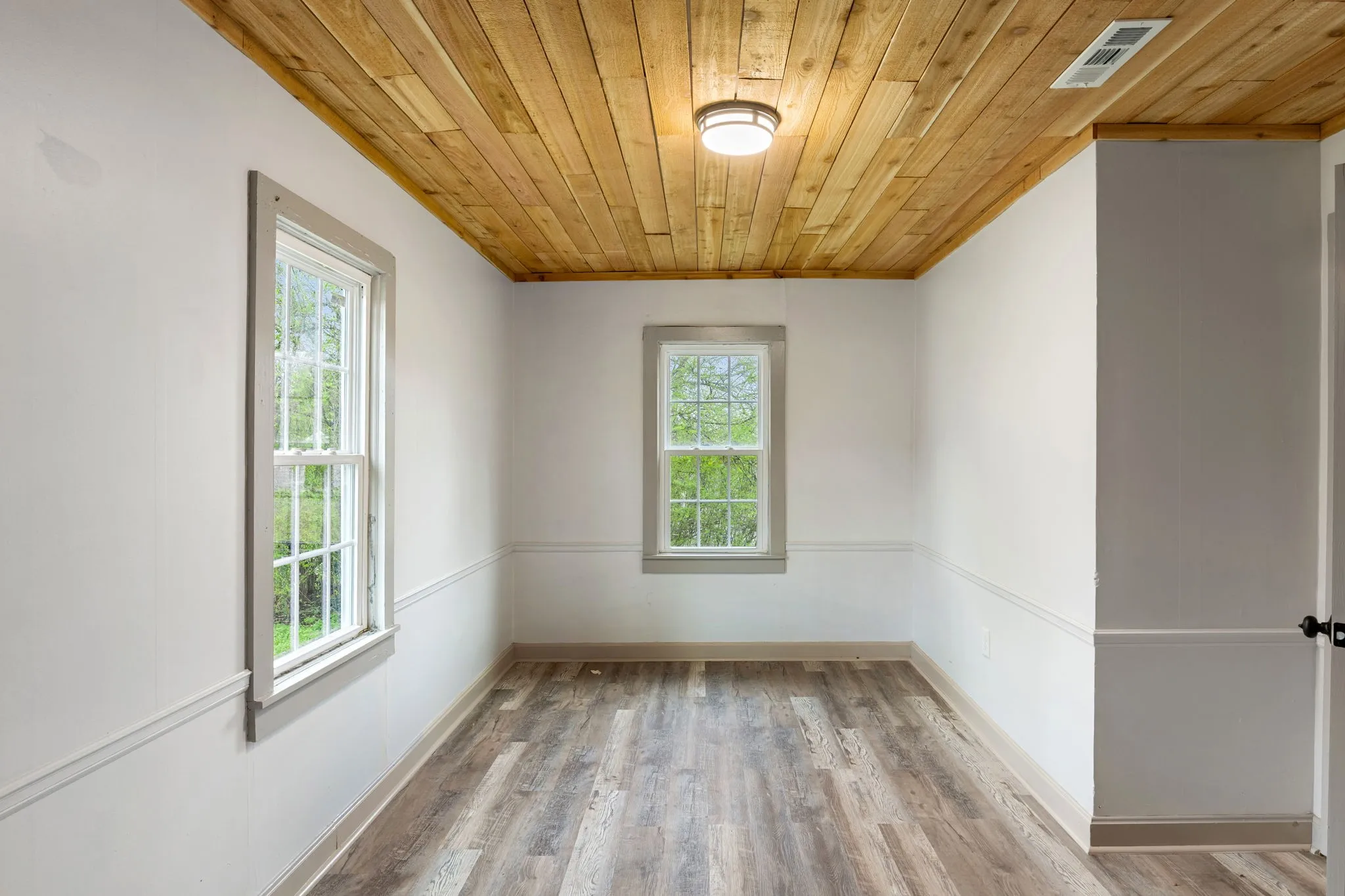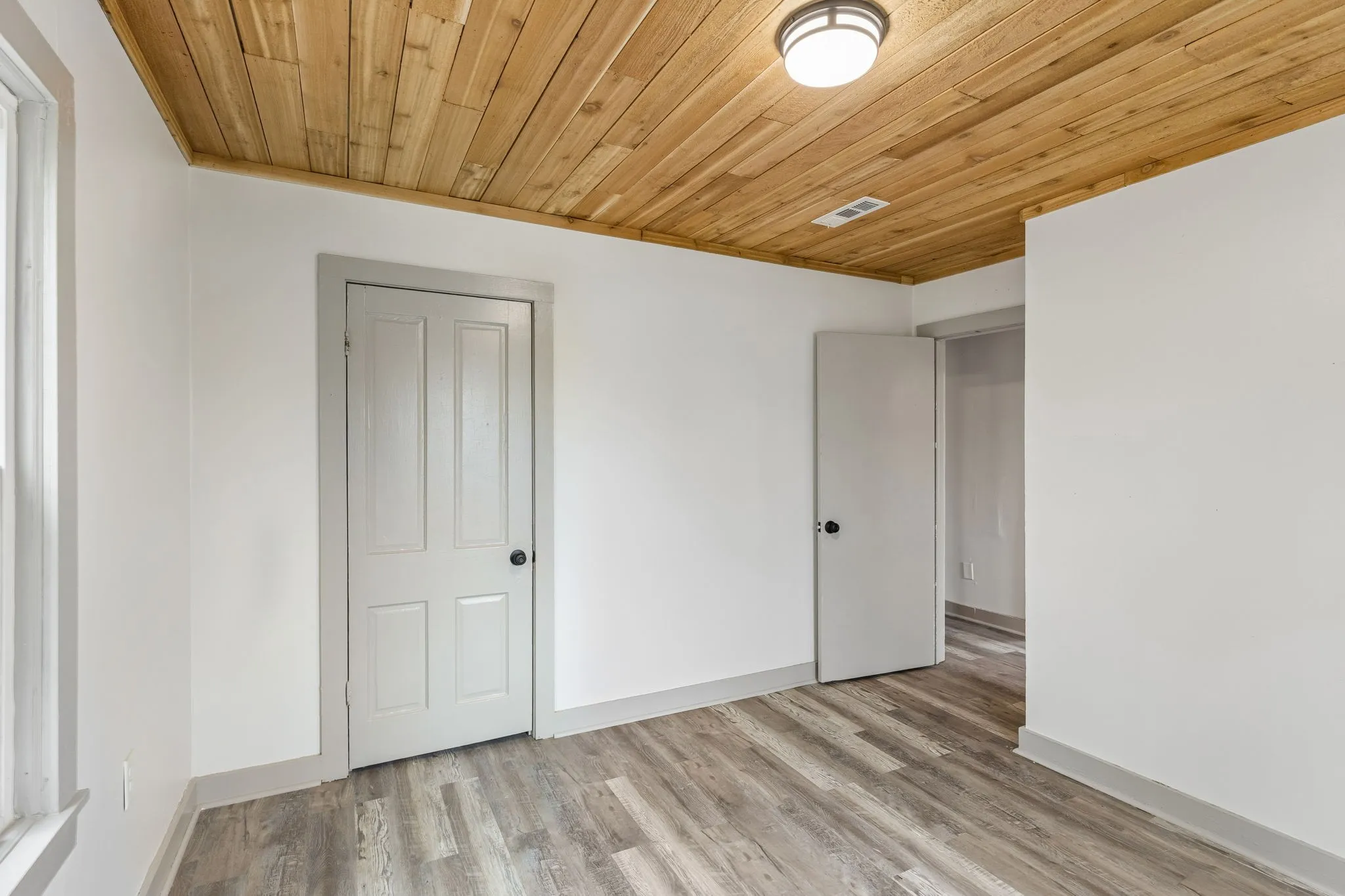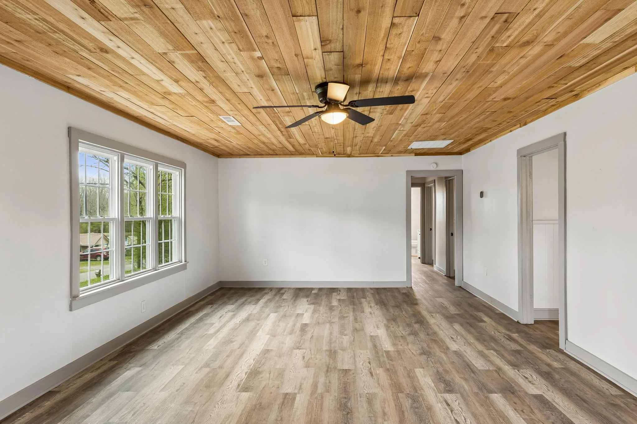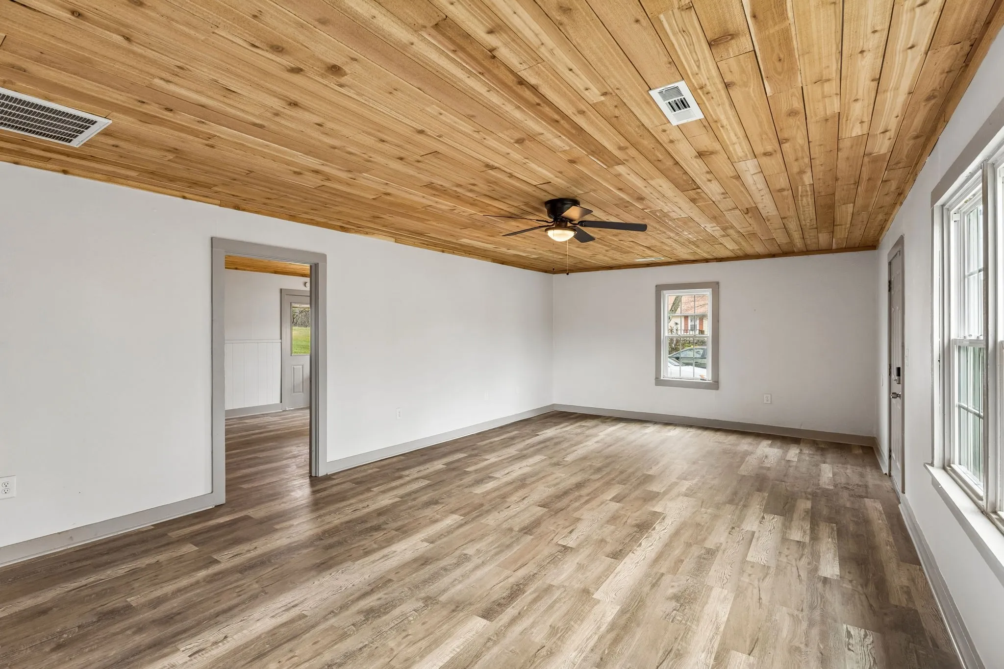 Step inside to a large, open living room featuring durable luxury vinyl plank flooring, abundant natural light, and a stunning natural wood plank ceiling that adds warmth and character throughout the space. The oversized living area offers plenty of room for relaxing, entertaining, or creating a comfortable gathering space.