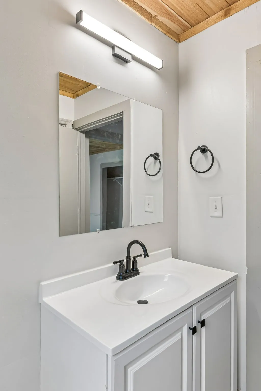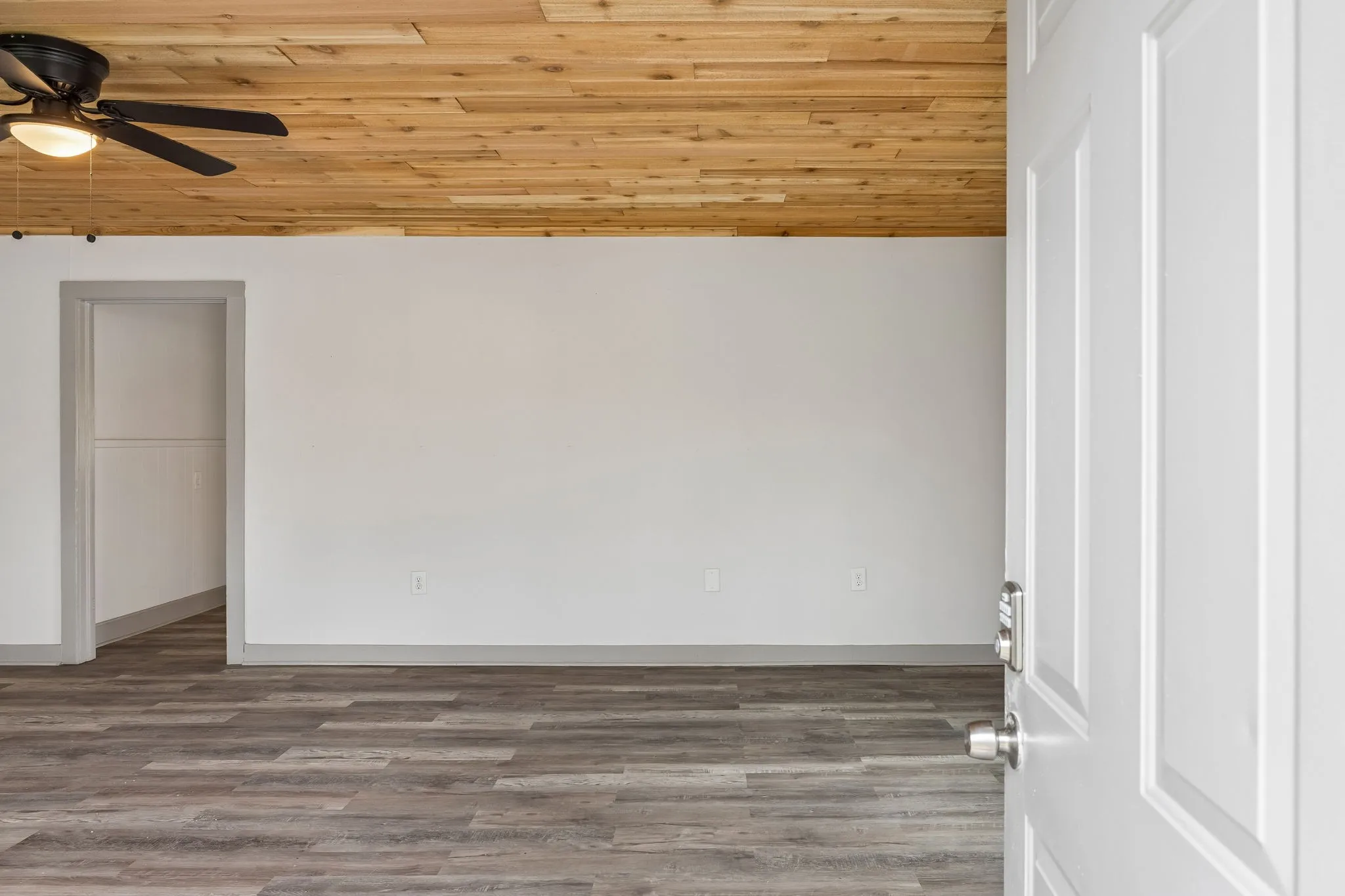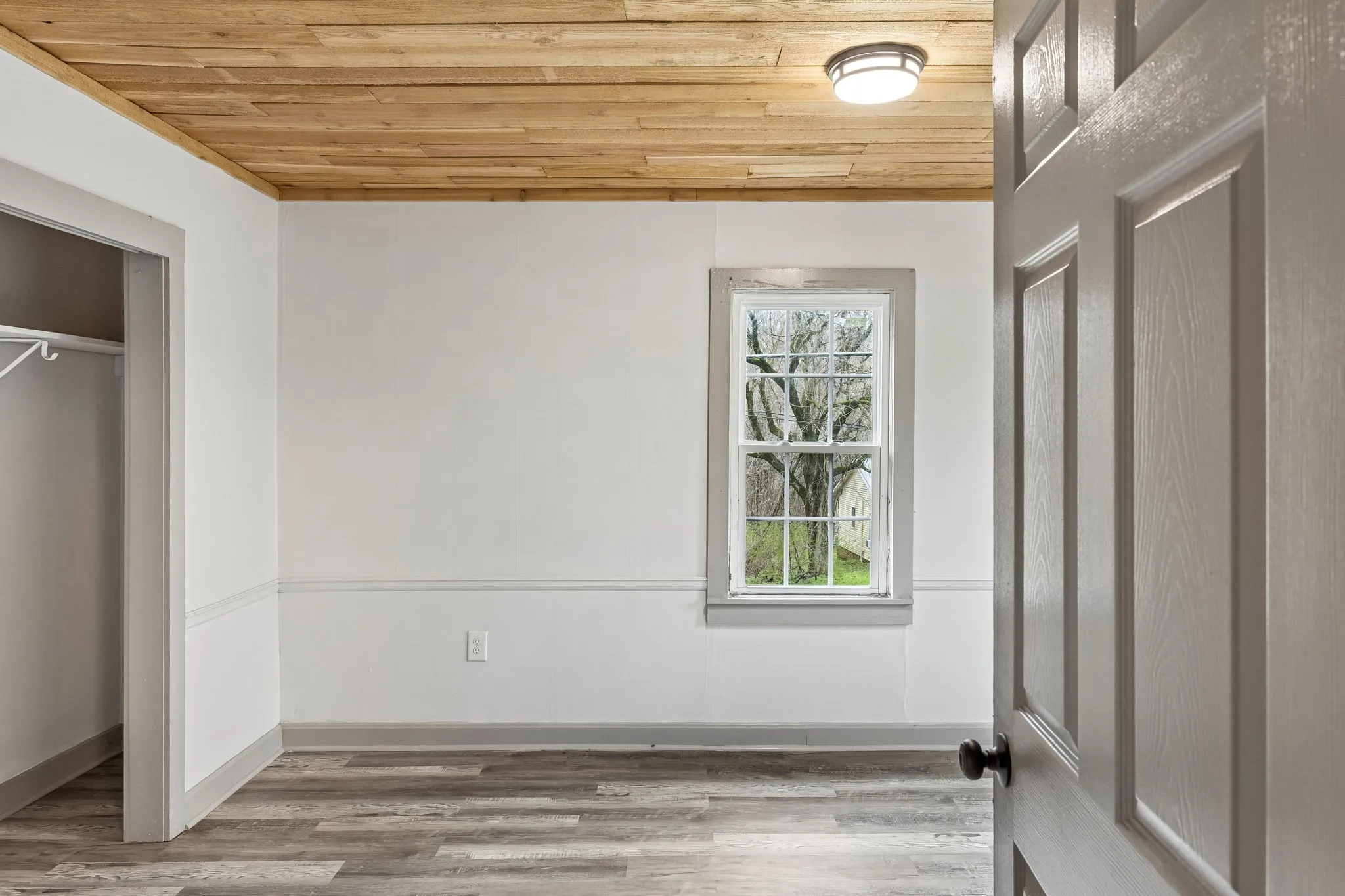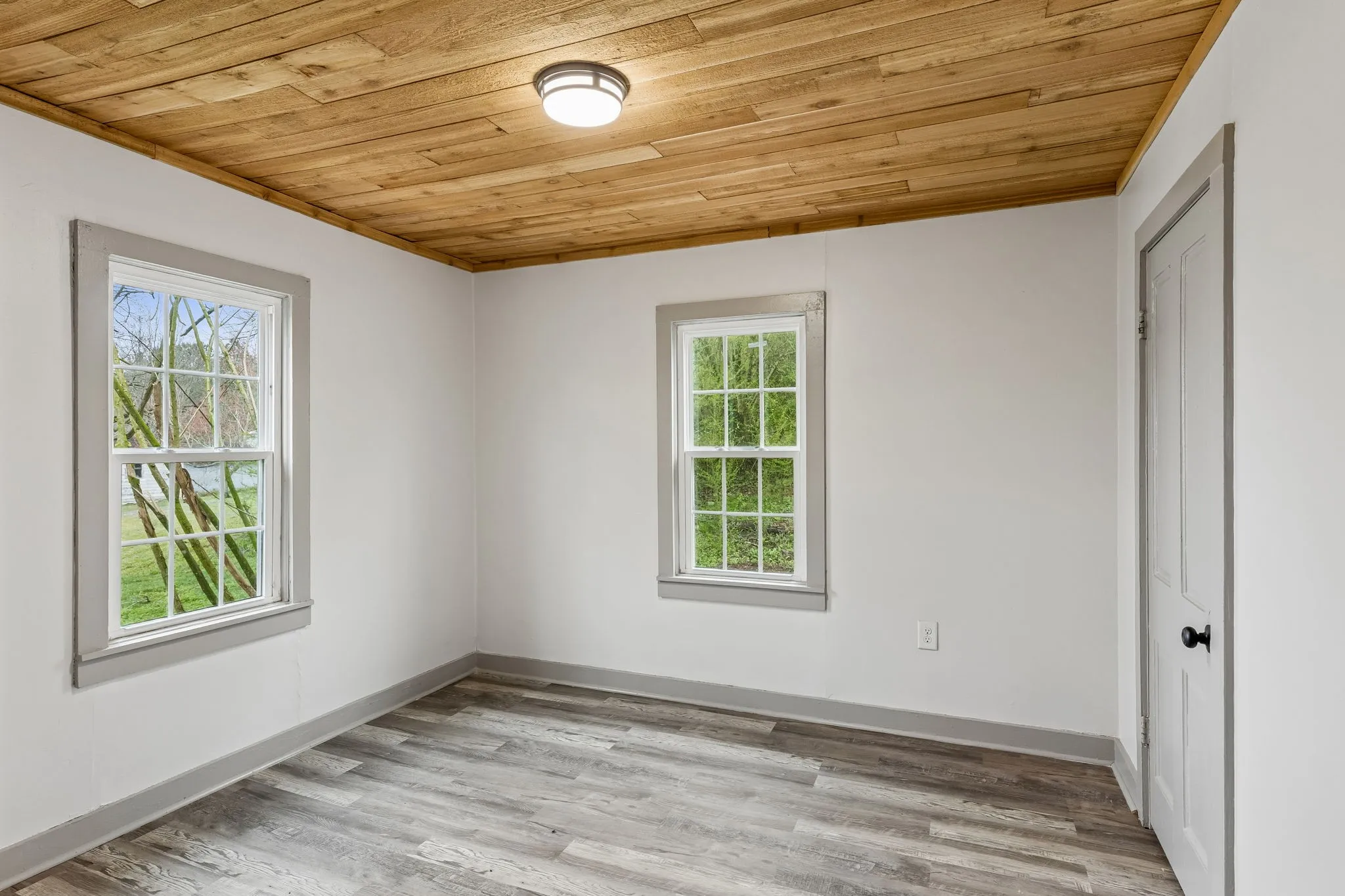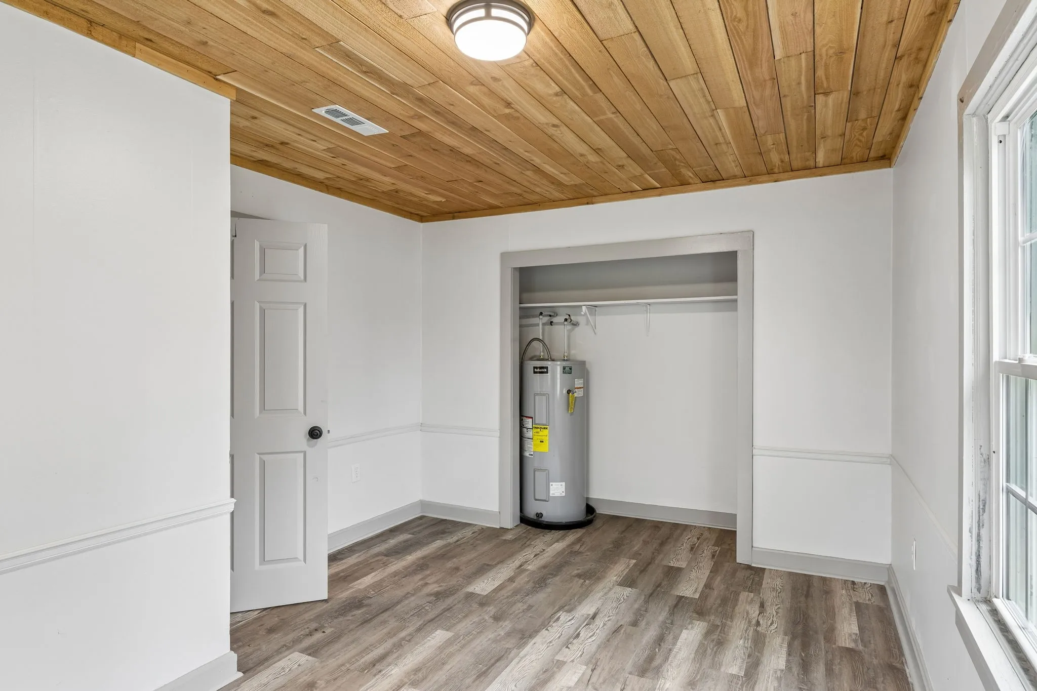 Step inside to a large, open living room featuring durable luxury vinyl plank flooring, abundant natural light, and a stunning natural wood plank ceiling that adds warmth and character throughout the space. The oversized living area offers plenty of room for relaxing, entertaining, or creating a comfortable gathering space.