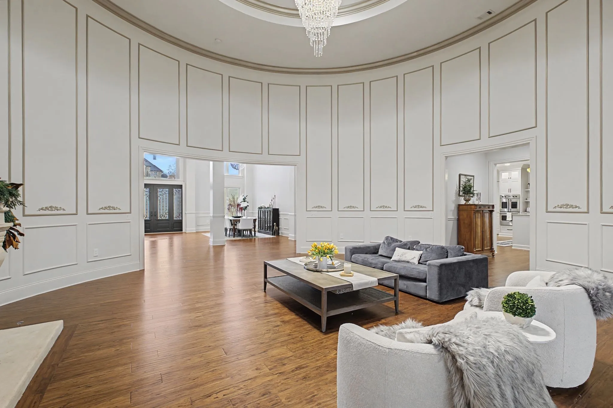 Set on over two acres in the rolling countryside of Arrington, this custom luxury estate blends grand architecture with warm, livable elegance. Designed with a combination of the European Baroque style with a blend of American traditional, creating a unique atmosphere of simple elegance with grace. The moment you enter, soaring ceilings, dramatic designer lighting, beautiful hardwood flooring, and handcrafted millwork create an unforgettable first impression, while a stunning round, ballroom-inspired living room anchors the home with curated finishes. At the heart of the home, the chef’s kitchen is a showpiece built for effortless hosting, featuring double islands, dual sinks, a wet bar, walk-in serving and storage pantries and a full suite of professional-grade Viking appliances. Flowing seamlessly into a coffered-ceiling family room with stone fireplace creates the perfect gathering space. The main-level primary wing is a private retreat designed for total relaxation complete with spa-inspired bath showcasing a walk-through shower, dual vanities, private twin toilets, expansive walk-in closets, and a dedicated laundry. A light-filled sitting room with fireplace and built-in office is the perfect at home workspace. Every guest bedroom is en-suite, offering comfort for family and visitors alike. Outside, an expansive covered patio with fireplace and multiple TV stations extends the living space into a true outdoor oasis, ideal for year-round entertaining and quiet evenings overlooking the peaceful acreage. Just a short walk to Arrington Elementary and minutes from Arrington Vineyards, Franklin, and Nashville, this home offers the rare combination of luxury, space, and convenience.
